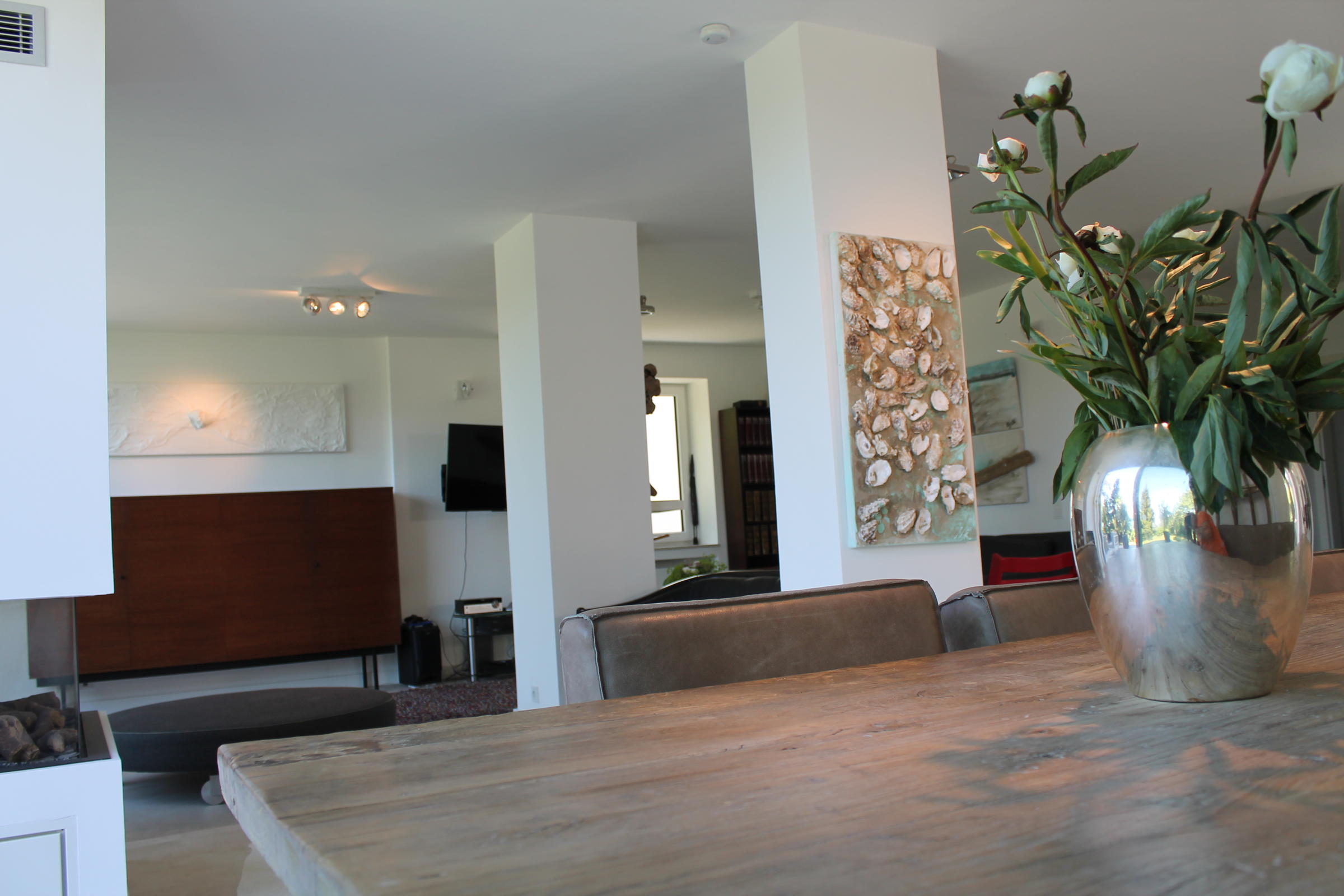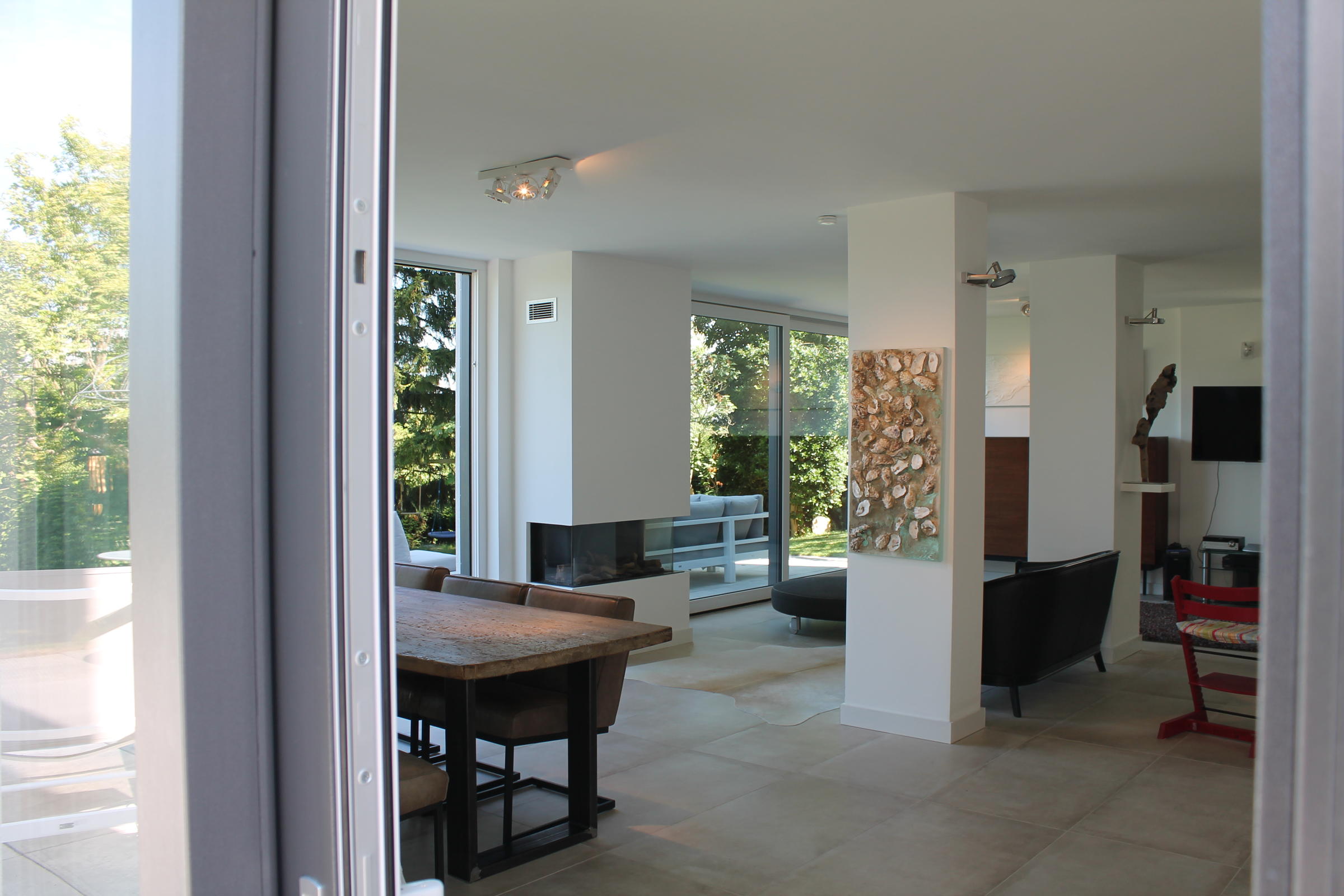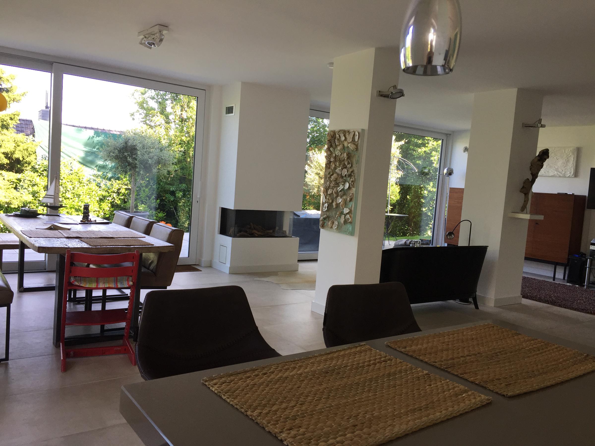 Das edel gestaltete Haus hat einen offenen Wohn-, Küchen- und Essbereich von 90 m² Größe mit Gaskamin. Durch bodentiefe Fenster (Hebe-Schiebeanlagen) kommt man von dort aus auf alle Terrassen und in den Garten. Das freistehende, nach Süden und Westen ausgerichtete Haus ist rundum von Terrassen und Garten umgeben. Das Grundstück liegt in direkter Nähe zu Wald, Pferden, Hochlandrindern und Schafen. Es ist nicht einsehbar und bietet weiten Fernblick.