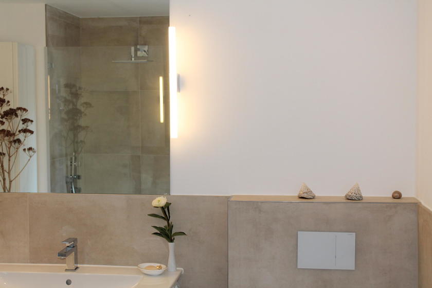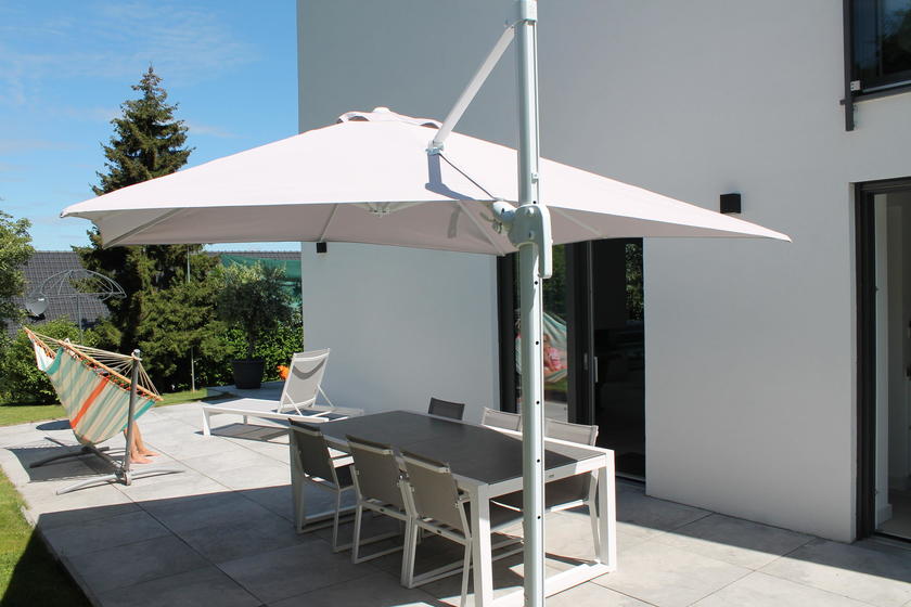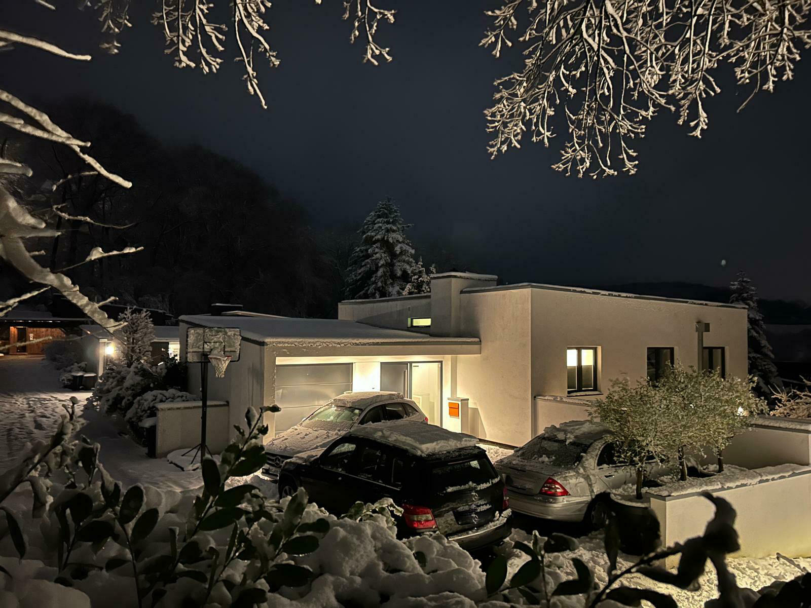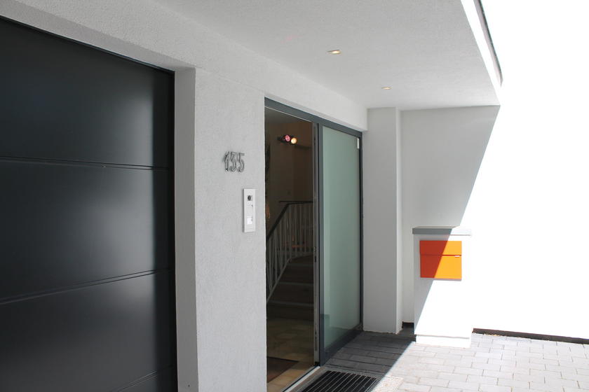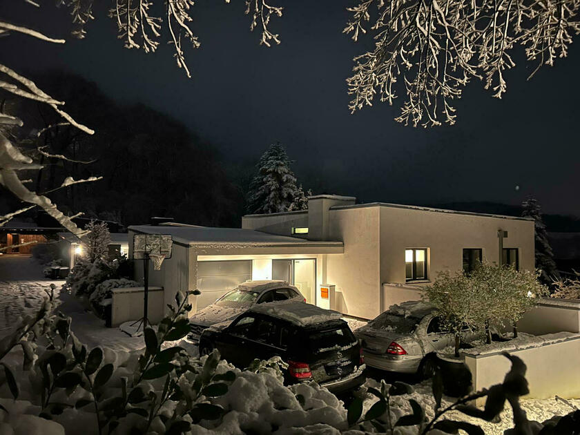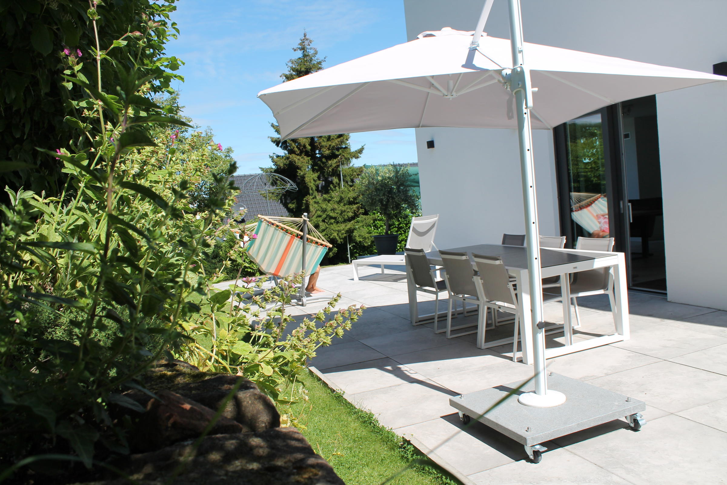 Bei starkem Sonnenschein kann das Haupthaus komplett mit elektrischen Plissees abgedunkelt werden. Parkplätze und eine Garage stehen direkt am Hauseingang zur Verfügung. Das freistehende Haus liegt in einer ruhigen Sackgasse.
