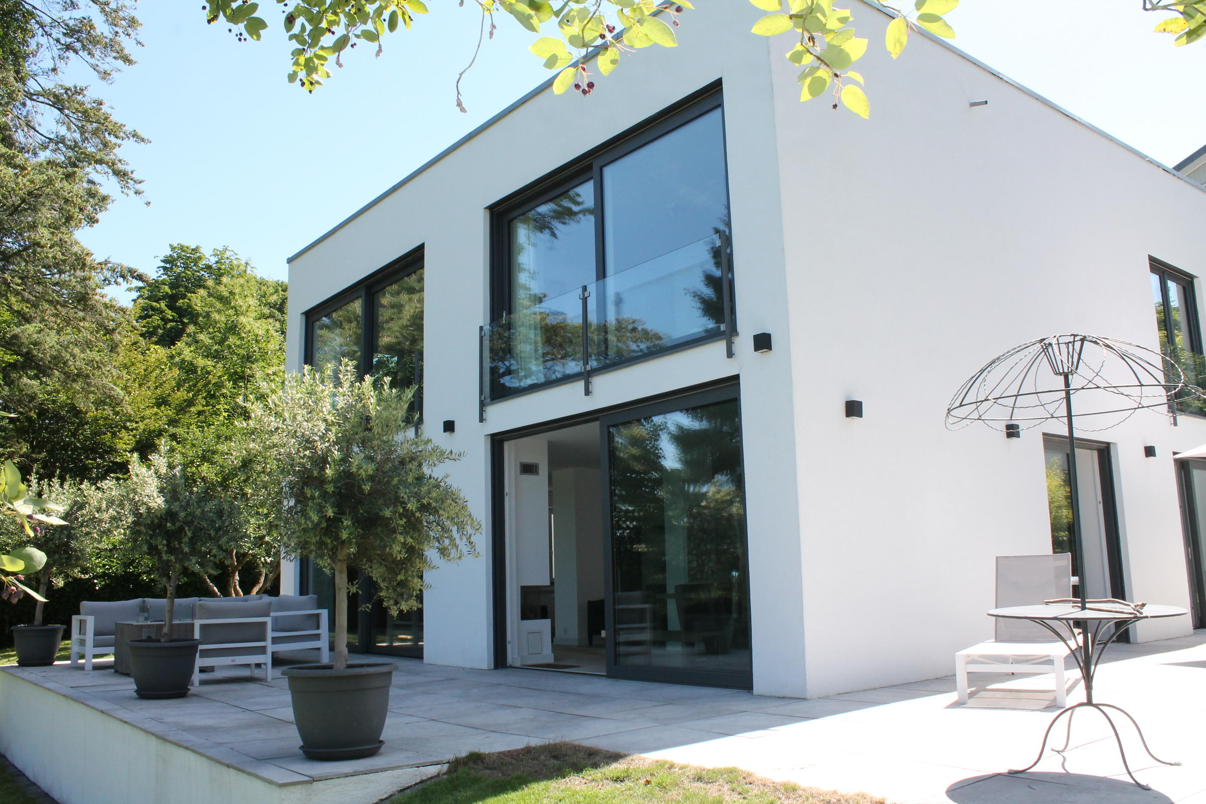 Diese exklusive 250 Quadratmeter große Villa im Bauhaus-Stil (zweistöckiger Flachbau) in Aachen bietet über eine komplette Fensterfront einen traumhaften Blick auf das benachbarte Naturschutzgebiet.
