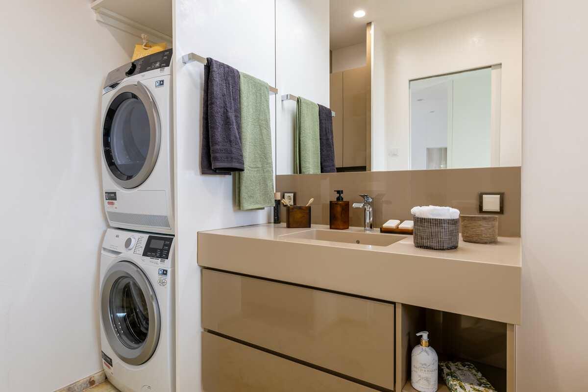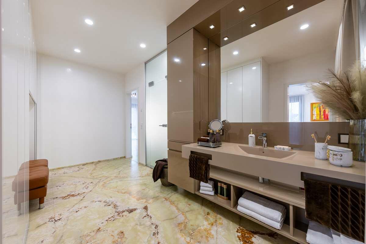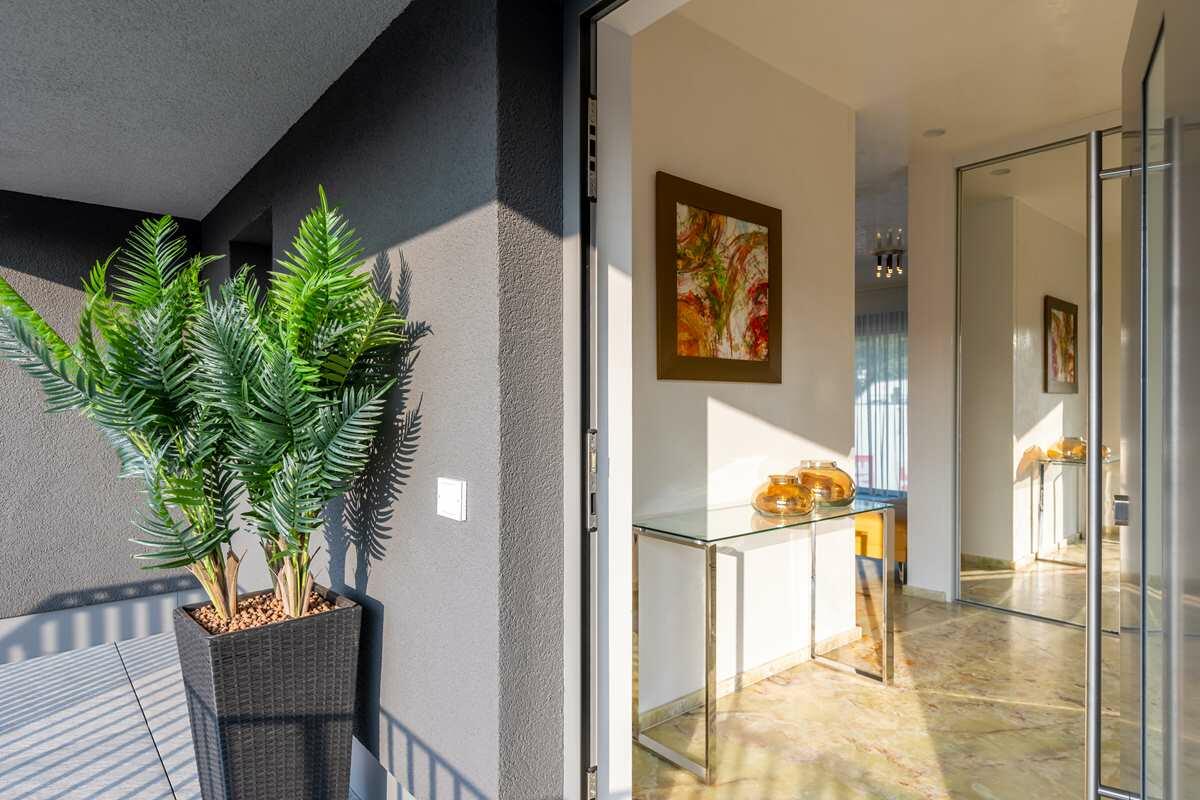 Die luxuriös eingerichtete 2-Zimmer Penthouse-Wohnung bietet 120 m² Innenfläche und eine 300 m² große Dachterrasse. Die Wohnung befindet sich im obersten Stock eines modernen Wohn- und Geschäftshauses und ist mit einem Aufzug erreichbar. Die bodentiefen Fenster lassen viel Sonnenlicht in die Räume. Die großen Fensterfronten im Wohn- und Küchenbereich und im Schlafzimmer sind mit elektrischen Raffstores abdunkelbar. Die Böden sind mit italienischem Marmorboden und Parkett ausgelegt, die Innenwände und Decken mit glattem, weißen Marmorino verputzt. Die offene und modern ausgestattete Küche bietet einen kleinen Barbereich und schließt an den Wohnbereich an. Die nach Süden ausgerichtete Terrasse ist teilweise mit Markisen überdacht und nicht einsehbar. Die Terrasse bietet eine Außenküche, einen Jacuzzi sowie eine Sauna mit vollflächiger Glasfront und Outdoor-Dusche.