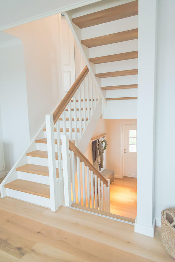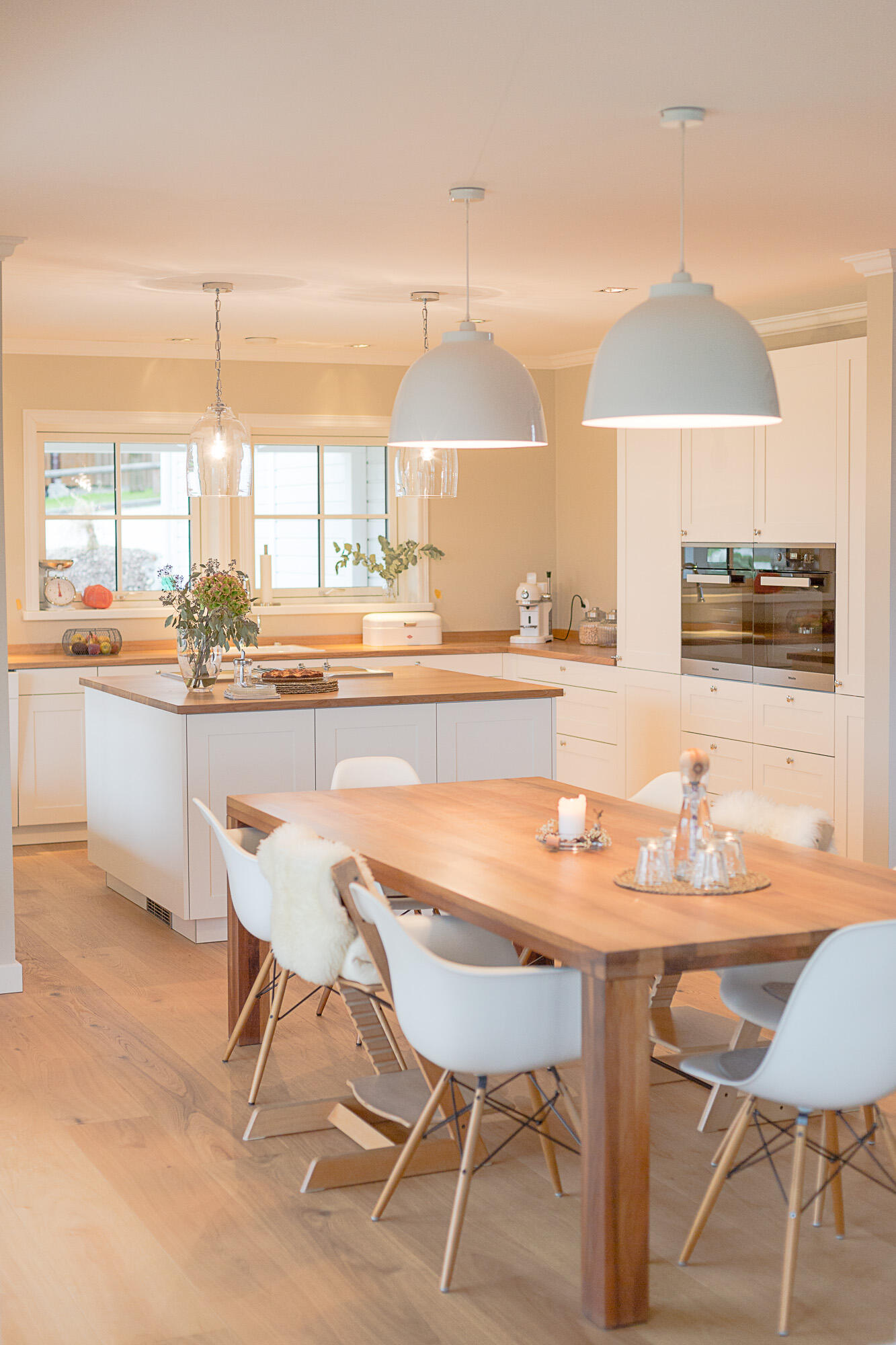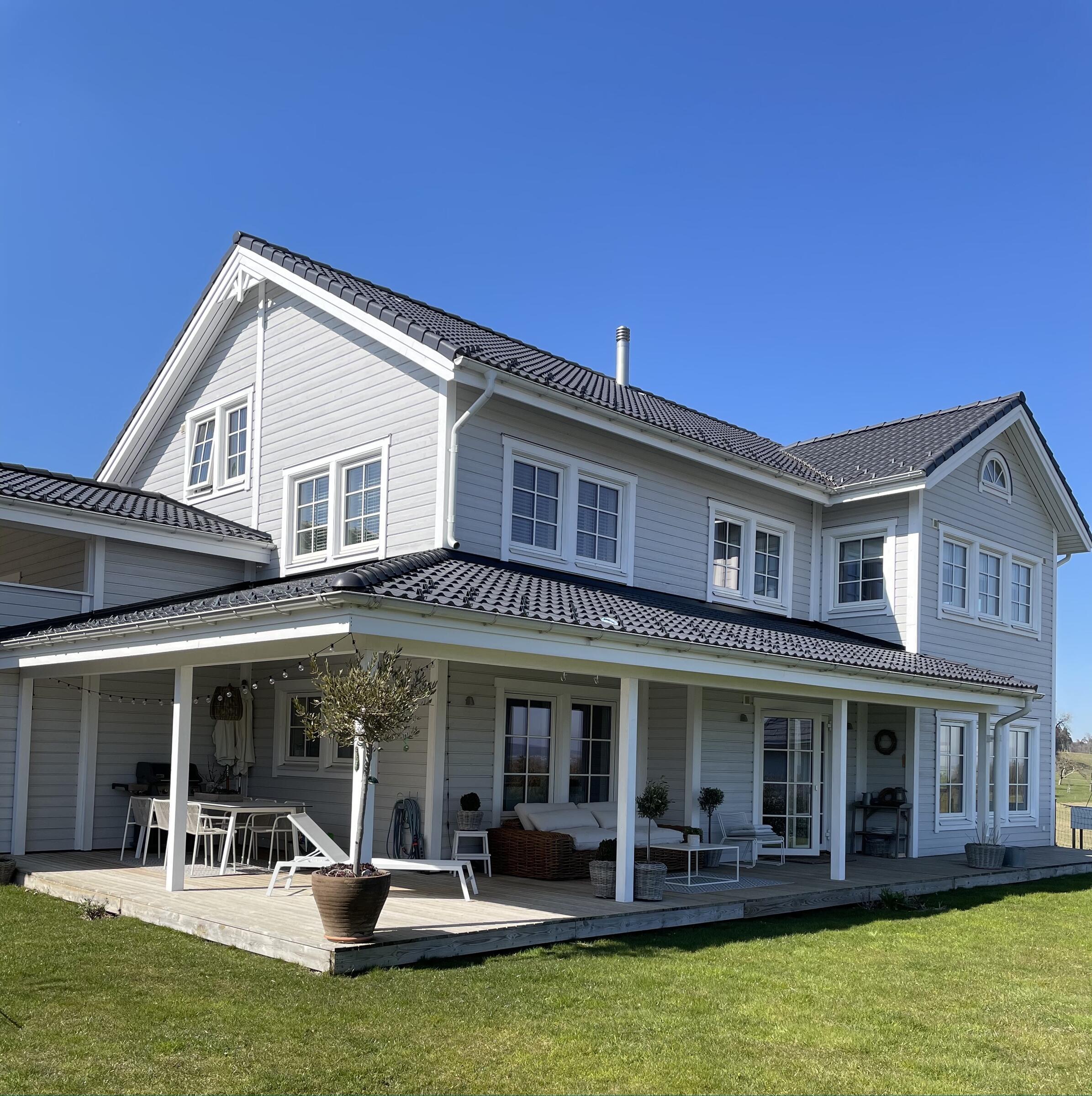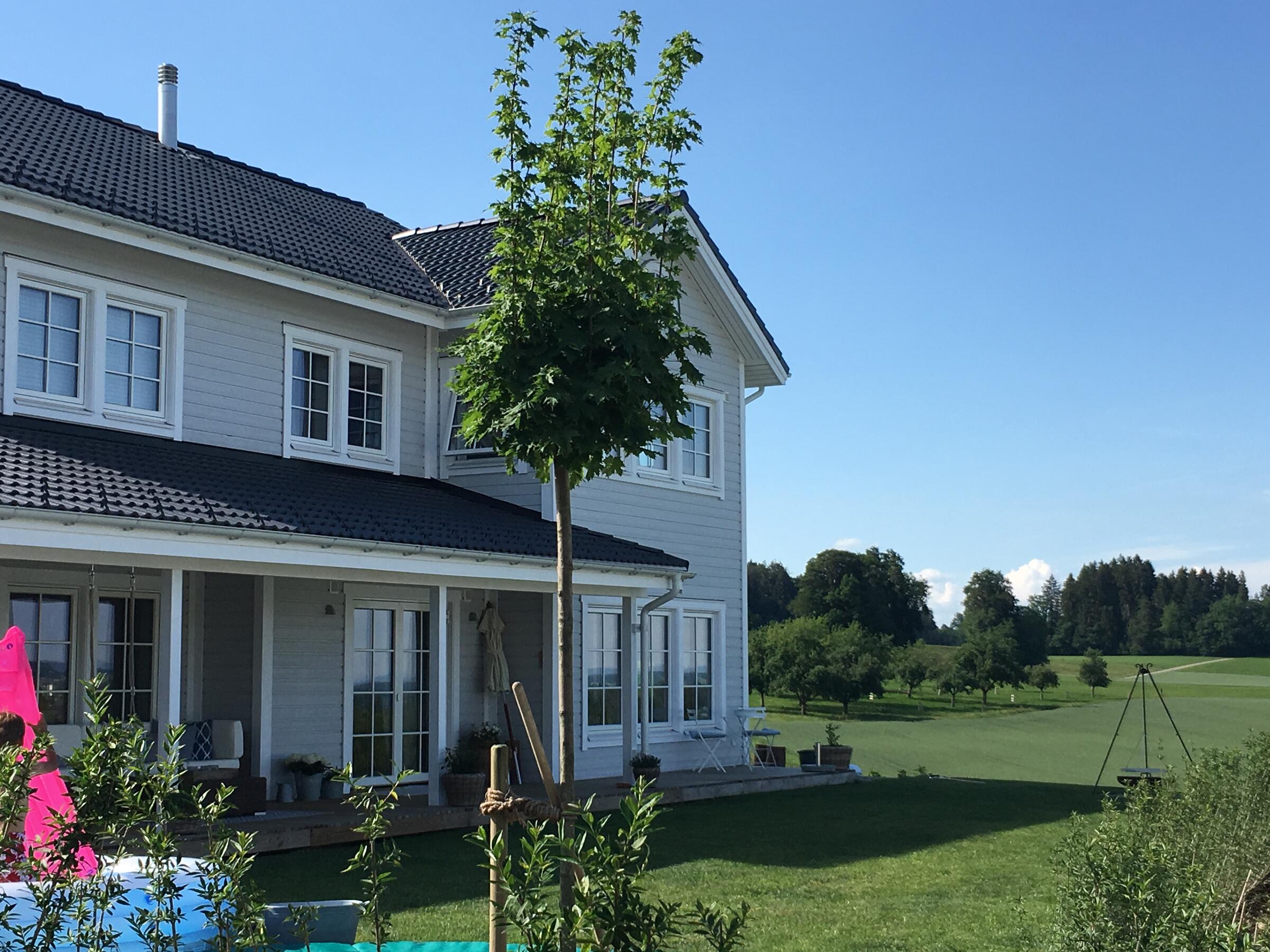 2017 wurde unser New England Haus erbaut und hat 180 m² Wohnfläche. Der englisch/skandinavische Stil zieht sich durch alle Zimmer. Alle Räume verfügen über ein Eichenparkett, außer dem Hauswirtschaftsraum, dieser ist mit weiss blauen Fliessen versehen. Eine Besonderheit ist die Farbwahl von Farrow & Ball, da jeder Raum eine eigene Farbe hat und doch harmonieren sie alle miteinander. Das Haus hat 33 schwedische Fenster wodurch es besonders hell ist. Die Landwirtschaftszone macht den Ausblick einzigartig. Das Haus verfügt über eine grosse Porch mit Holzterrasse, die es ermöglicht, sich auch bei schlechtem Wetter draussen aufzuhalten.