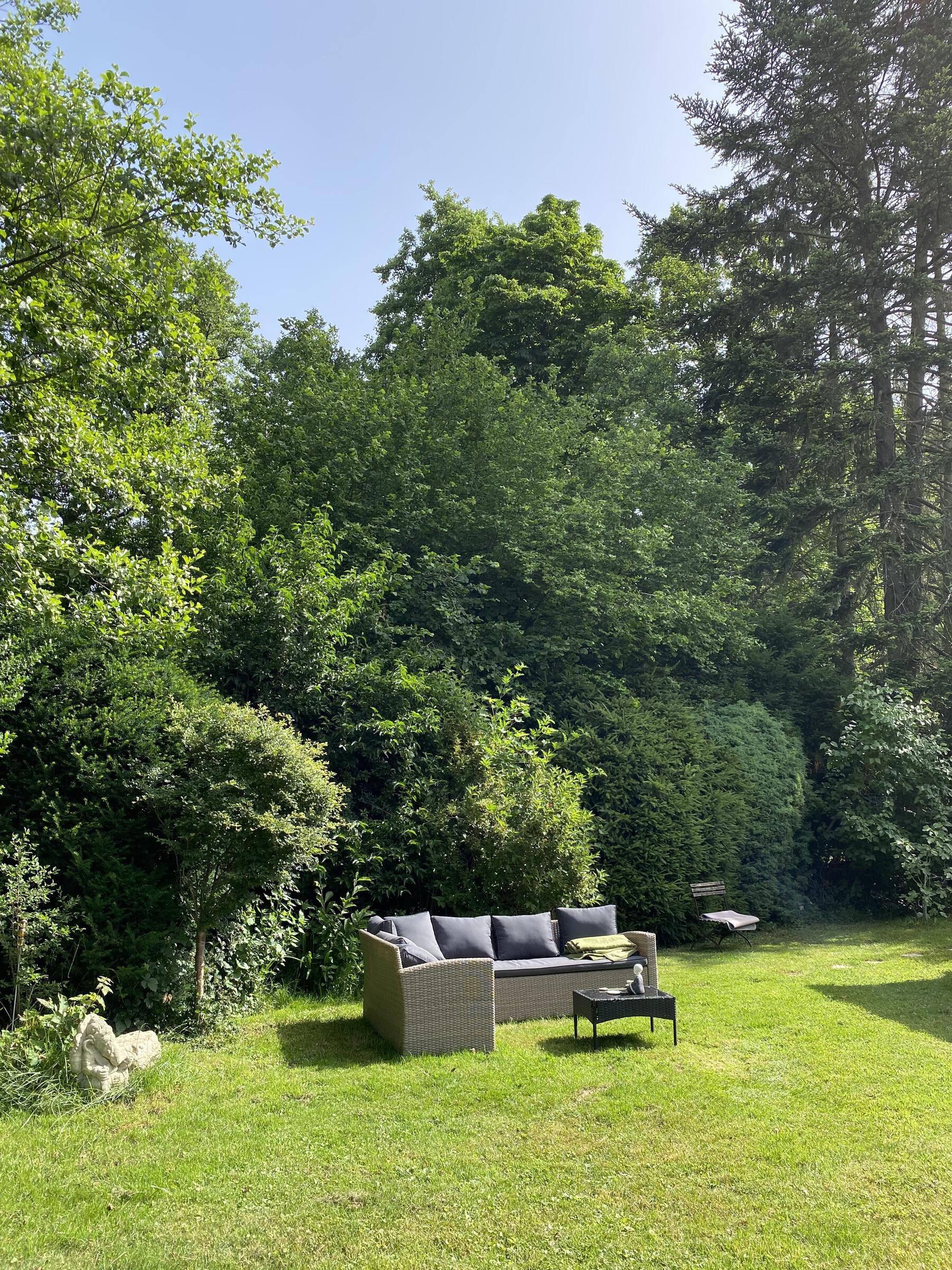 Unser freistehendes Haus befindet sich direkt am Ende eines Kreisverkehrs an einem Wald- und Naherholungsgebiet in Refrath. Im Wohnzimmer wurde Echtholzparkett verlegt. Das Wohnzimmer ist ebenfalls mit einem Kamin ausgestattet. Die Bäder sind gefliest. Sonnenlicht fällt in die Räume im Souterrain und im Obergeschoss bis Mittag und im Wohnzimmer ab dem Nachmittag. Die Fenster sind mit Jalousien und Vorhängen abdunkelbar. Im Außenbereich steht unser großer Garten zur Verfügung. An der Rückseite gibt es einen Bach. Parkplätze befinden sich auf unserem Grundstück und auf der Straße.