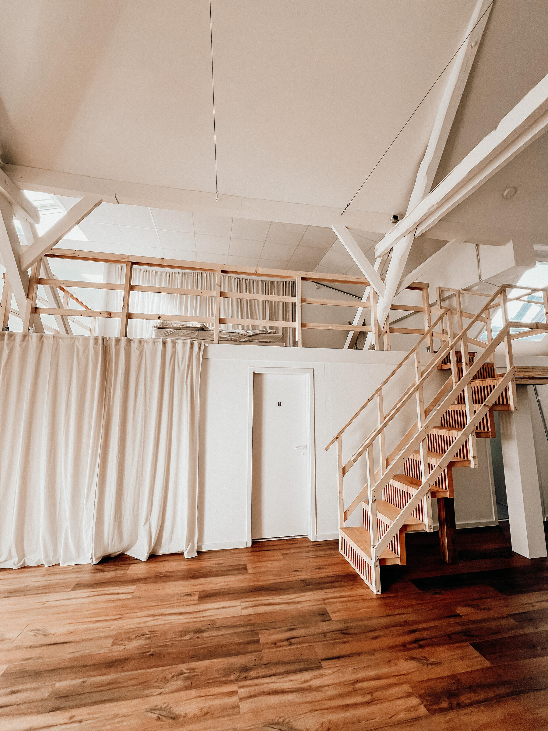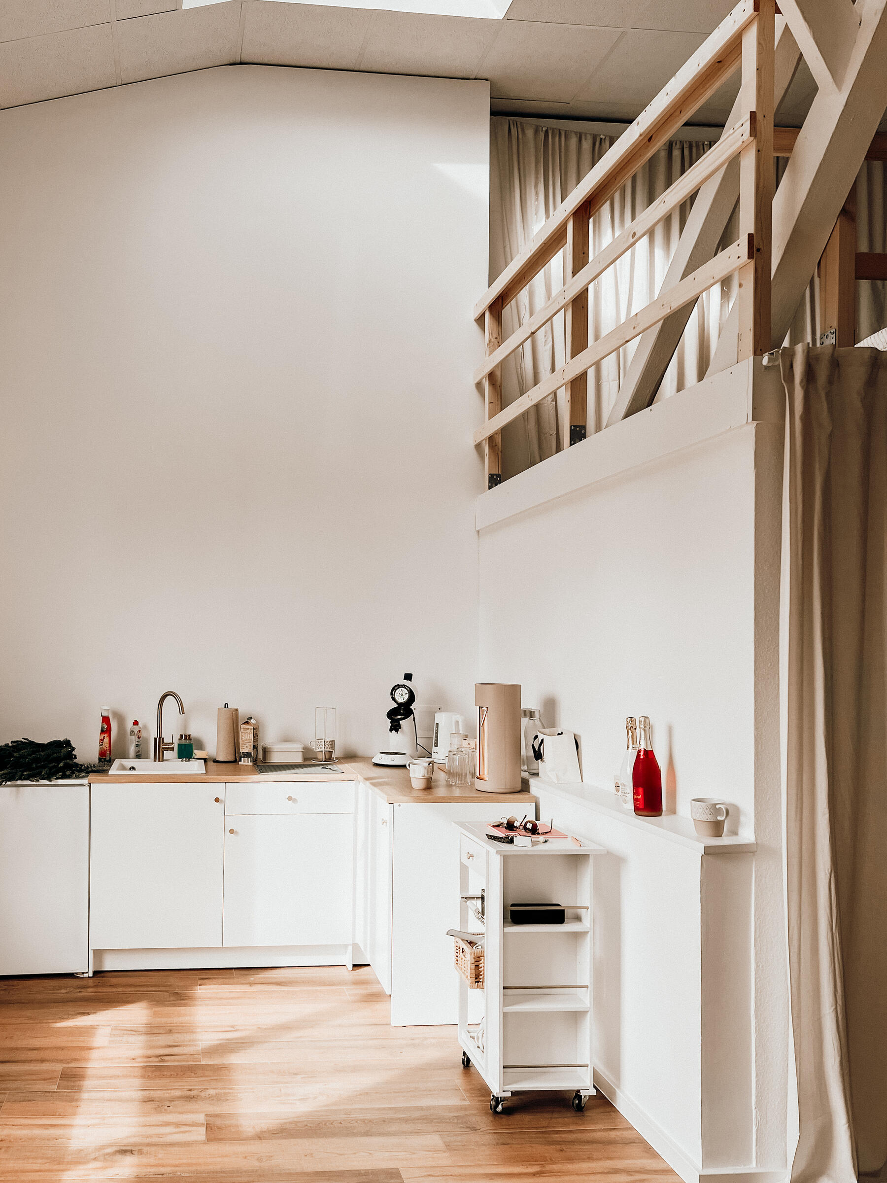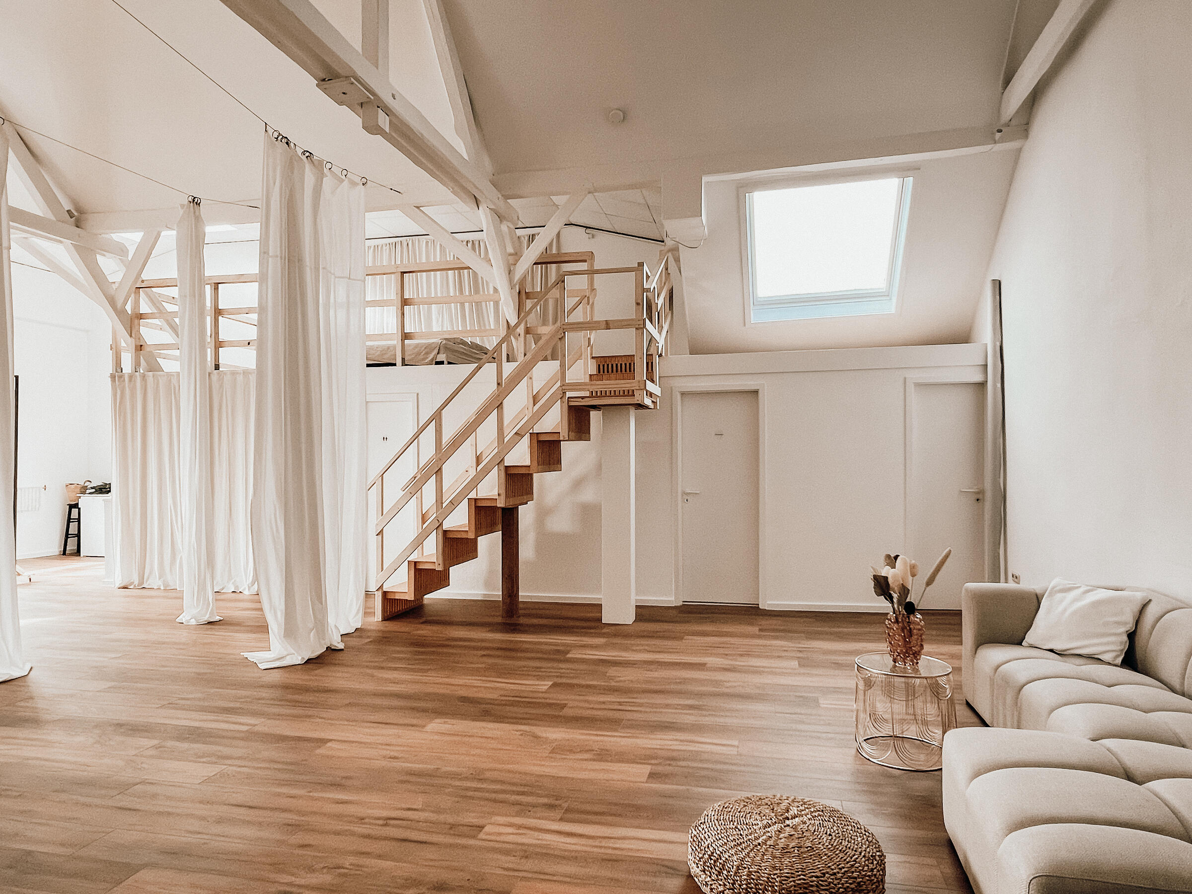 Das Tageslichtstudio befindet sich im ruhigen Dachgeschoss eines Wohnhauses und bietet eine große Studiofläche und eine Empore. Unser Studio ist minimalistisch mit einem Sofa, Sesseln und einem Bett, das sich auf der Empore befindet, möbliert. Die Küche ist ebenfalls sehr einfach und funktional eingerichtet. Der Boden des Studios ist mit braunem Vinyl-Boden ausgelegt. Das Fotohintergrundsystem und die großen Vorhänge können bei Bedarf abgenommen werden. Die Fenster sind nicht verdunkelbar. Parkplätze gibt es direkt vor dem Haus und auf dem Hinterhof, der nur mit Fahrzeugen bis max. 3,5 t befahren werden kann.