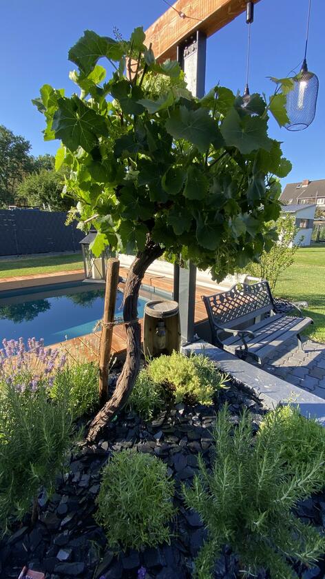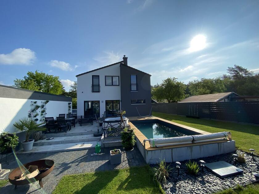 Im 900 m² grünen Garten gibt es diverse schöne Ecken. Die große Sonnenterrasse und der eingebaute Pool sind der Blickfang im Garten, der von viel grüner Wiese, einer großen modernen Doppelgarage, einem Schuppen, Spielhaus, Gewächshaus und einem kleinem Gemüsegarten umrandet wird.