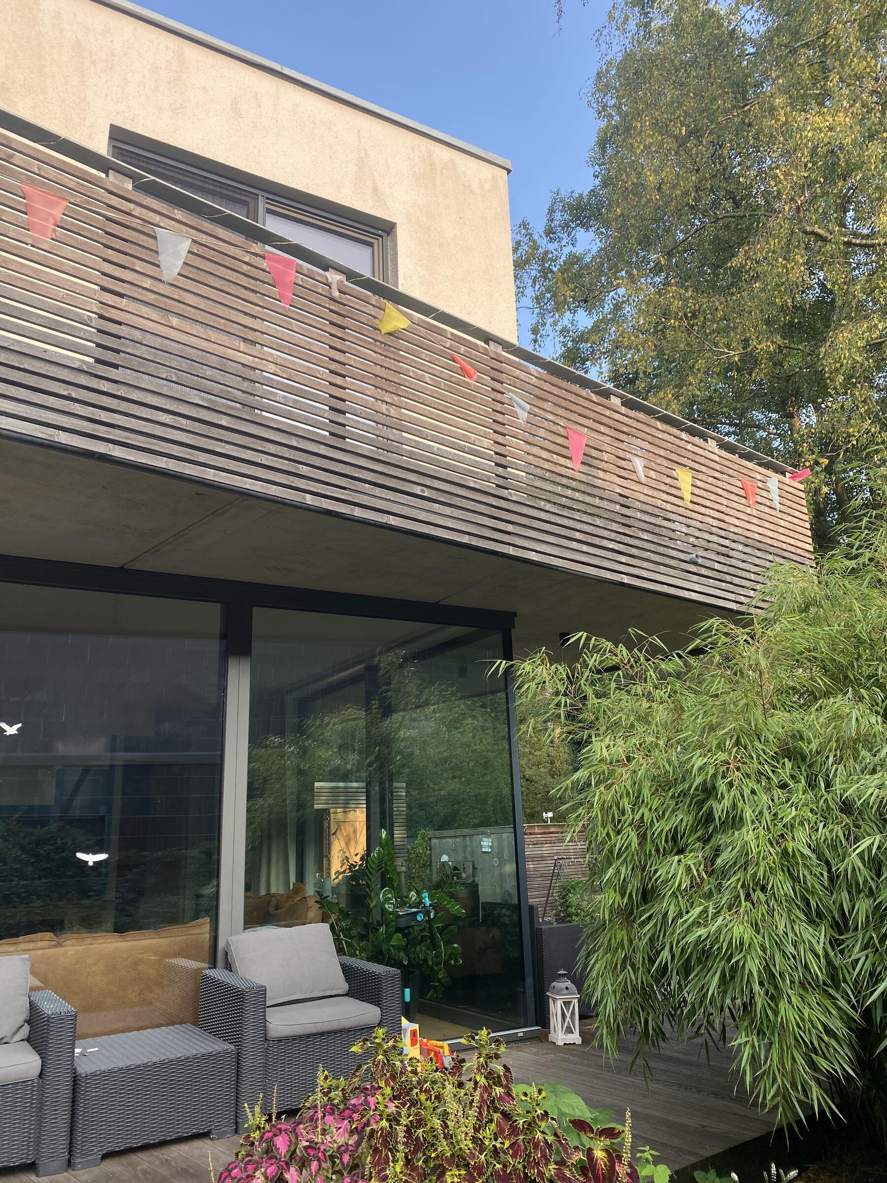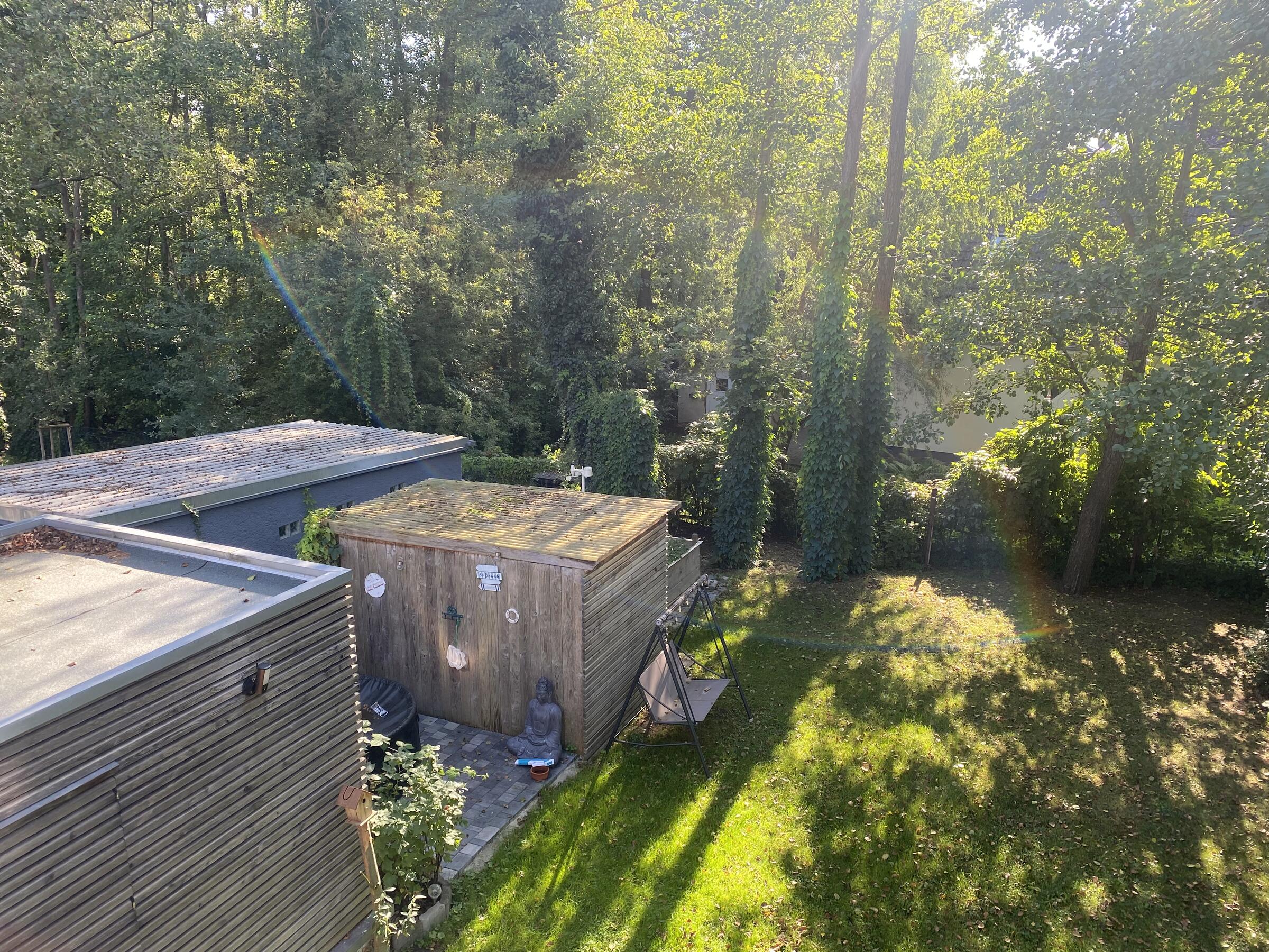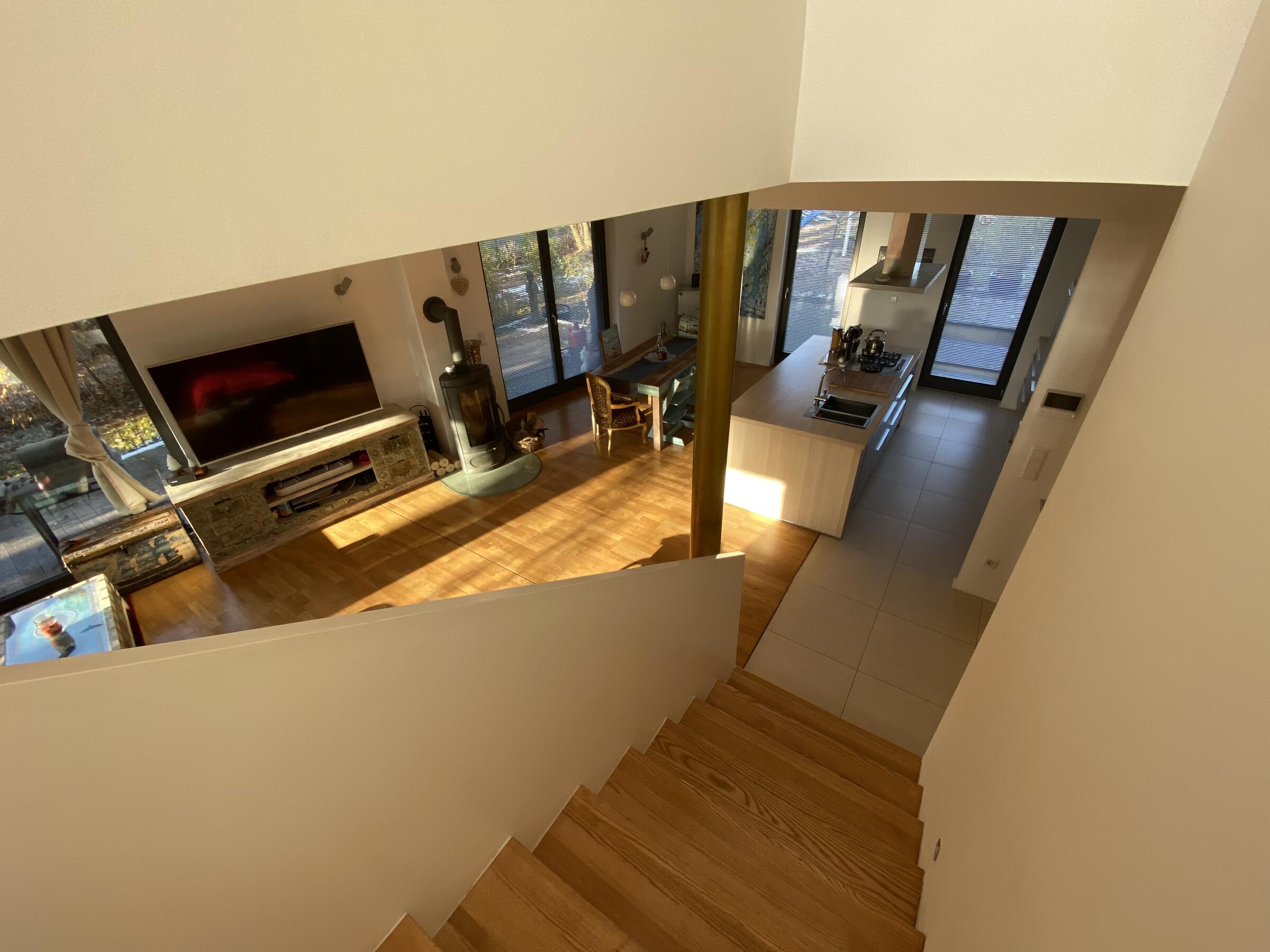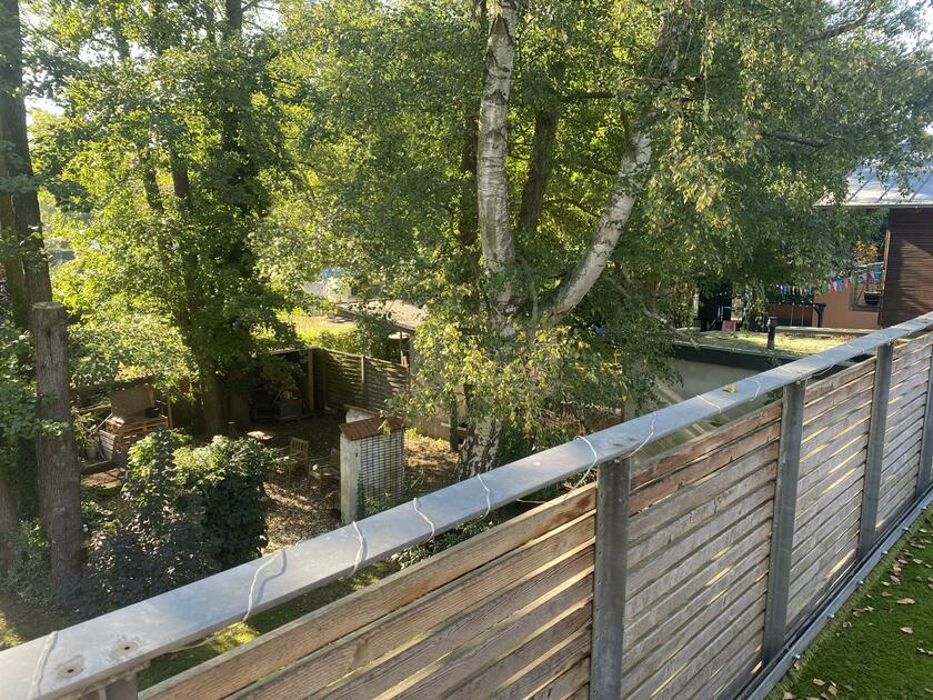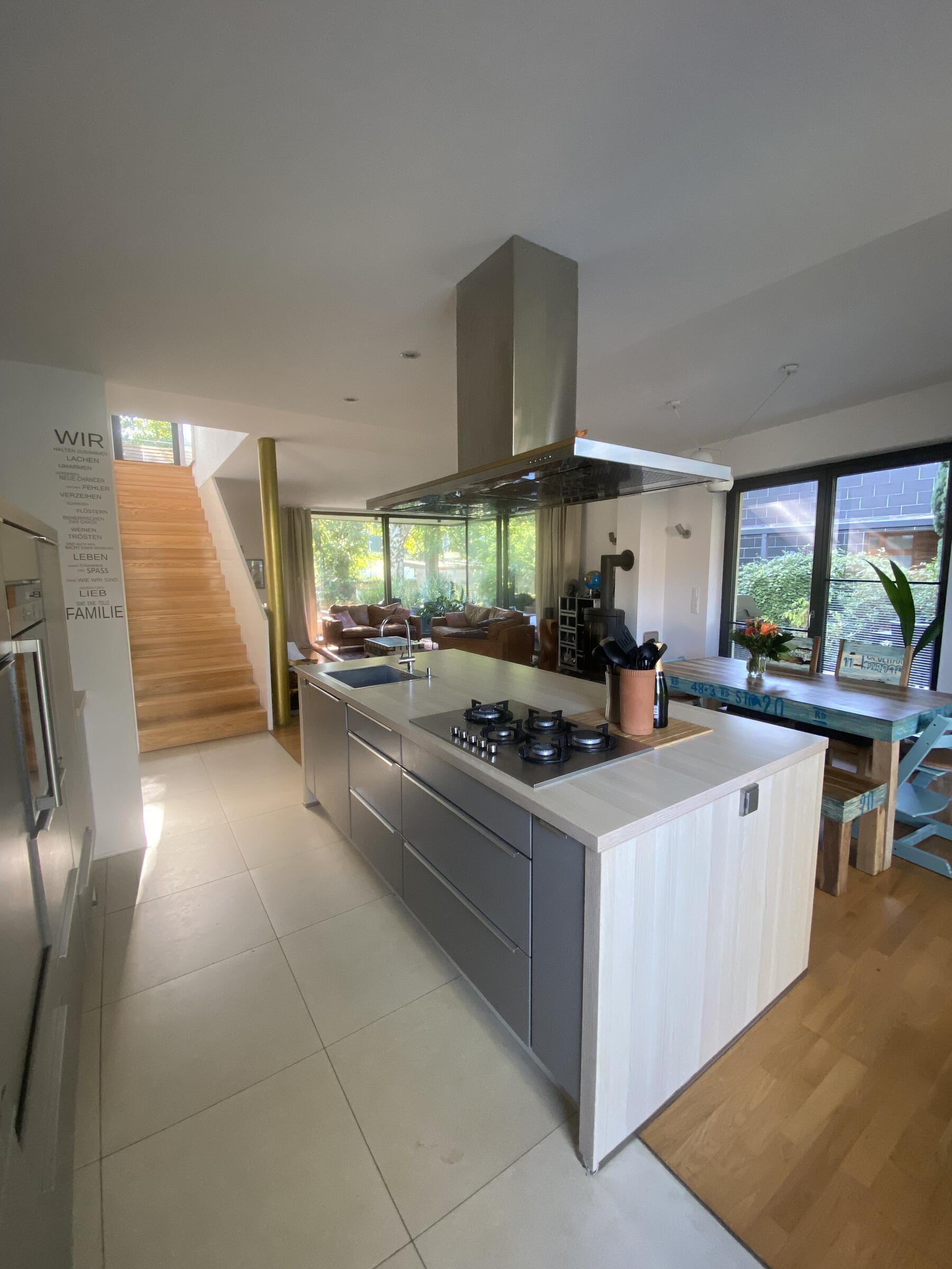 Unser Architektenhaus ist aufgrund seiner konischen Bauweise einzigartig. Die bodentiefen Fenster im Wohnbereich sowie allen anderen Zimmern lassen viel Sonnenlicht herein. Der moderne Küchenbereich ist mit einer großen Kücheninsel ausgestattet. Alle Fenster können mit Vorhängen oder Jalousien abgedunkelt werden. Von allen Räume kann man die umlaufende Terrasse unseres Hauses betreten. Auch im Obergeschoss haben alle Räume bodentiefe Fenster, die mit Jalousien abgedunkelt werden können. Der umlaufende Balkon kann hier ebenfalls von allen Räumen betreten werden. Der Garten ist gepflegt aber wild angelegt, wirkt parkähnlich. Unser Haus befindet sich an einer verkehrsberuhigten Spielstraße. Die lange Auffahrt zum Haus bietet Parkplätze für ca. 5 Pkw. Vor unserem Haus gibt es einen weiteren Parkplatz mit Wallbox und einen schmalen Streifen Garten mit kleinen Obstbäumen drauf. Dieser führt um das Haus herum zum großen Garten. Man kann um das ganze Haus herum laufen. Der Carport ist mit dem großen dahinter liegenden wilden Garten verbunden. Wir haben eine Katze.