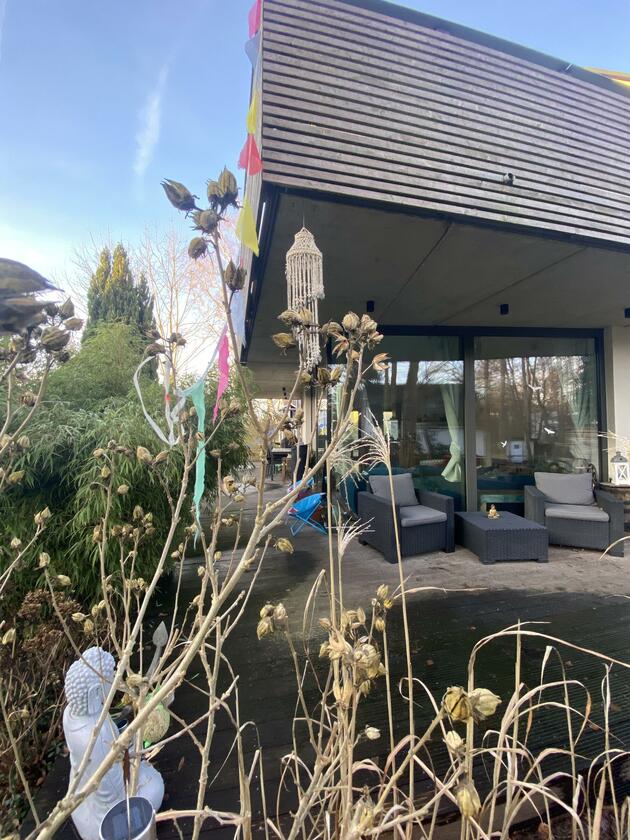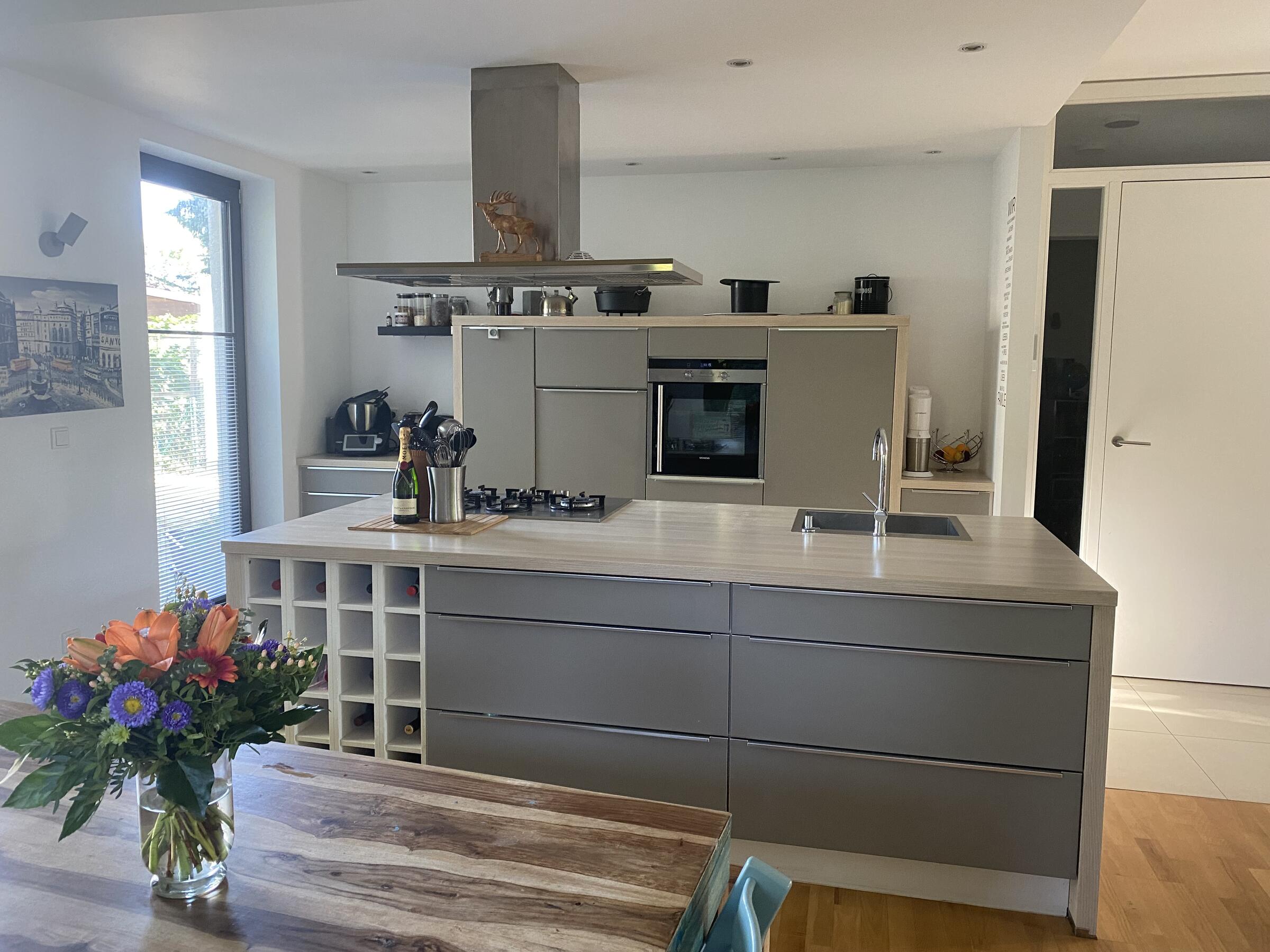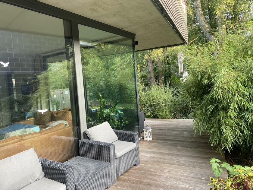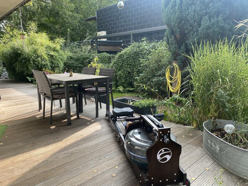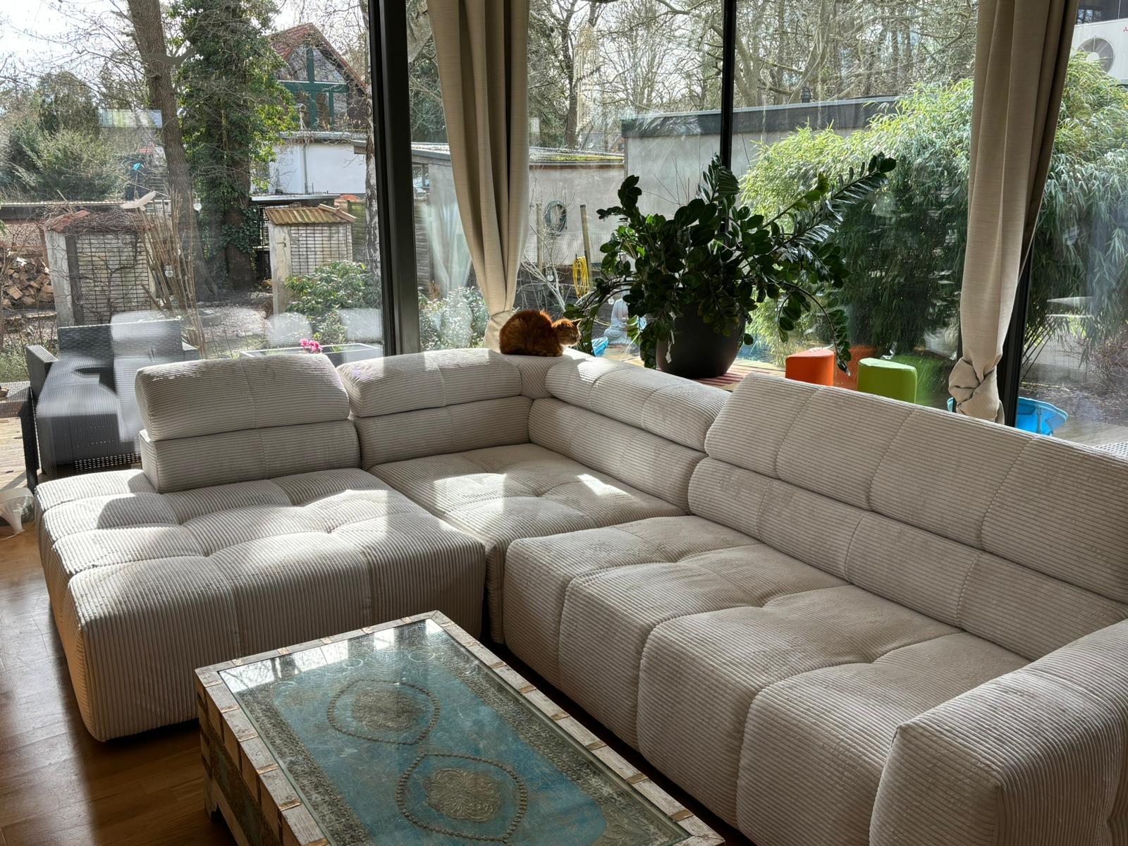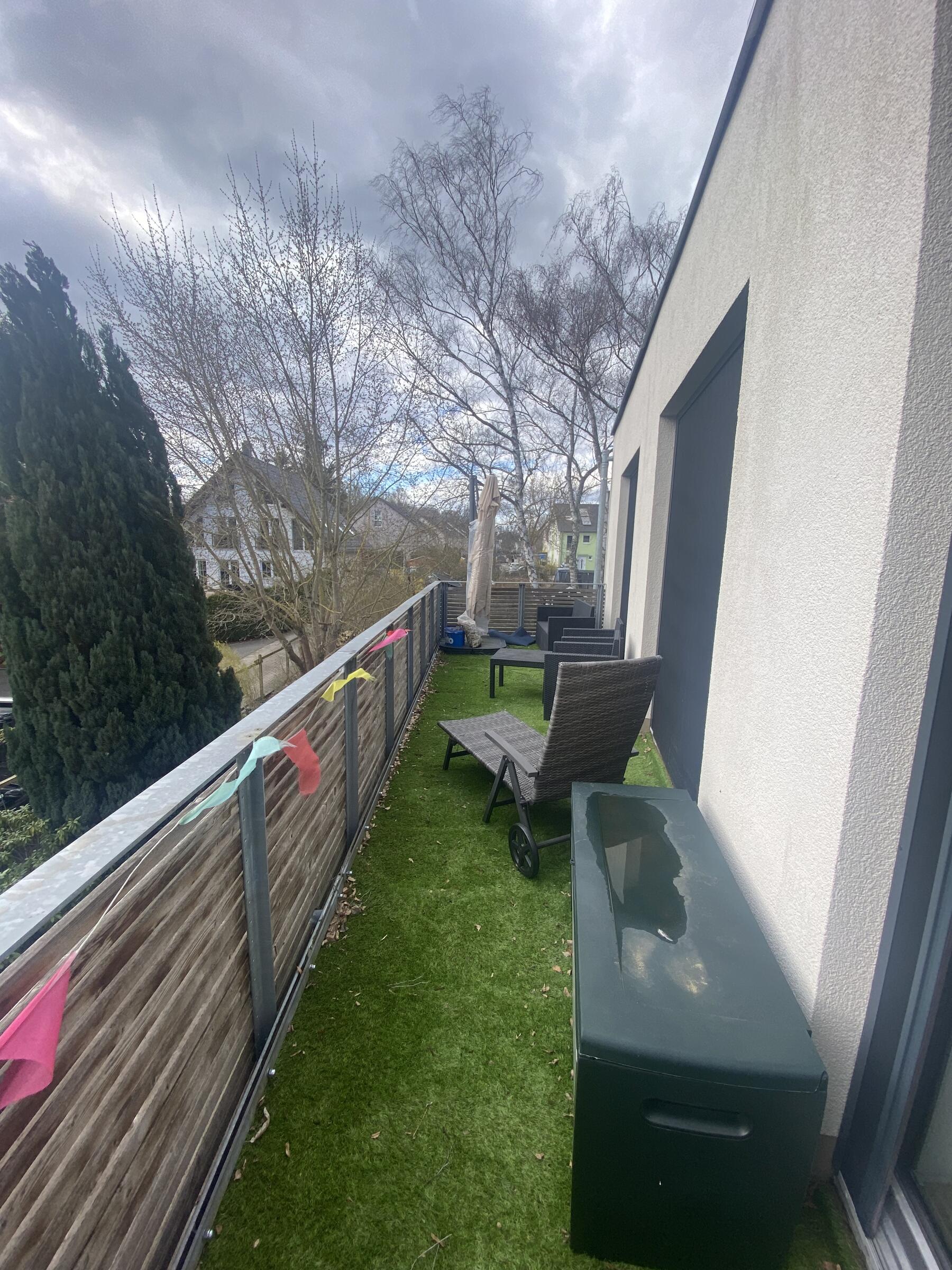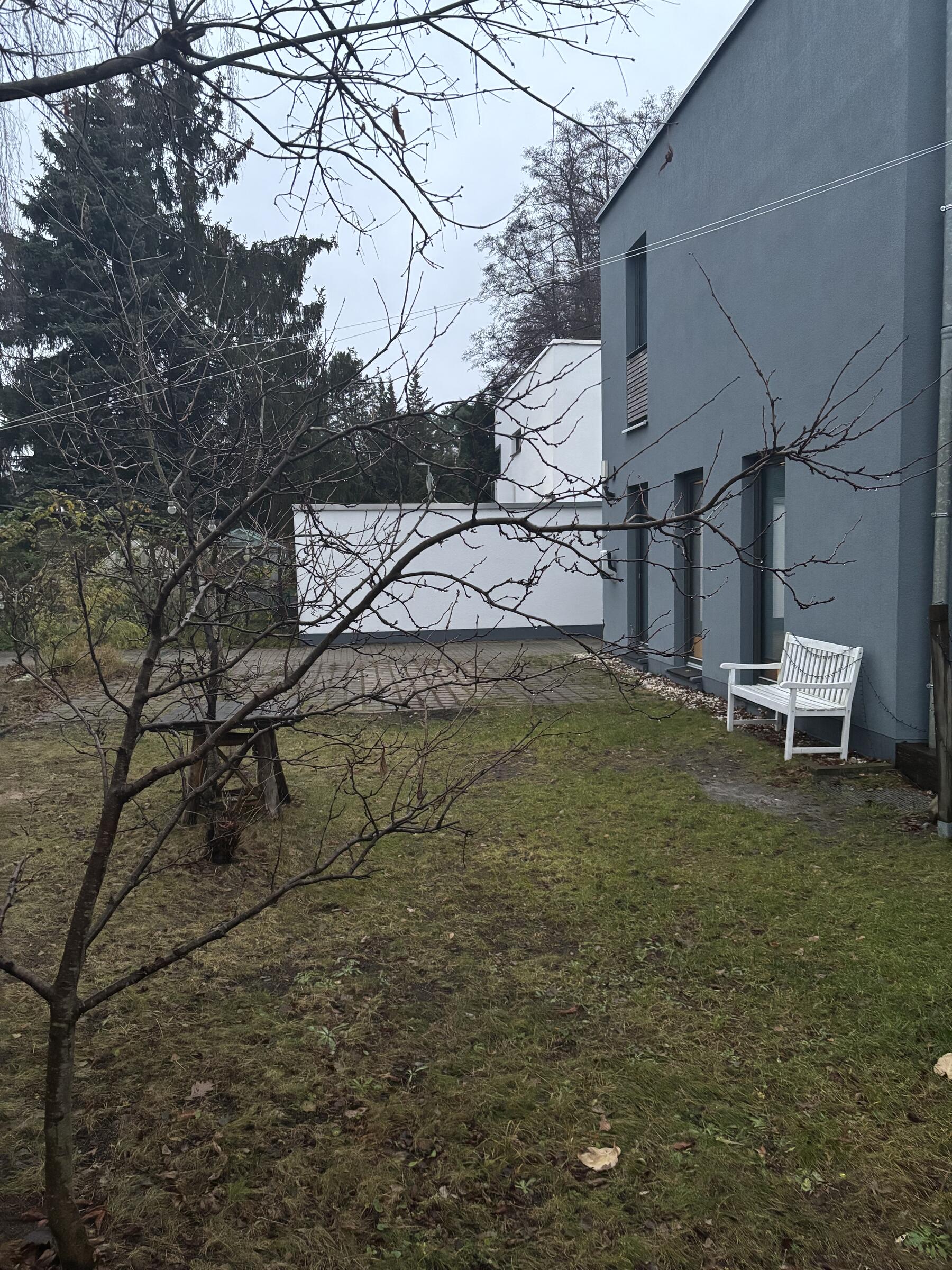 Unser Architektenhaus ist aufgrund seiner konischen Bauweise einzigartig. Die bodentiefen Fenster im Wohnbereich sowie allen anderen Zimmern lassen viel Sonnenlicht herein. Der moderne Küchenbereich ist mit einer großen Kücheninsel ausgestattet. Alle Fenster können mit Vorhängen oder Jalousien abgedunkelt werden. Von allen Räume kann man die umlaufende Terrasse unseres Hauses betreten. Auch im Obergeschoss haben alle Räume bodentiefe Fenster, die mit Jalousien abgedunkelt werden können. Der umlaufende Balkon kann hier ebenfalls von allen Räumen betreten werden. Der Garten ist gepflegt aber wild angelegt, wirkt parkähnlich. Unser Haus befindet sich an einer verkehrsberuhigten Spielstraße. Die lange Auffahrt zum Haus bietet Parkplätze für ca. 5 Pkw. Vor unserem Haus gibt es einen weiteren Parkplatz mit Wallbox und einen schmalen Streifen Garten mit kleinen Obstbäumen drauf. Dieser führt um das Haus herum zum großen Garten. Man kann um das ganze Haus herum laufen. Der Carport ist mit dem großen dahinter liegenden wilden Garten verbunden. Wir haben eine Katze.
