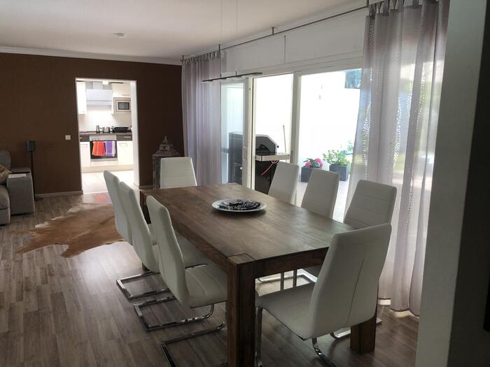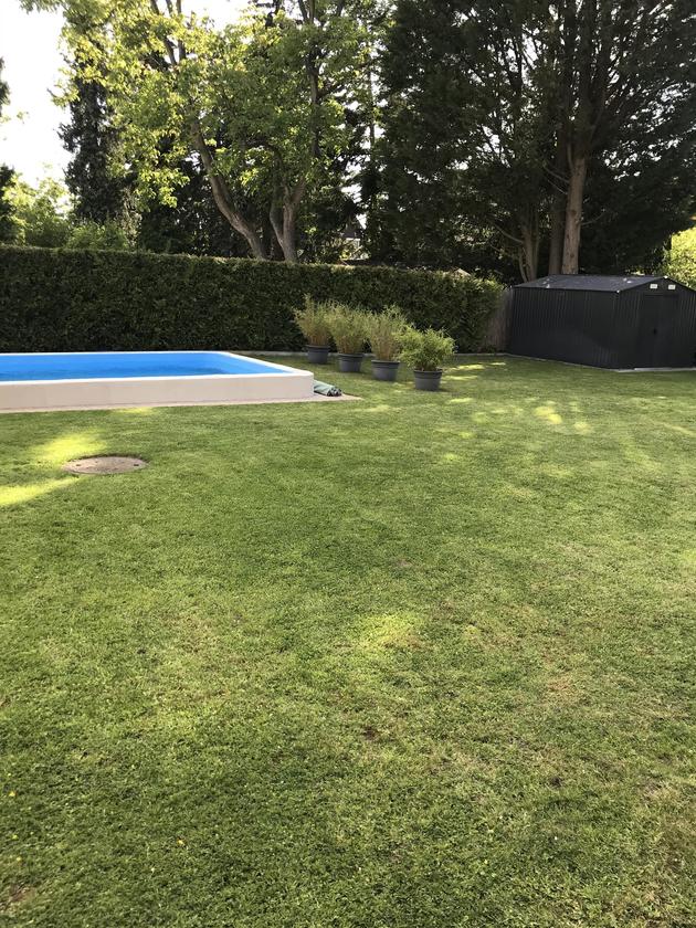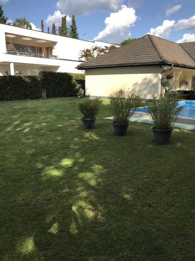 Unser alleinstehendes Einfamilienhaus im Bungalowstil in Berlin-Zehlendorf ist von einem großen Grundstück mit 850 m² und einem großzügig angelegten Garten sowie einer Pool-Landschaft umgeben. Eine große Terrasse mit Möbeln für 10 Personen grenzt direkt an das Haus. Eine besonders große Liegewiese befindet sich rund um den Pool. Hier können 4 "Lazy Bag" zur Verfügung gestellt werden. Der Außenpool besitzt die Maße: 9 m Länge, 3,5 m Breite und 1,5 m Tiefe. Eine Tischtennisplatte steht ebenfalls zur Verfügung. Auf der Terrasse kann zudem mit einem großen 4-flammigen Gasgrill gegrillt werden. Das Wohnzimmer bietet einen großen offenen Raum zur Terrasse. Hier steht ein großer Esstisch mit 8 passenden Stühlen. Die große Wohnlandschaft bietet Gemütlichkeit mit einem offenen Kamin, einem 55-Zoll Fernseher. Die Küche ist zum Wohnzimmer hin offen gestaltet. Das Bad bietet einen großen Whirlpool mit Lichteffekten. Die Dusche ist großzügig offen gehalten. Des weiteren gibt es ein Gästebad, 2 Kinderzimmer, ein großzügiges Schlafzimmer mit Ausgang zur Terrasse und ein Gästezimmer. Im Garten befindet sich ein Kleines Gästehaus.