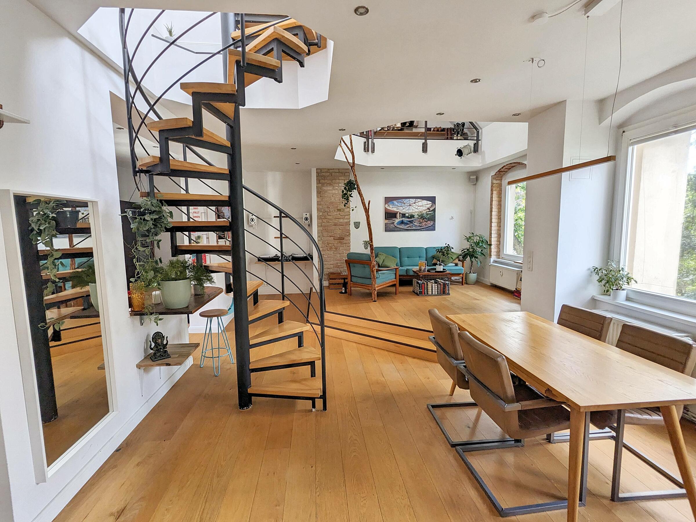 Meine Wohnung befindet sich im 4. Obergeschoss eines ruhigen Hinterhauses in Kreuzberg und bietet ein warmes und edles Ambiente. Die Räume der Wohnung sind hell und freundlich eingerichtet. Durch die Fenster fällt Tageslicht von zwei Seiten in die Wohnräume. Durch die Deckenfenster der Galerie gibt es ebenfalls direktes Tageslicht. Auf den Böden der Wohnräume wurde hochwertiges Echtholzparkett verlegt. Die Böden der Badezimmer sind teilweise gefliest. Zusätzliche Lagerungsmöglichkeiten für Produktionsausrüstung bietet der Dachboden. Ausreichend Parkplätze stehen vor dem Haus zur Verfügung.