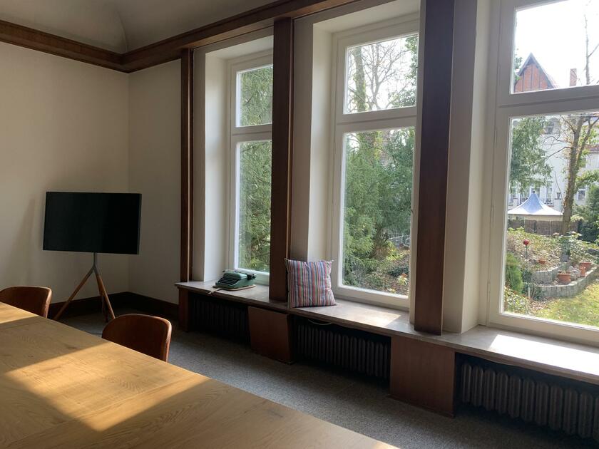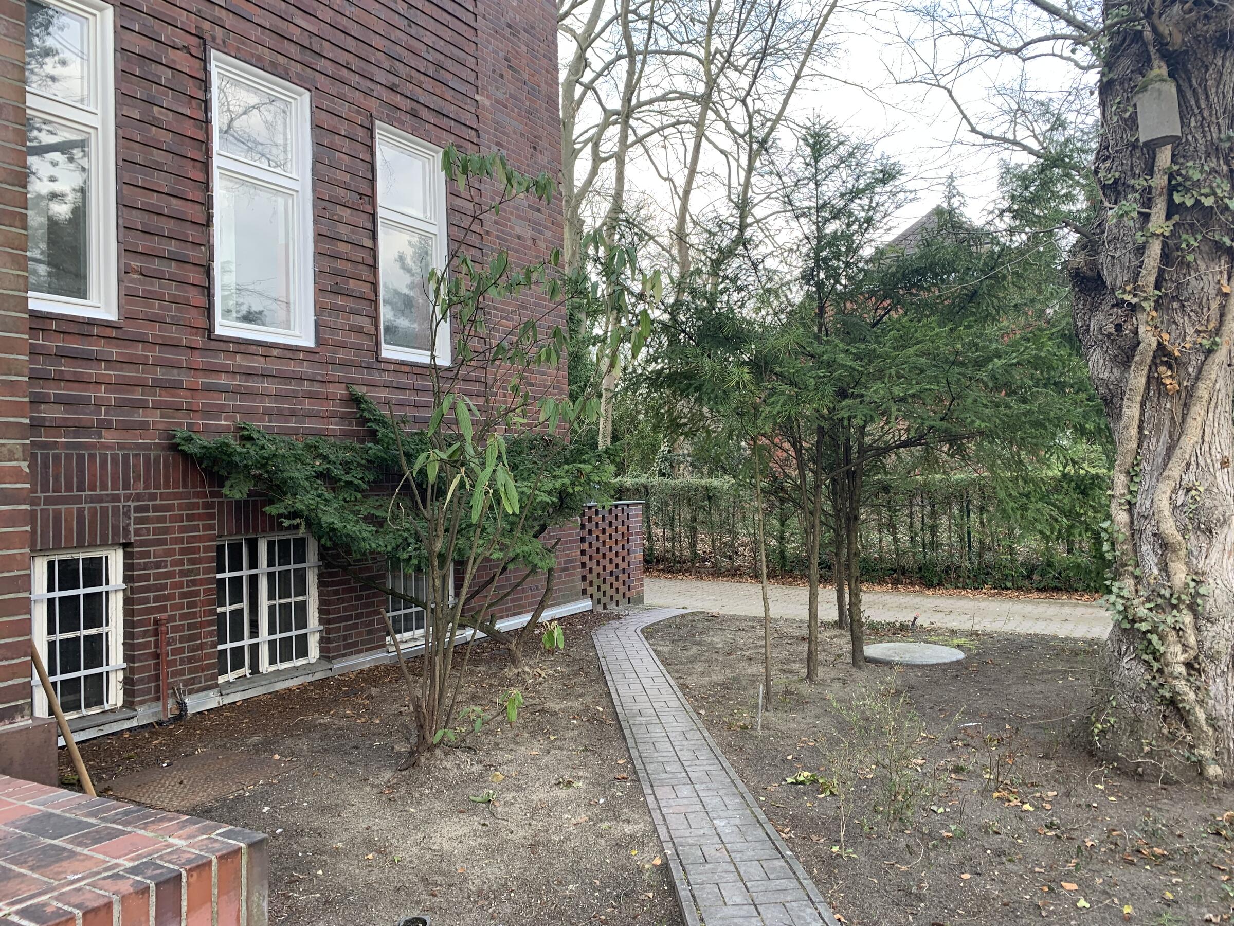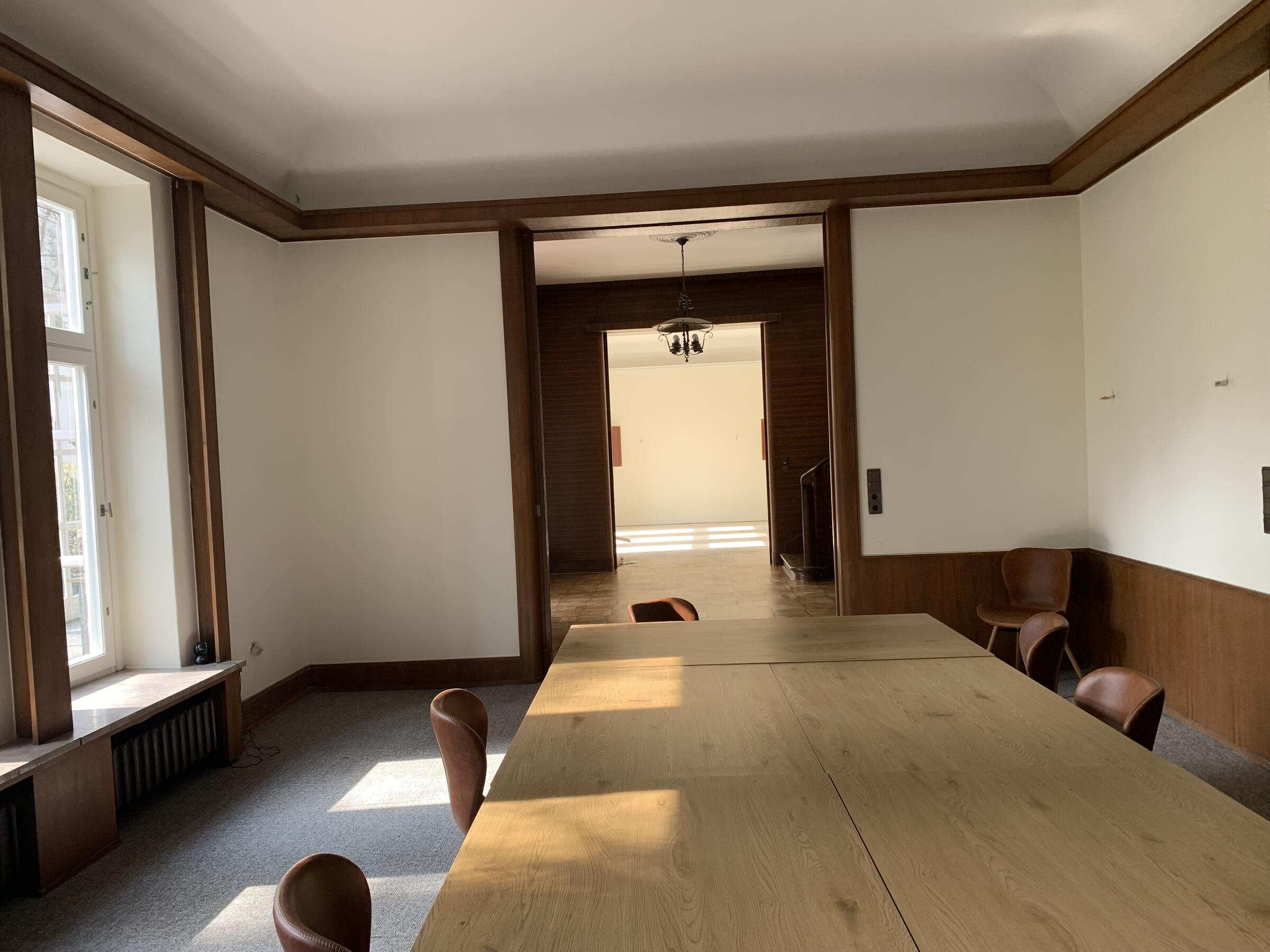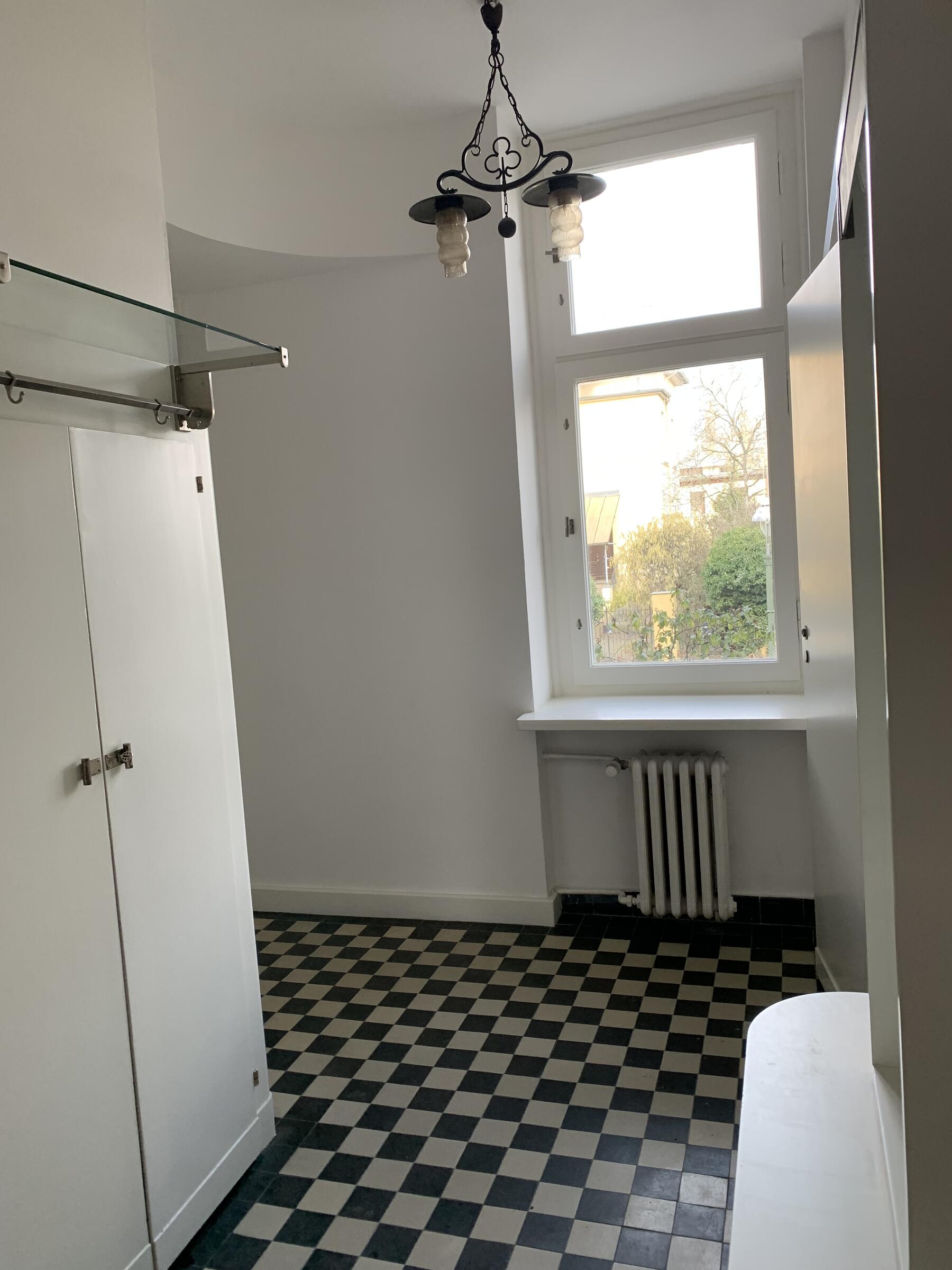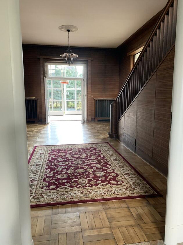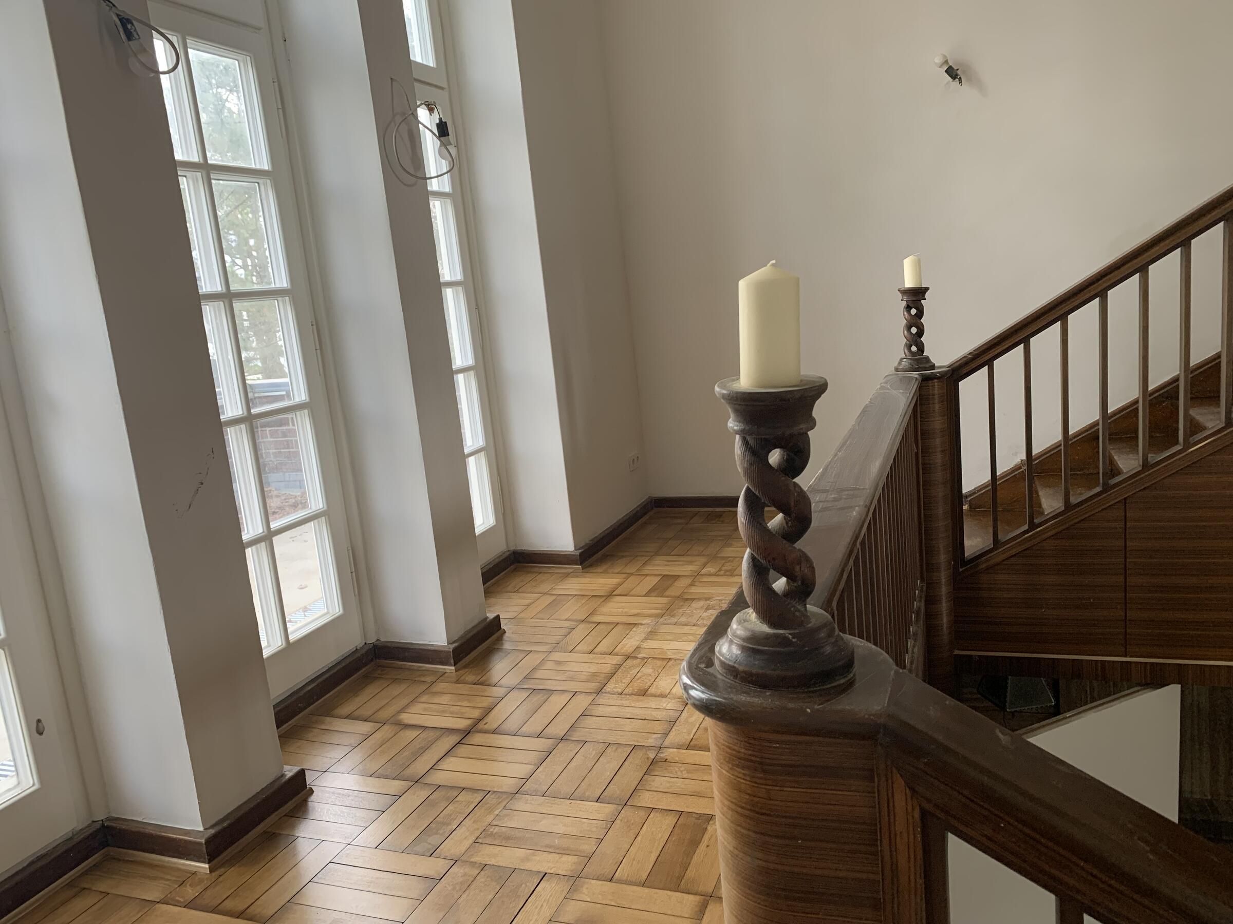 Die leerstehende Villa wurde im Jahr 1930 erbaut und befindet sich in einer ruhigen Wohngegend im Berliner Westend. Über eine kleine Treppe gelangt man in den Eingangsflur mit sandfarbenem Steinboden und mittelgrüner Tapete. Das Treppenhaus hat teilweise holzverkleidete Wände, bietet einen alten Kamin und eine aufwendig restaurierte Holztreppe. Links und rechts des Treppenhauses befinden sich zwei große Holzschiebetüren, die jeweils in das große Esszimmer und ein Herrenzimmer führen. Im Untergeschoss stehen eine kleine Küche, ein kleines und ein größeres Zimmer, eine Toilette sowie weitere leere Flächen zur Verfügung. Hier befinden sich auch 2 nutzbare WCs. Durch eine große Glastür gelangt man in den vollständig verglasten und lichtdurchfluteten Wintergarten. Der durch dichte Büsche und Bäume blickgeschützte Garten kann ebenfalls für Produktionen genutzt werden. Pkw-Stellplätze befinden sich auf der Einfahrt zum Grundstück und an der vorbeiführenden Straße.
