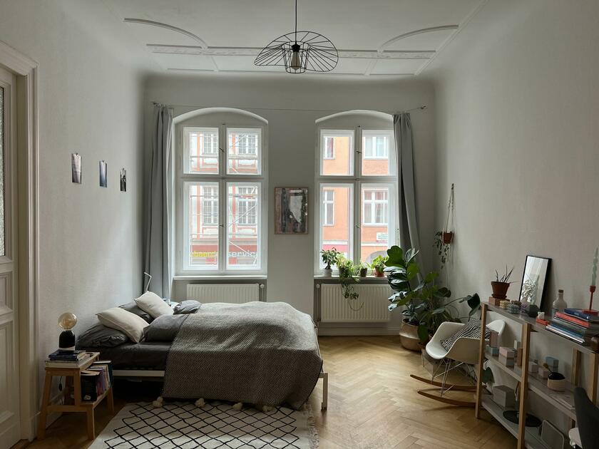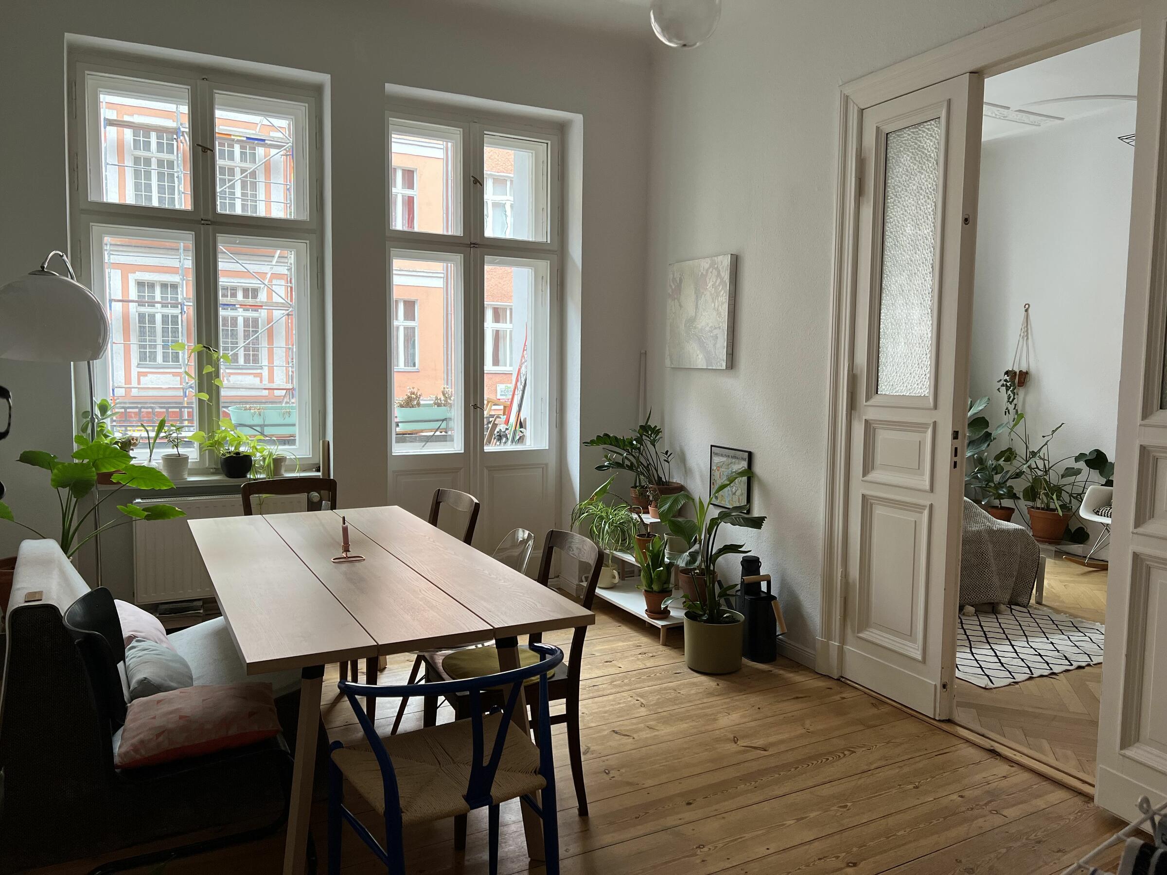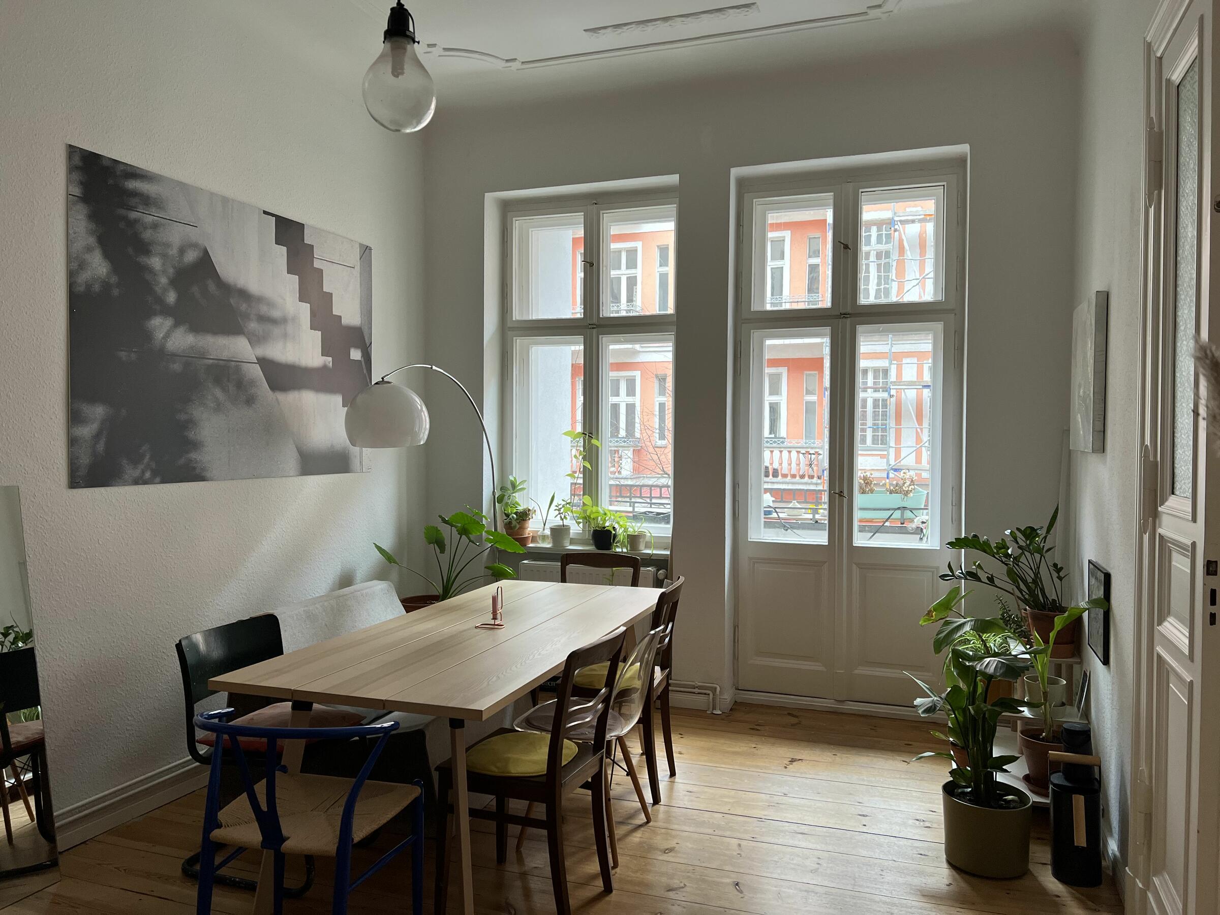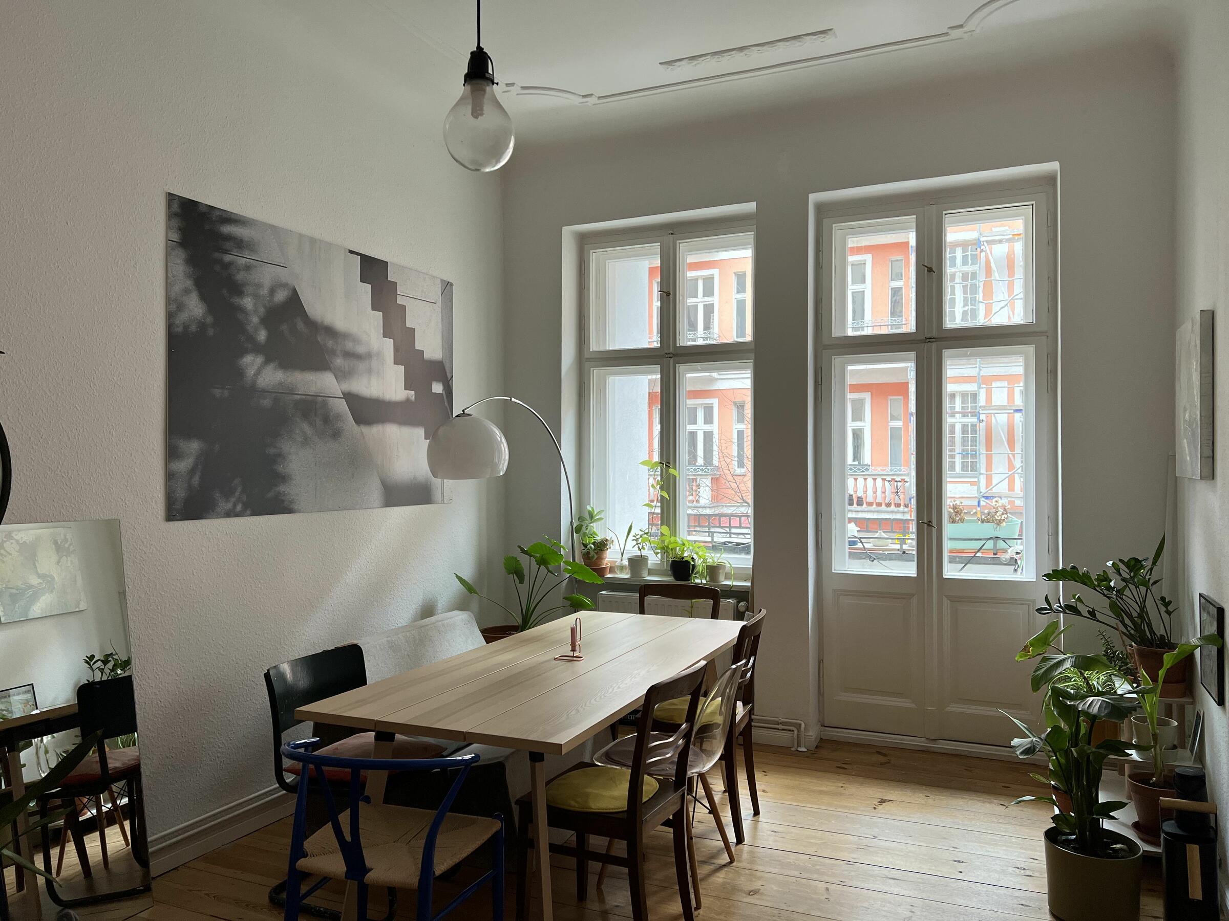Ich biete meine wunderschöne Altbauwohnung im Herzen Neuköllns. Die Wohnung besticht durch hohe Decken, wunderbar erhaltenem Boden und einem offen gestalteten Wohnkonzept aus Küche, Lounge, Esszimmer, Wohnzimmer, separatem Schlafzimmer und Badezimmer. Die 90 m² große Wohnung befindet sich im ersten Stock und die großen Zimmer sind sehr hell bei Tageslicht. Die Einrichtung ist skaninavisch-minimalistisch gehalten, einem Mix aus Design-Objekten und alltagsüblichen Gegenständen und Marken. Alles kann umgeräumt und neu platziert werden. Es gibt einen kleinen Balkon zur Straße hinaus.