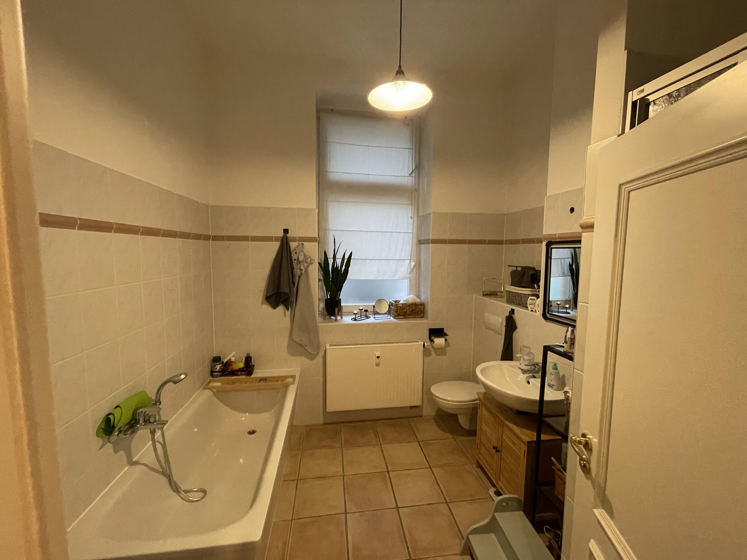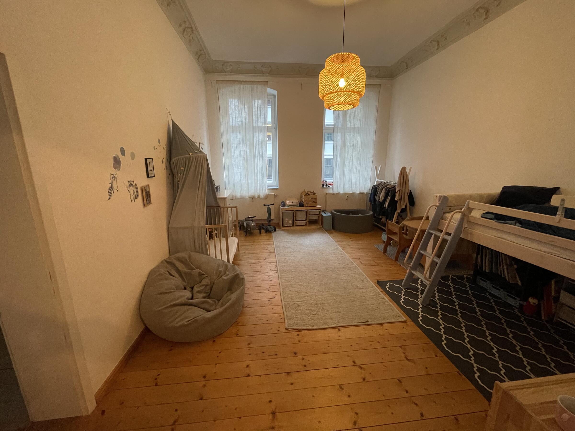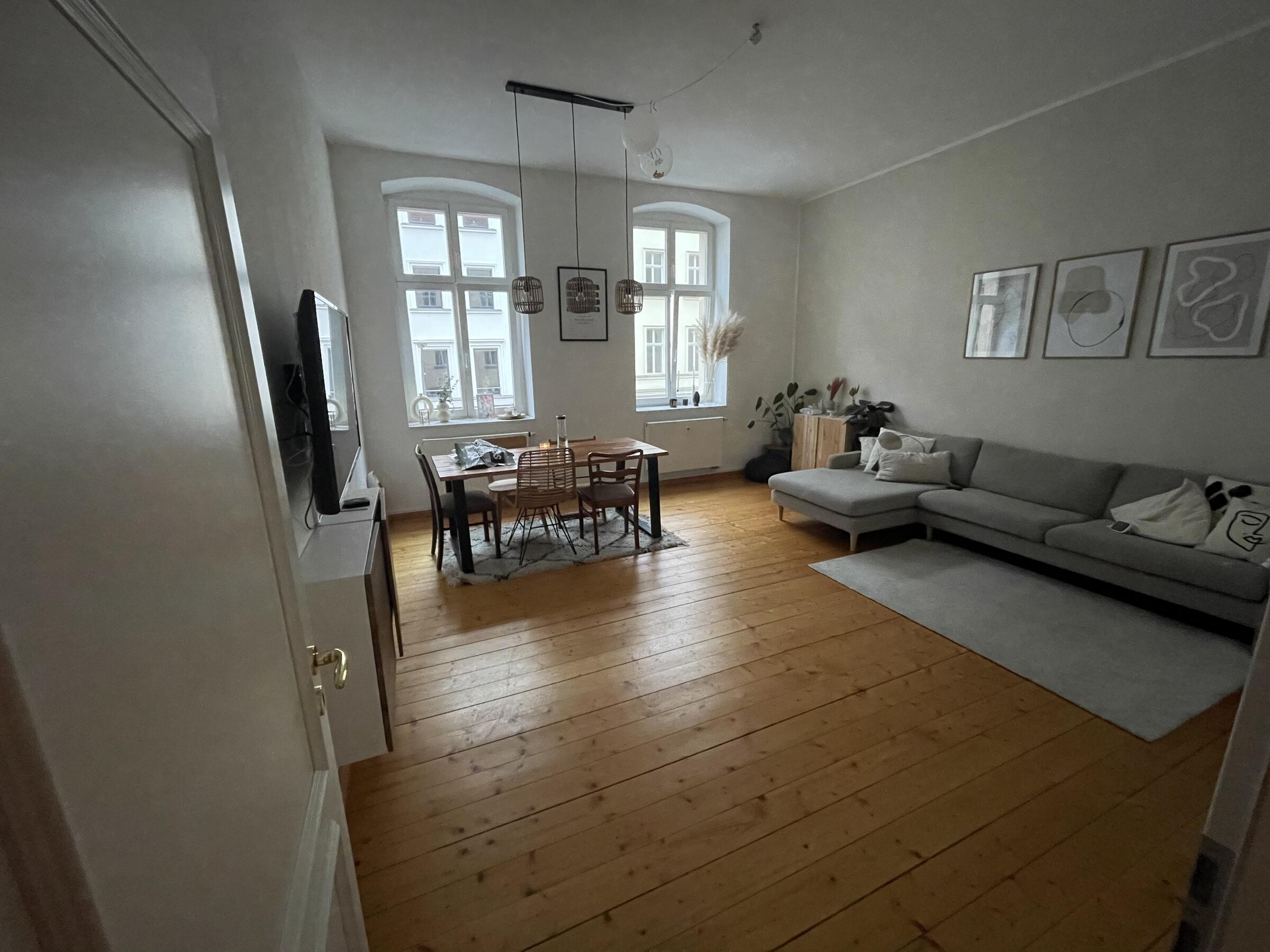 Unsere 100 m² große Wohnung befindet sich im Herzen von Berlin Mitte und überzeugt durch eine schlichte und minimalistische Einrichtung im skandinavischen Stil. Durch die eher dezenten und neutralen Erdtönen hat die Wohnung einen gewissen Altbau-Charme. Unsere Wohnung ist von morgens bis abends lichtdurchflutet. Wir sind die einzigen Bewohner im Haus, wodurch eine ungestörte und ruhige Atmosphäre besteht. In allen Räumen, außer der gefliesten Küche und des gefliesten Bad, ist Holzparkett verlegt worden, wodurch die Wohnung eine gewisse Wärme und Gemütlichkeit ausstrahlt. Wir freuen uns auf Ihre Anfrage.