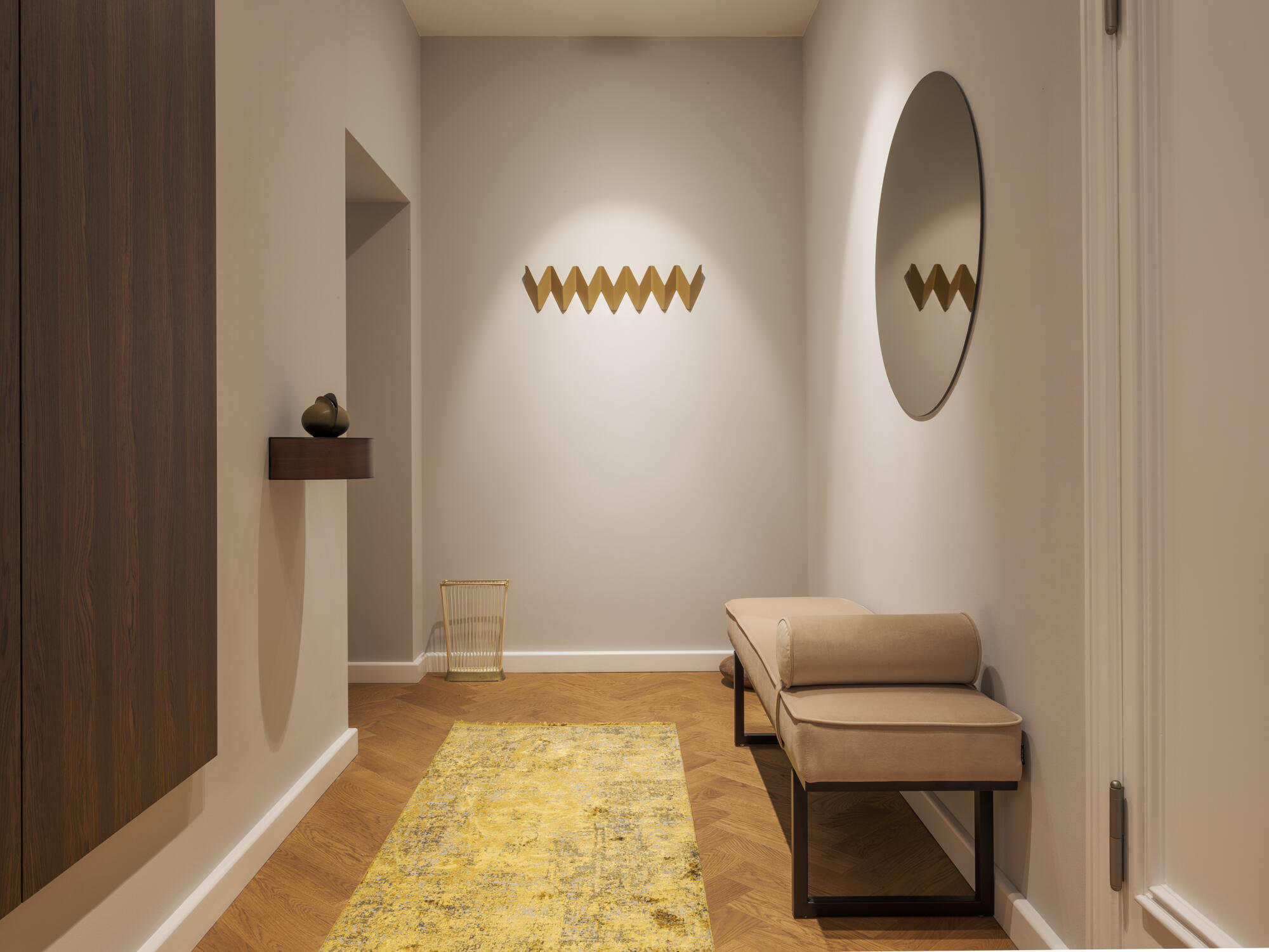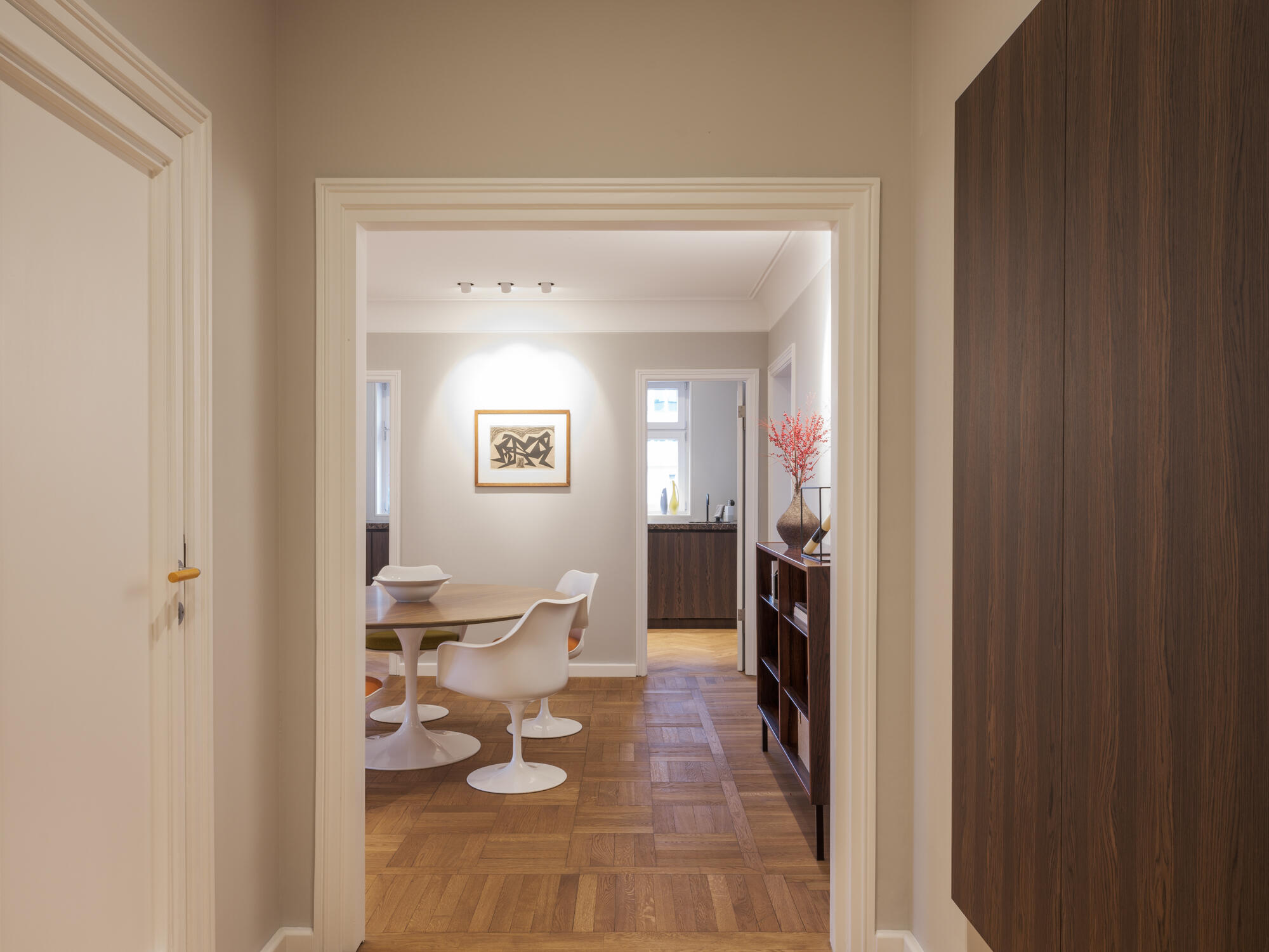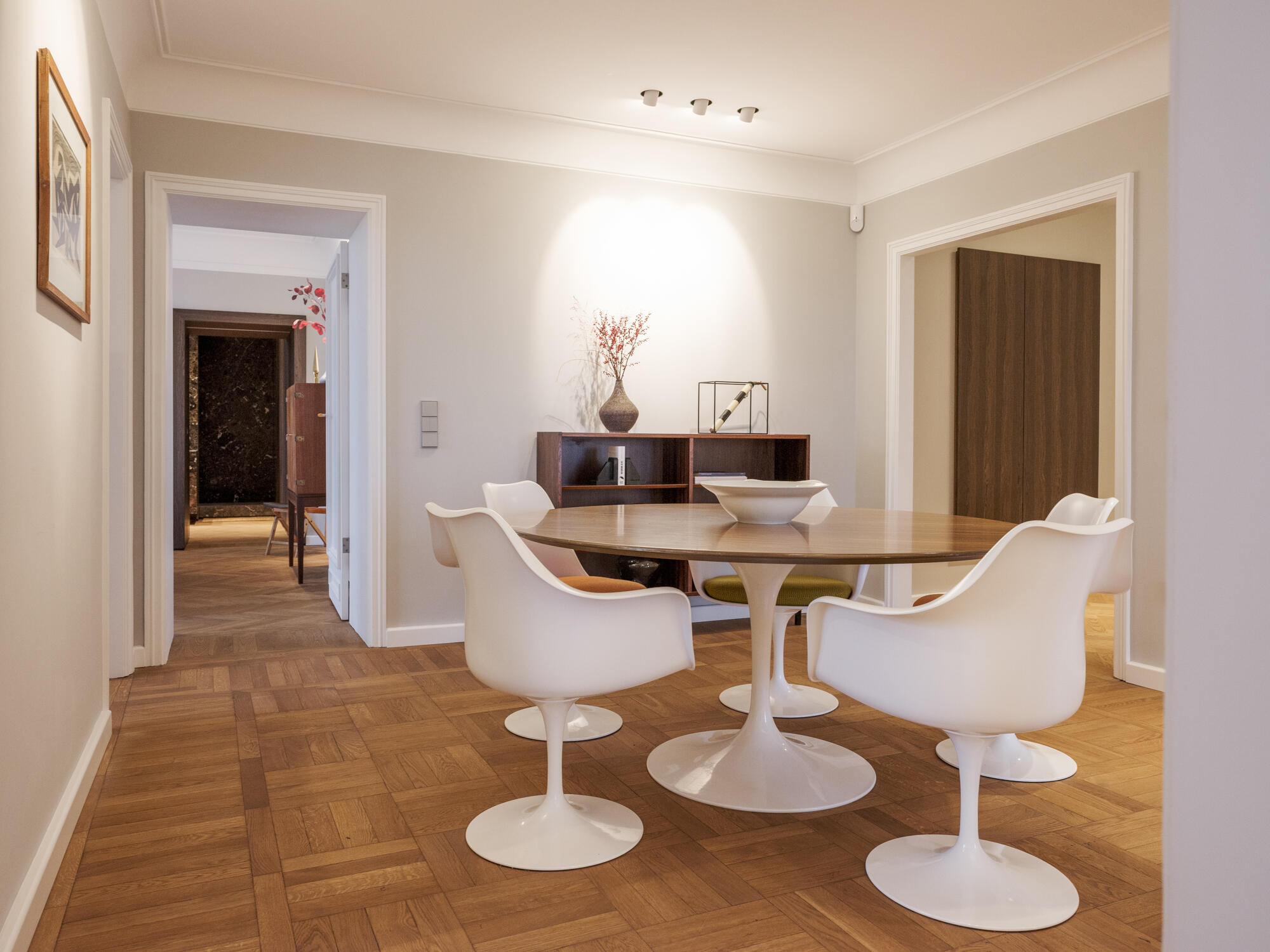 Die stilvolle Wohnung befindet sich in der 11. Etage des "Henselmann-Tower" und besticht mit hochwertigem Design. Der Boden der hellen und modern eingerichteten Wohnung ist mit hochwertigem Eichen-Parkett verlegt. Der Wohnbereich teilt sich sternförmig in ein Arbeitszimmer und den Wohnraum. Der zentrale und große Essbereich bietet einen ikonischem Tulpentisch. Die bodentiefen Fenster lassen viel Sonnenlicht in die Räume. Die moderne Küche ist mit Marmor und Holzverkleidungen ausgestattet. Das Schlafzimmer ist mit einem runden Designer-Bett ausgestattet. Das Bad ist mit braunem Marmor und Walk-in Dusche großzügig gestaltet.