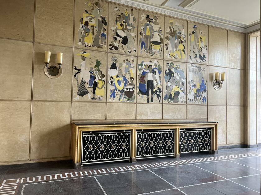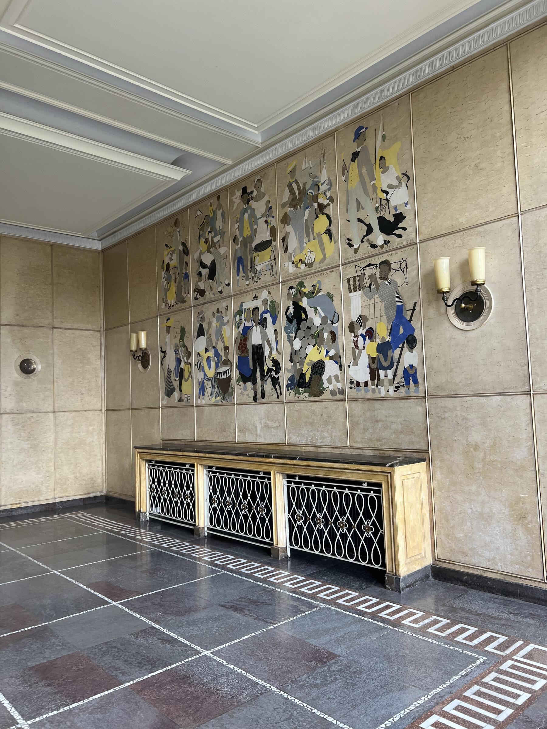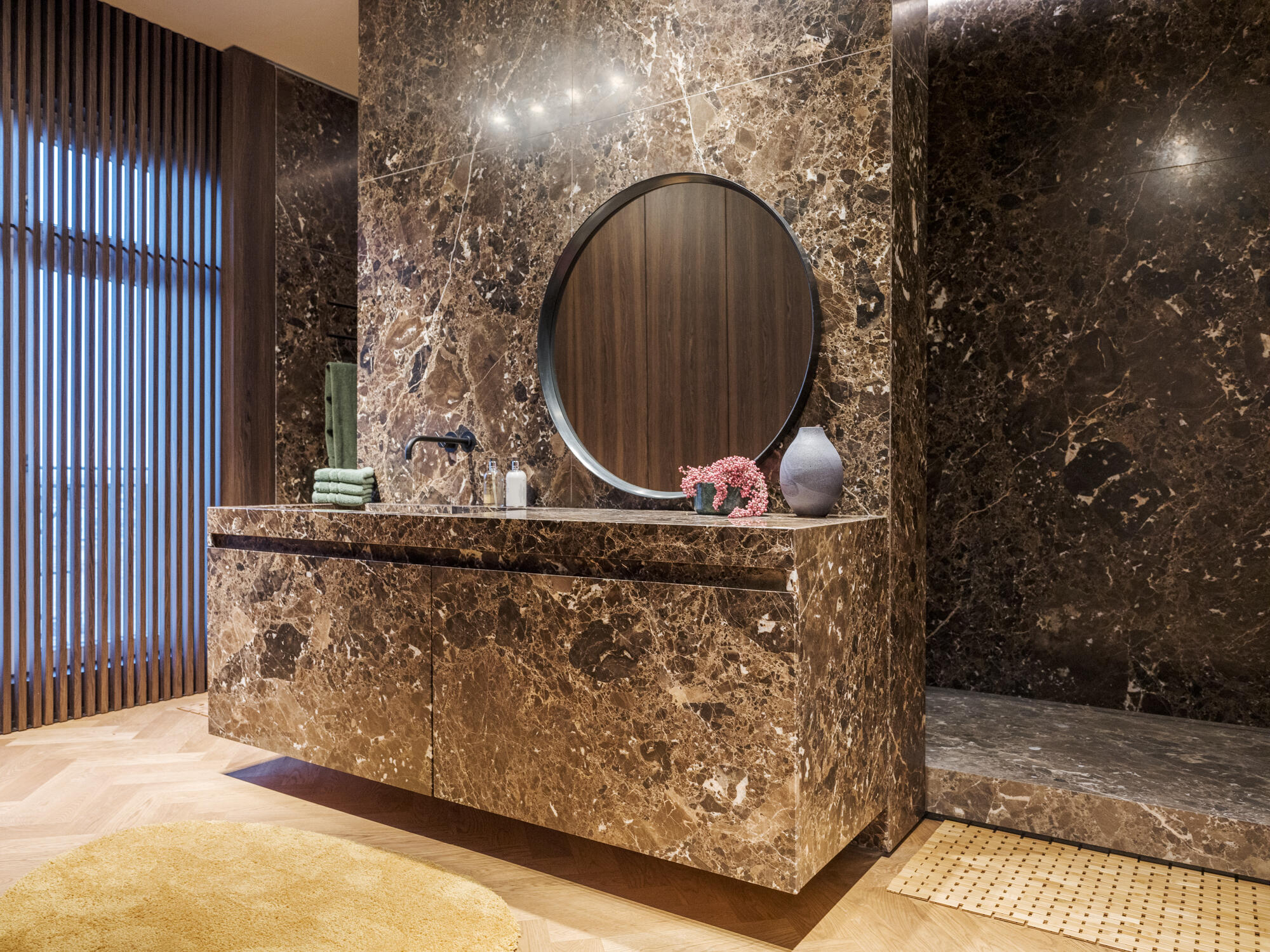 Die stilvolle Wohnung befindet sich in der 11. Etage des "Henselmann-Tower" und besticht mit hochwertigem Design. Der Boden der hellen und modern eingerichteten Wohnung ist mit hochwertigem Eichen-Parkett verlegt. Der Wohnbereich teilt sich sternförmig in ein Arbeitszimmer und den Wohnraum. Der zentrale und große Essbereich bietet einen ikonischem Tulpentisch. Die bodentiefen Fenster lassen viel Sonnenlicht in die Räume. Die moderne Küche ist mit Marmor und Holzverkleidungen ausgestattet. Das Schlafzimmer ist mit einem runden Designer-Bett ausgestattet. Das Bad ist mit braunem Marmor und Walk-in Dusche großzügig gestaltet.