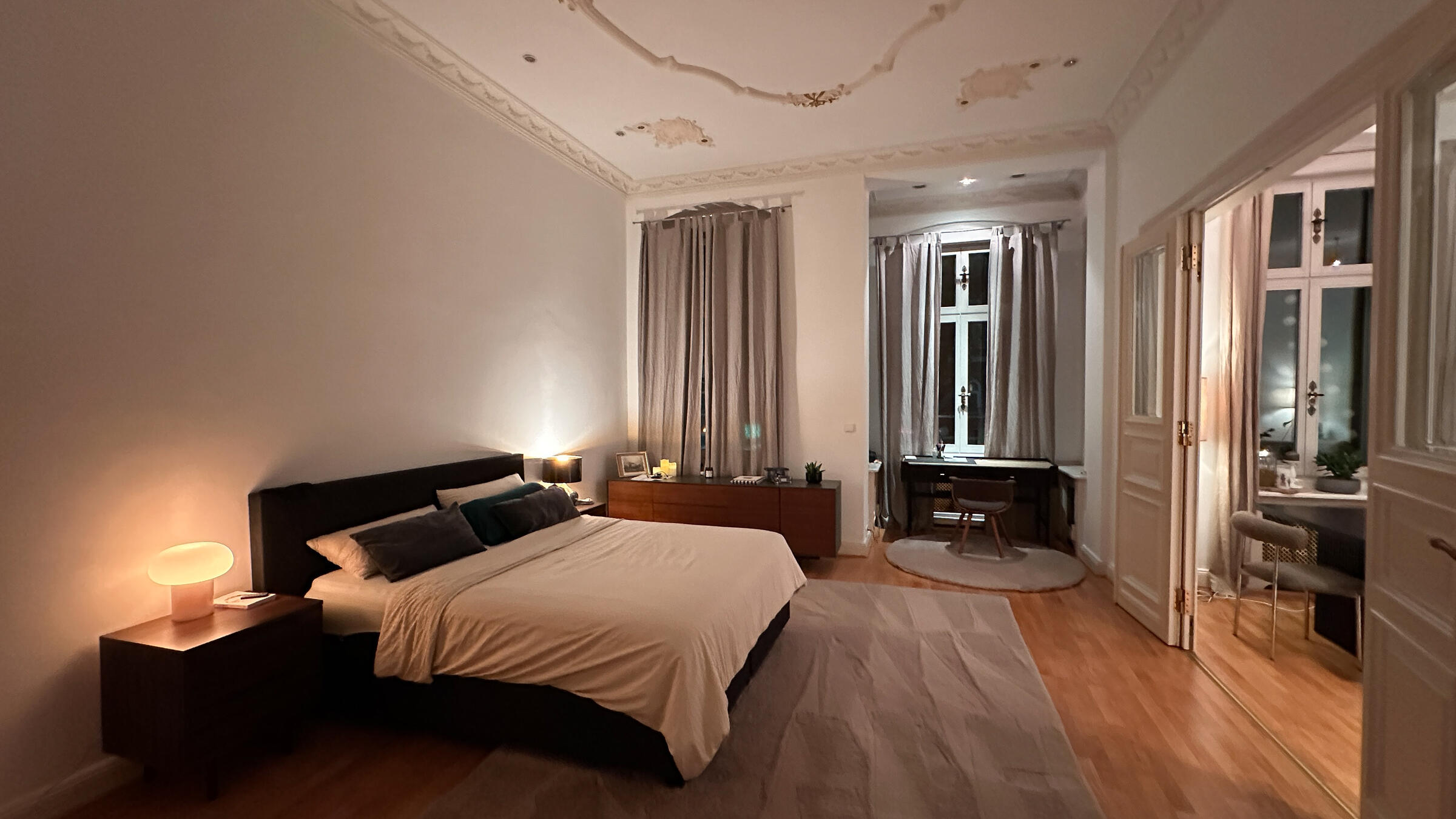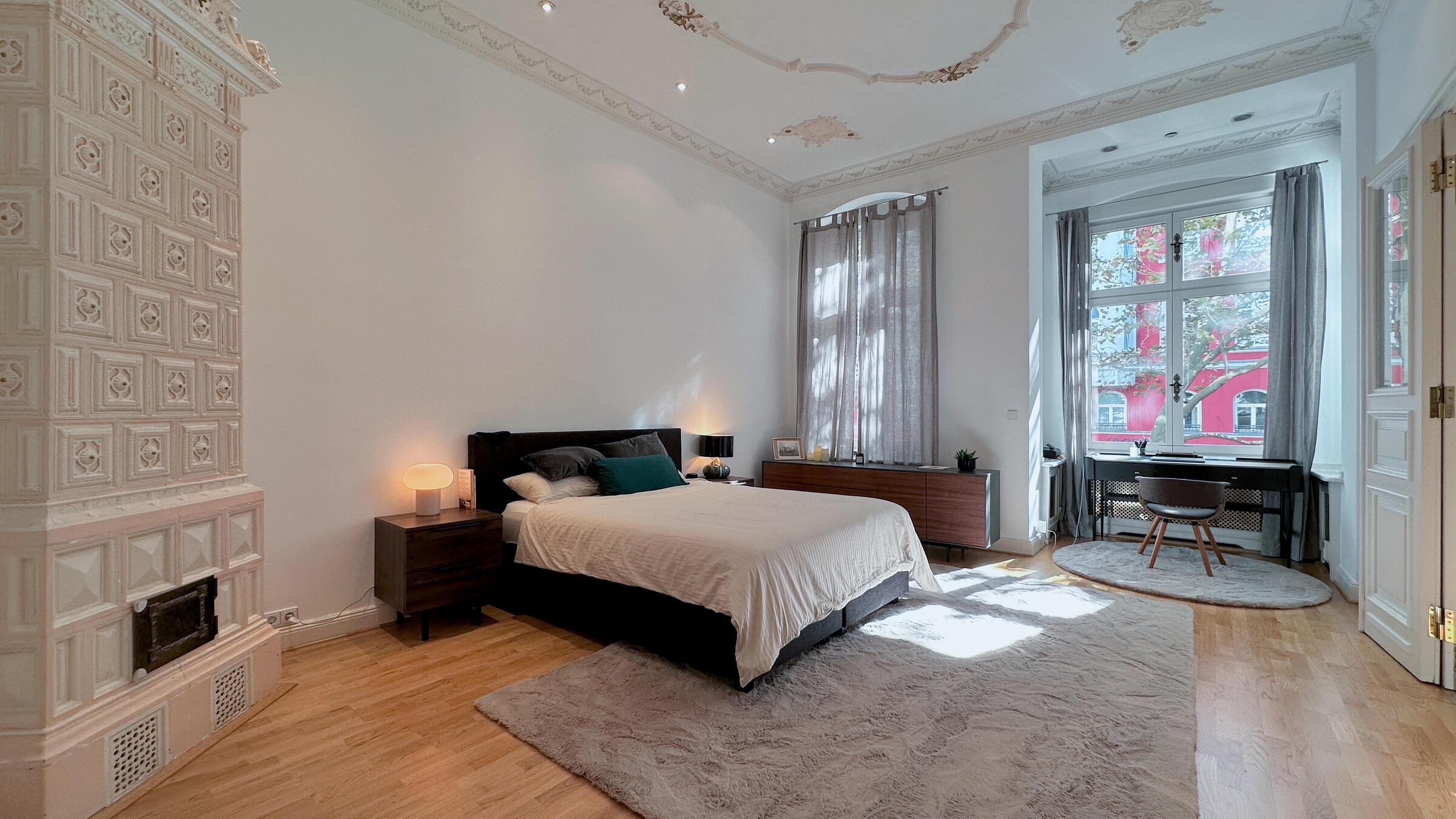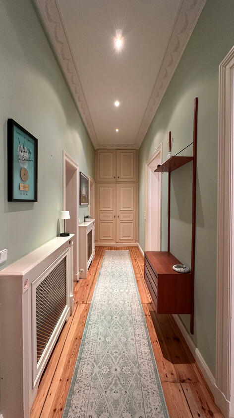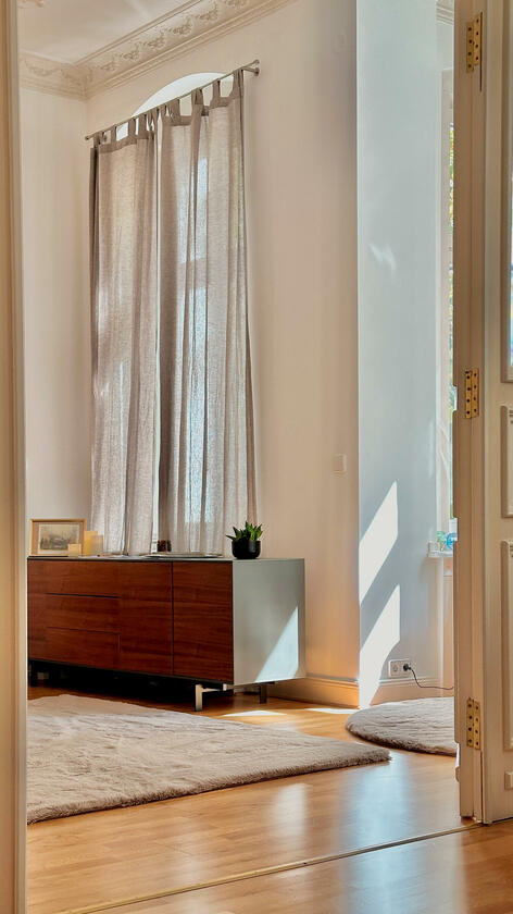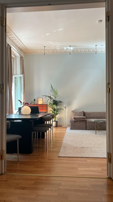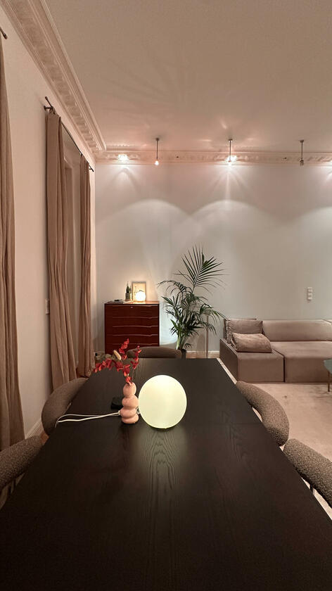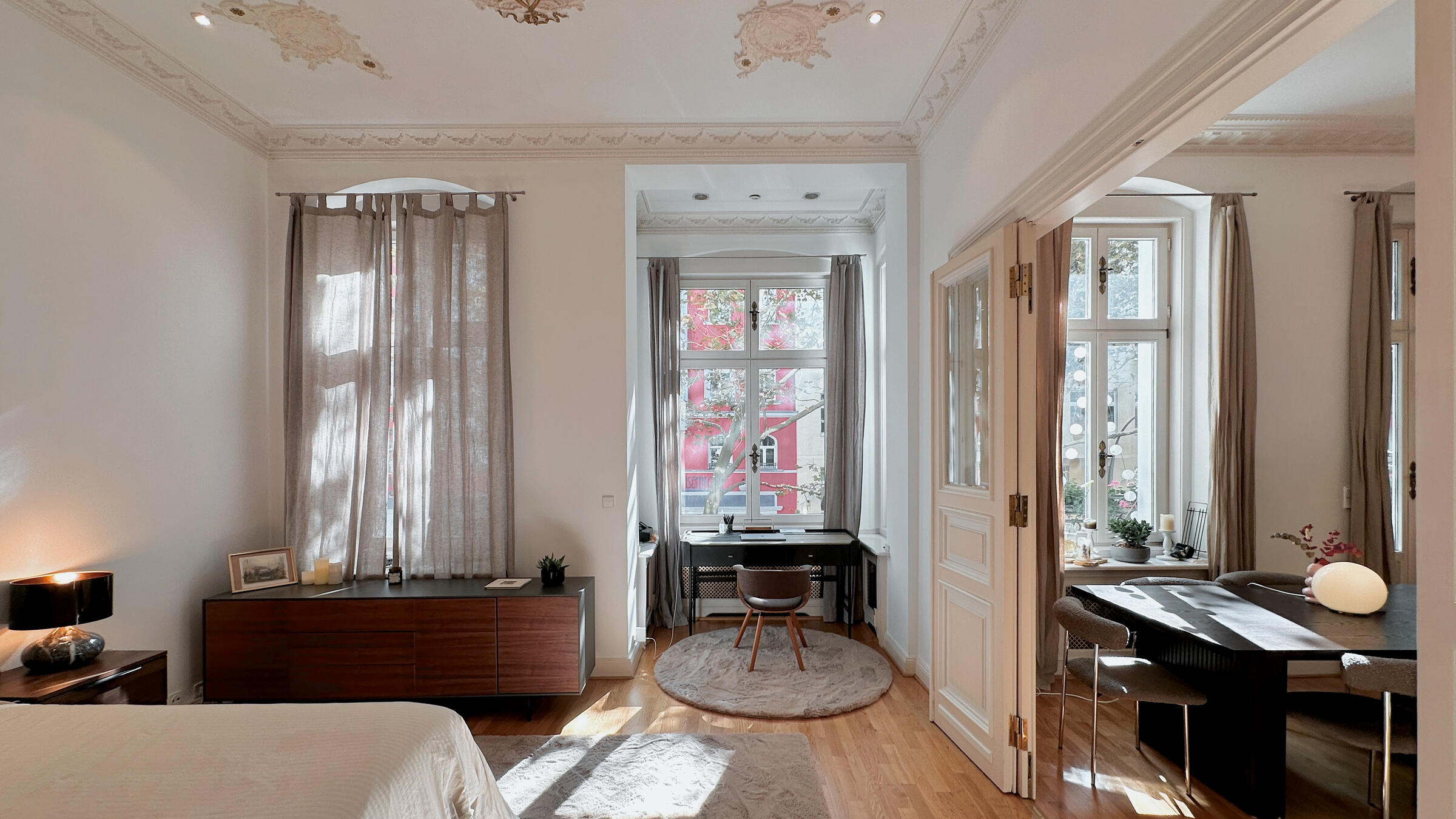 Die helle Altbauwohnung befindet sich in Schöneberg und bietet mit ihrer Mischung aus klassischer Architektur und moderner Inneneinrichtung ein stilvolles Ambiente. Der offene Wohn- und Essbereich zeichnet sich durch hohe Decken, edle Stuckverzierungen und große Flügeltüren aus. Der hochwertige Holzboden ergänzt das minimalistische und zugleich gemütliche Möbeldesign. Die Küche kombiniert moderne Ausstattung mit einem charmanten, klassischen Design. Schwarze und weiße Fliesen, offene Regale und eine großzügige Fensterfront schaffen eine helle und freundliche Atmosphäre. Das großzügige Schlafzimmer bietet ein elegantes Setting mit einer Kombination aus minimalistischem Design und klassischen Stilelementen. Die hohen Fenster lassen viel Licht herein und schaffen eine beruhigende Atmosphäre. Das moderne Badezimmer ist mit Marmorfliesen ausgestattet. Ein stilvoller, langer Flur mit eleganter Wandverzierung und Einbauschränken verbindet die verschiedenen Räume der Wohnung. Die dezenten Farbtöne und der hölzerne Boden harmonieren perfekt mit der modernen Beleuchtung, was dem gesamten Bereich eine zeitlose Eleganz verleiht.