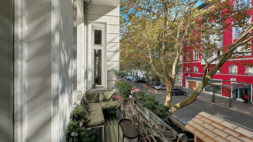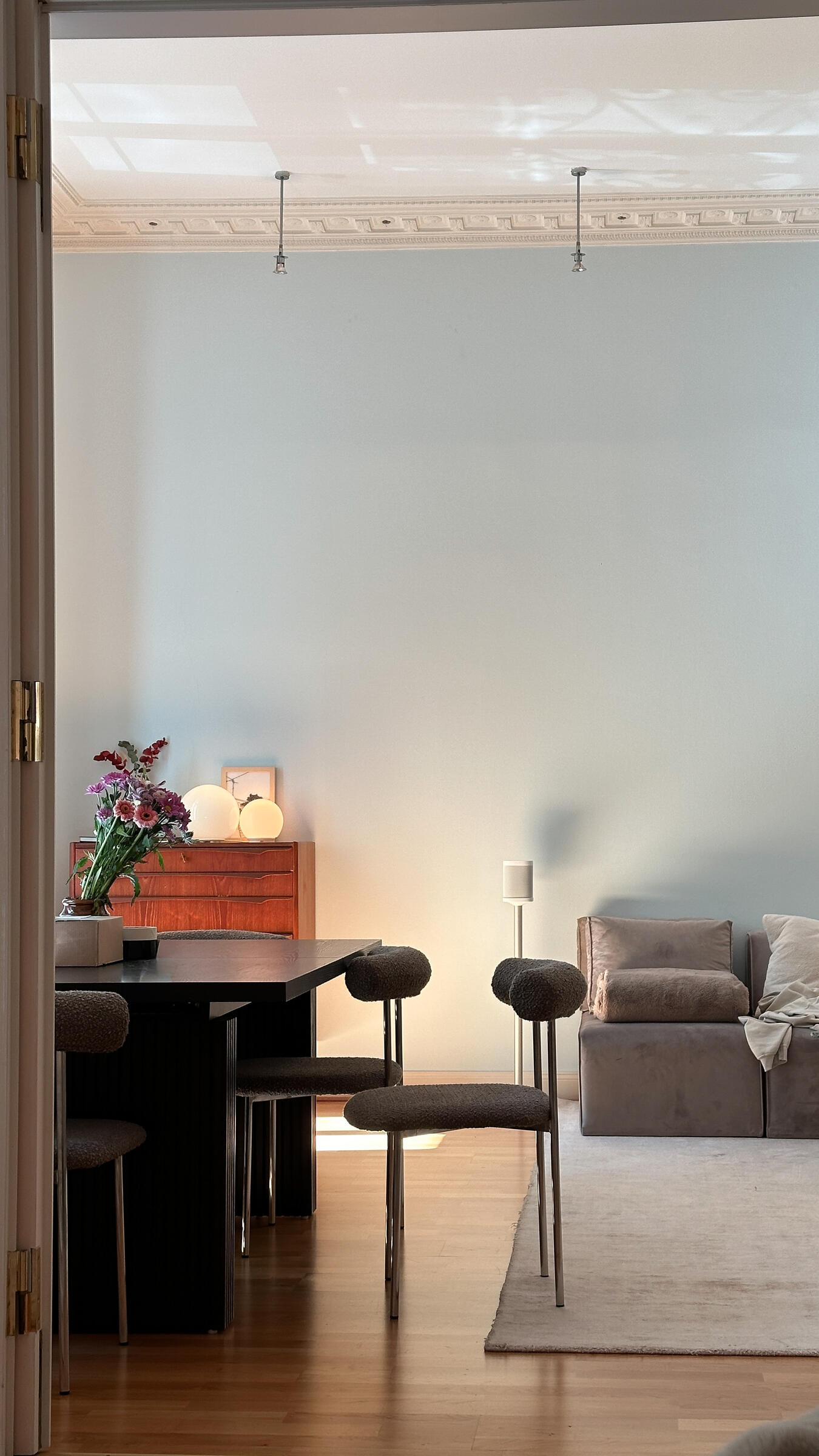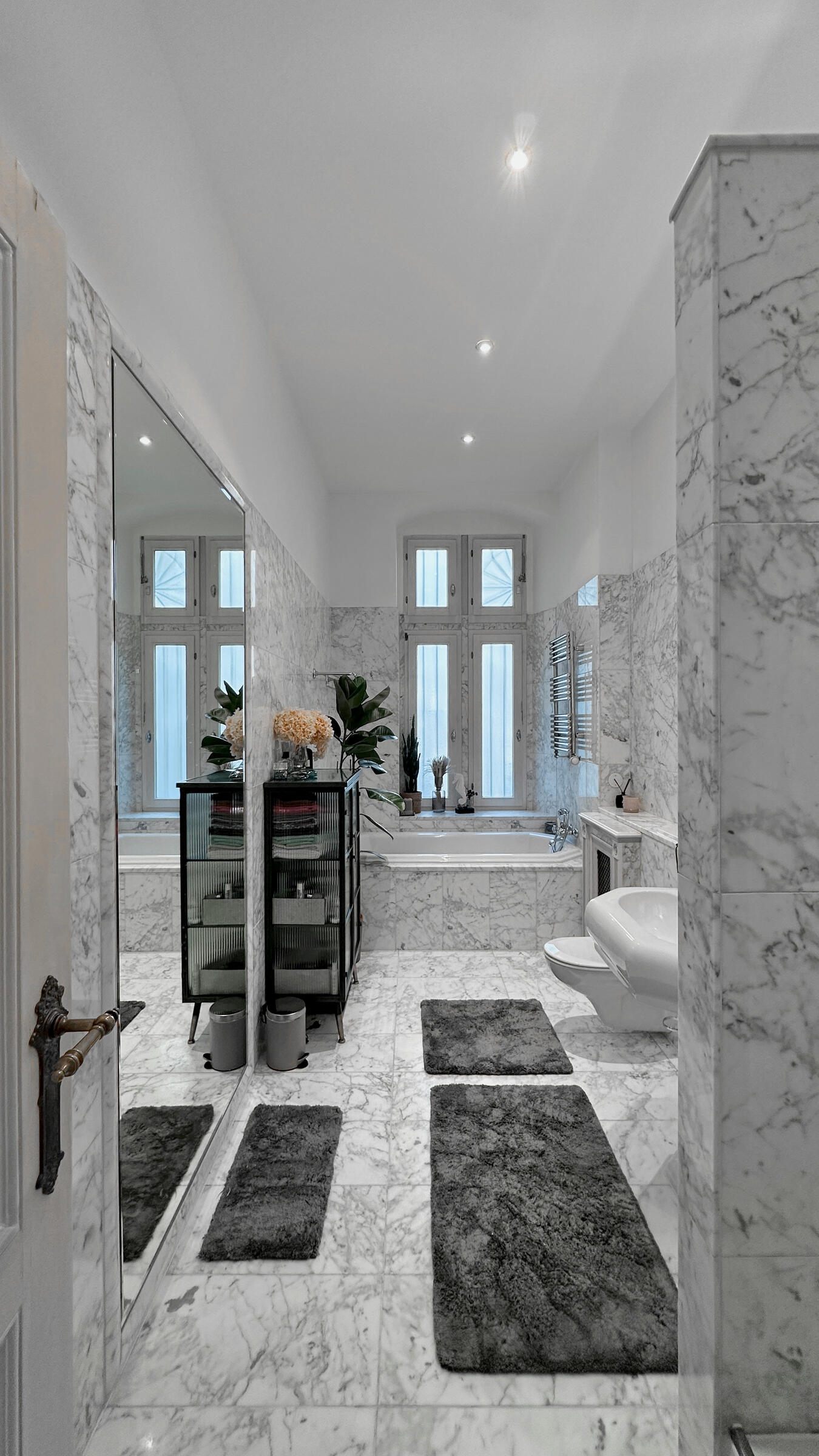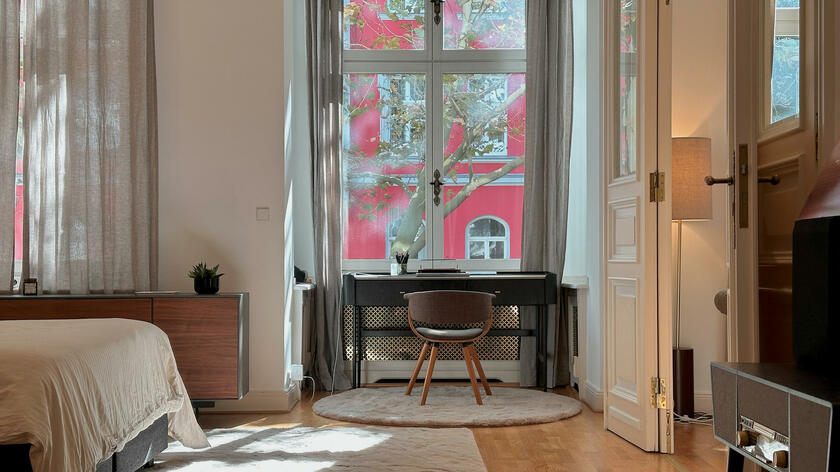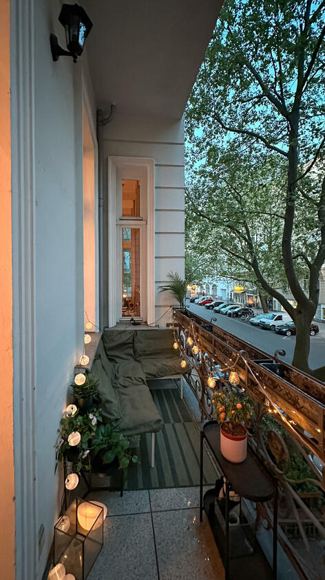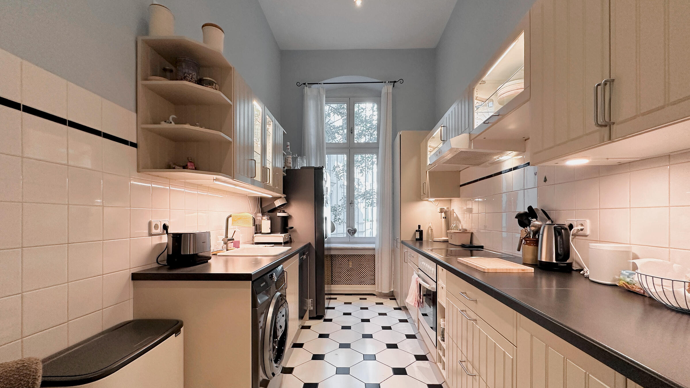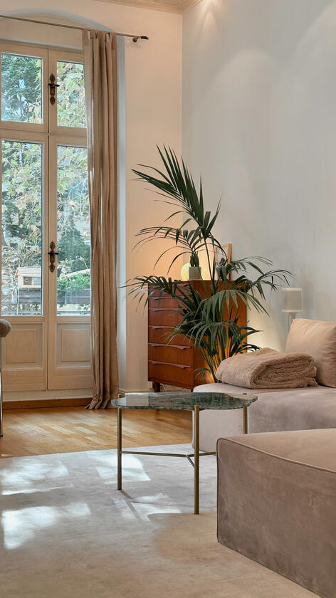 Die helle Altbauwohnung befindet sich in Schöneberg und bietet mit ihrer Mischung aus klassischer Architektur und moderner Inneneinrichtung ein stilvolles Ambiente. Der offene Wohn- und Essbereich zeichnet sich durch hohe Decken, edle Stuckverzierungen und große Flügeltüren aus. Der hochwertige Holzboden ergänzt das minimalistische und zugleich gemütliche Möbeldesign. Die Küche kombiniert moderne Ausstattung mit einem charmanten, klassischen Design. Schwarze und weiße Fliesen, offene Regale und eine großzügige Fensterfront schaffen eine helle und freundliche Atmosphäre. Das großzügige Schlafzimmer bietet ein elegantes Setting mit einer Kombination aus minimalistischem Design und klassischen Stilelementen. Die hohen Fenster lassen viel Licht herein und schaffen eine beruhigende Atmosphäre. Das moderne Badezimmer ist mit Marmorfliesen ausgestattet. Ein stilvoller, langer Flur mit eleganter Wandverzierung und Einbauschränken verbindet die verschiedenen Räume der Wohnung. Die dezenten Farbtöne und der hölzerne Boden harmonieren perfekt mit der modernen Beleuchtung, was dem gesamten Bereich eine zeitlose Eleganz verleiht.