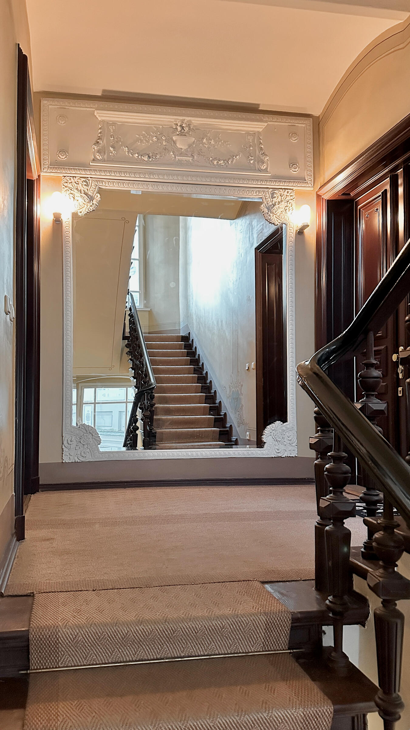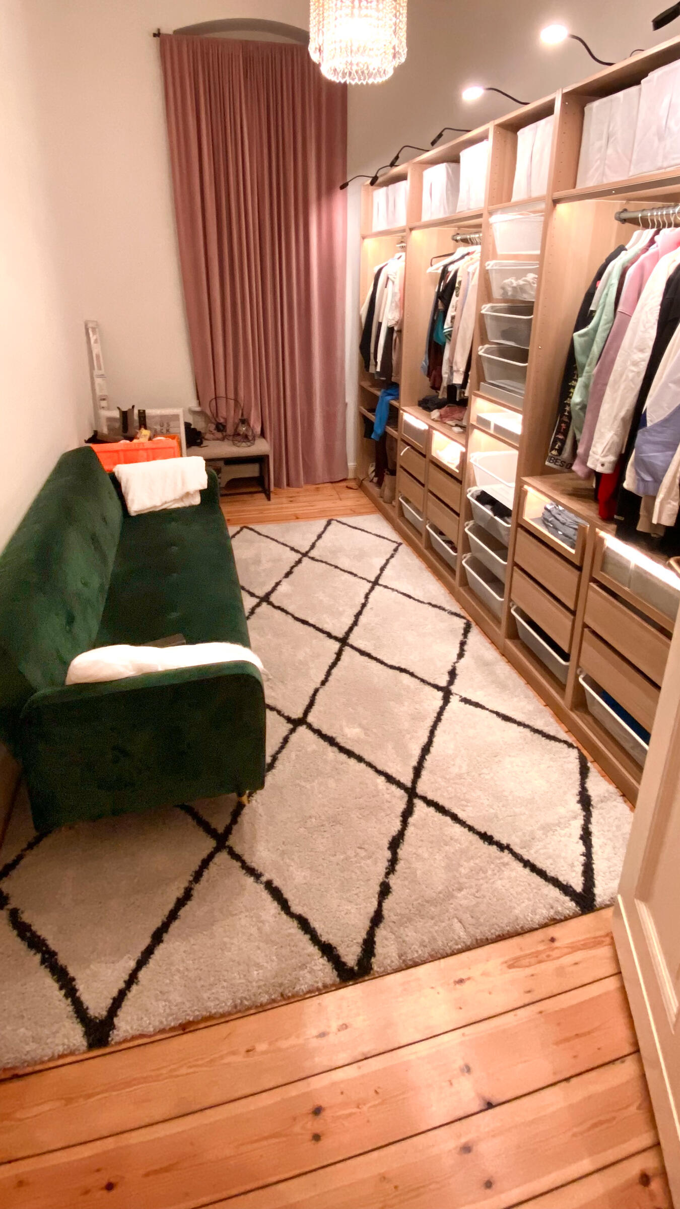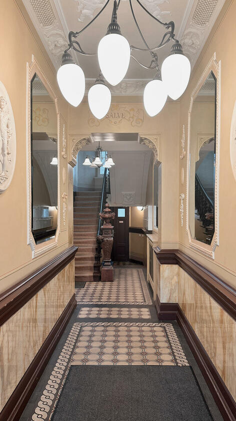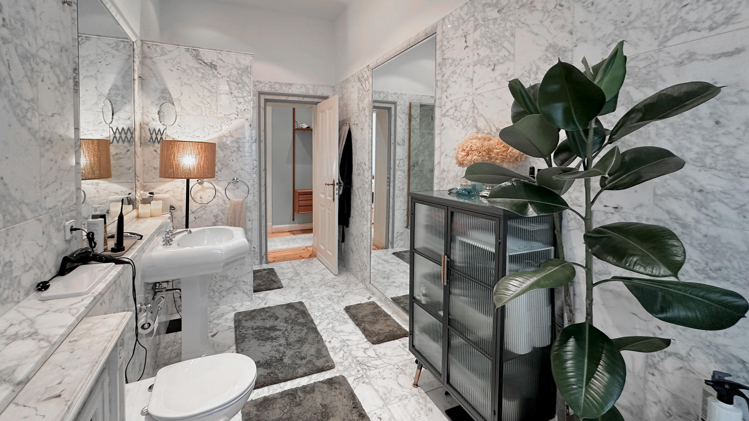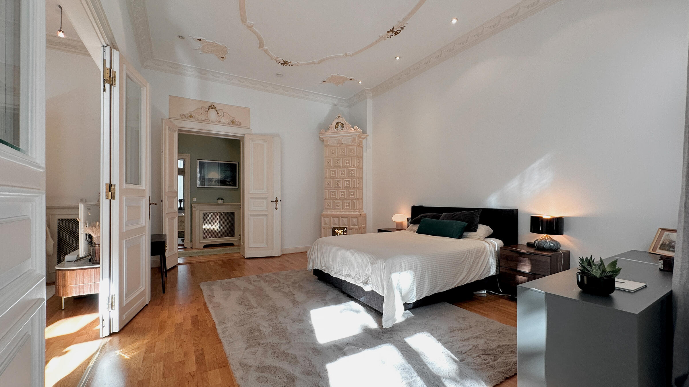 Die helle Altbauwohnung befindet sich in Schöneberg und bietet mit ihrer Mischung aus klassischer Architektur und moderner Inneneinrichtung ein stilvolles Ambiente. Der offene Wohn- und Essbereich zeichnet sich durch hohe Decken, edle Stuckverzierungen und große Flügeltüren aus. Der hochwertige Holzboden ergänzt das minimalistische und zugleich gemütliche Möbeldesign. Die Küche kombiniert moderne Ausstattung mit einem charmanten, klassischen Design. Schwarze und weiße Fliesen, offene Regale und eine großzügige Fensterfront schaffen eine helle und freundliche Atmosphäre. Das großzügige Schlafzimmer bietet ein elegantes Setting mit einer Kombination aus minimalistischem Design und klassischen Stilelementen. Die hohen Fenster lassen viel Licht herein und schaffen eine beruhigende Atmosphäre. Das moderne Badezimmer ist mit Marmorfliesen ausgestattet. Ein stilvoller, langer Flur mit eleganter Wandverzierung und Einbauschränken verbindet die verschiedenen Räume der Wohnung. Die dezenten Farbtöne und der hölzerne Boden harmonieren perfekt mit der modernen Beleuchtung, was dem gesamten Bereich eine zeitlose Eleganz verleiht.