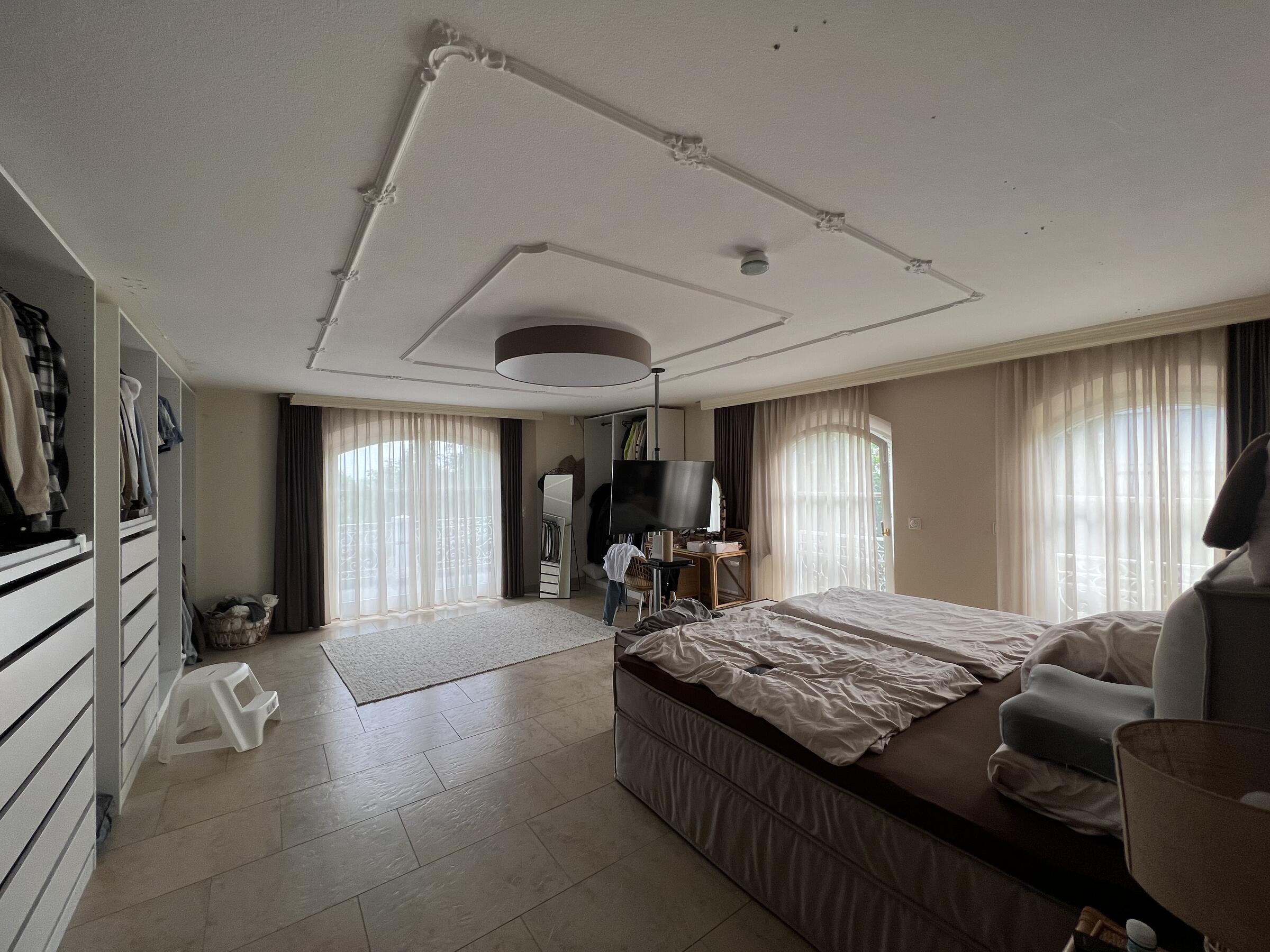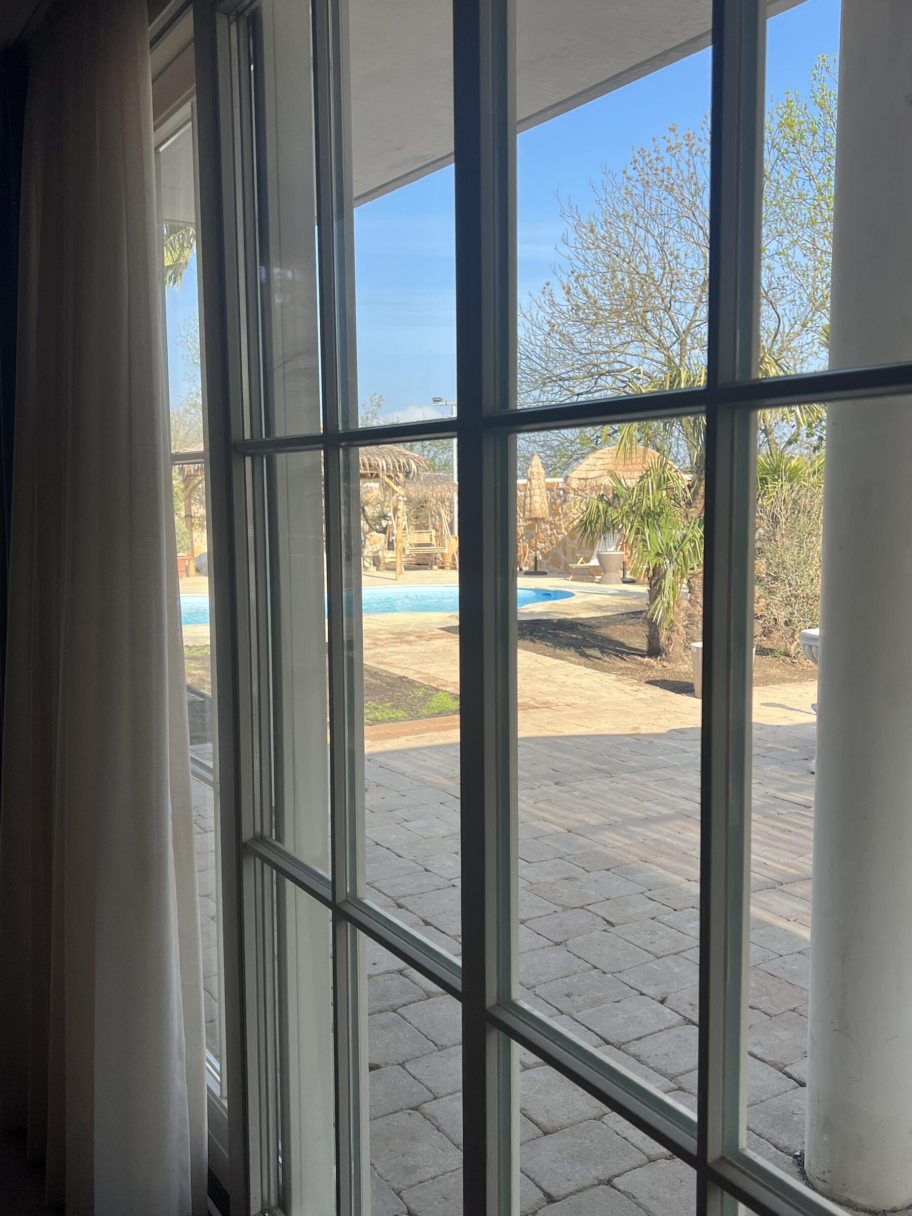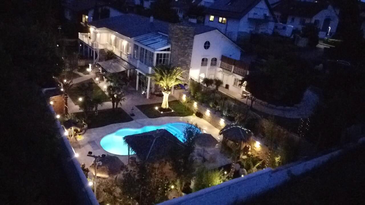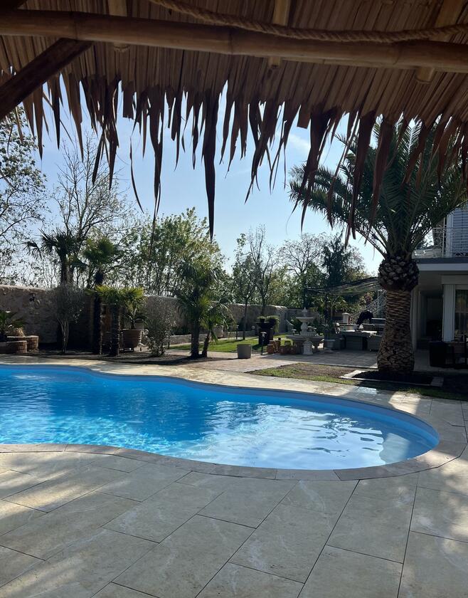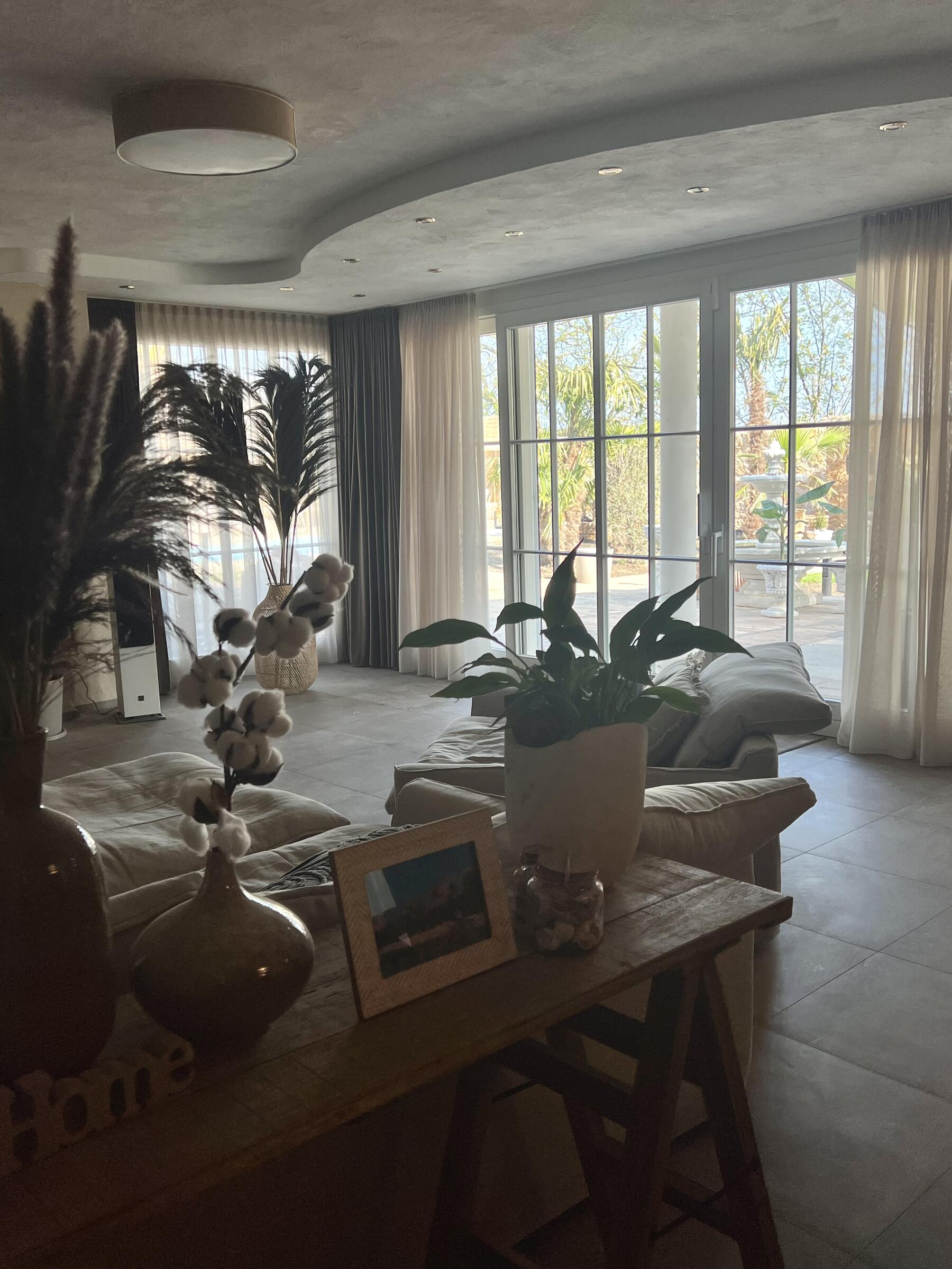 Unser Haus bietet viele große und offene Räume mit mediterranem Einrichtungsstil. Die Räume sind hell und lichtdurchflutet. Die Fenster der Räume sind abdunkelbar. Der großzügige Wohn- und Essbereich mit seiner modernen Küche hat direkten Zugang zum Garten. Der große und mediterran gestaltete Garten bietet einen Pool, Palmen und Olivenbäume. Die Terrasse wird von einer Pergola trocken gehalten. Der Garten ist durch seine Lage nach hinten für niemanden einsehbar und ermöglicht somit ungestörte Produktionen. Parkplätze gibt es im Außenbereich und auf der Straße vor unserem Grundstück.