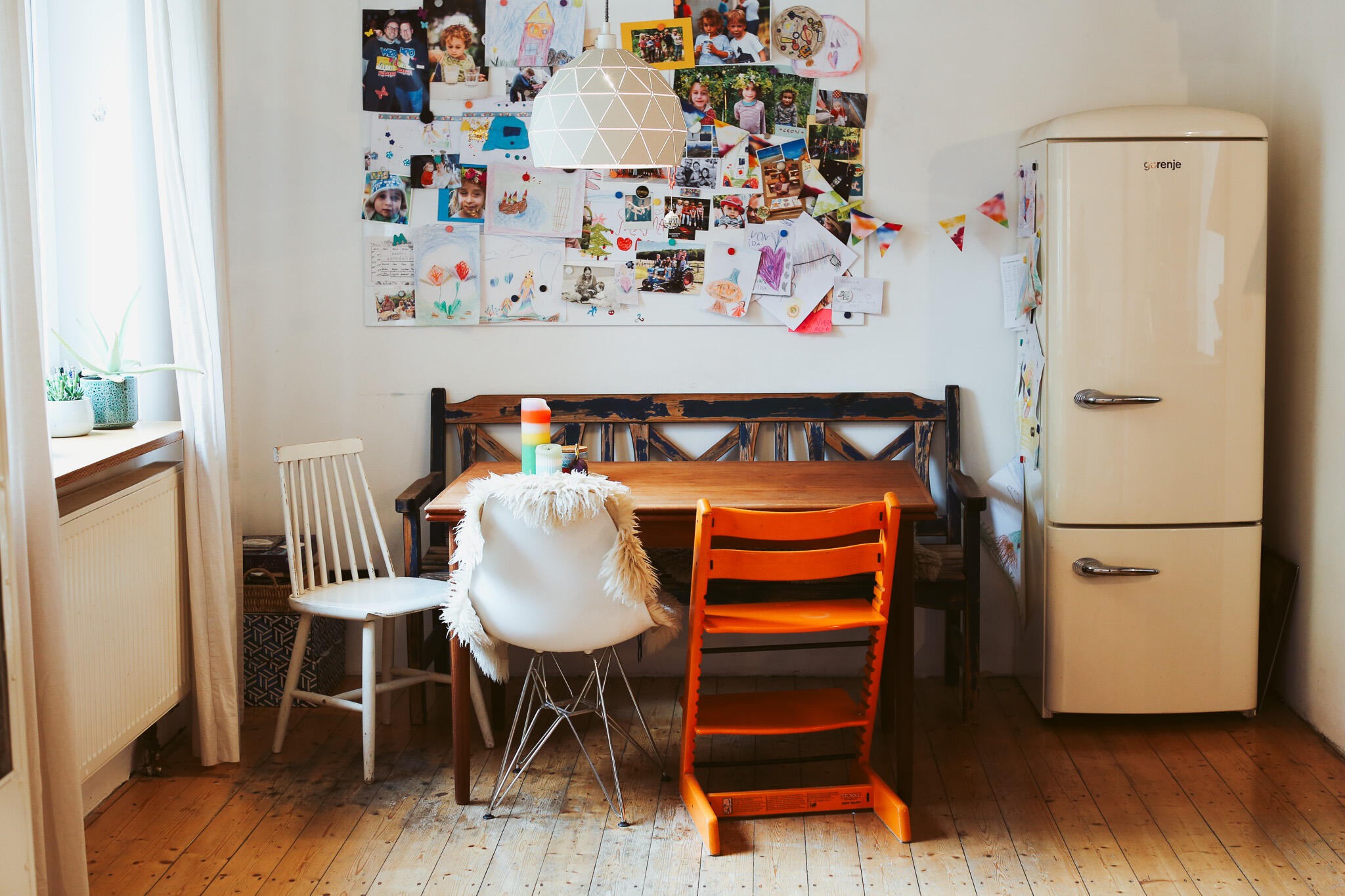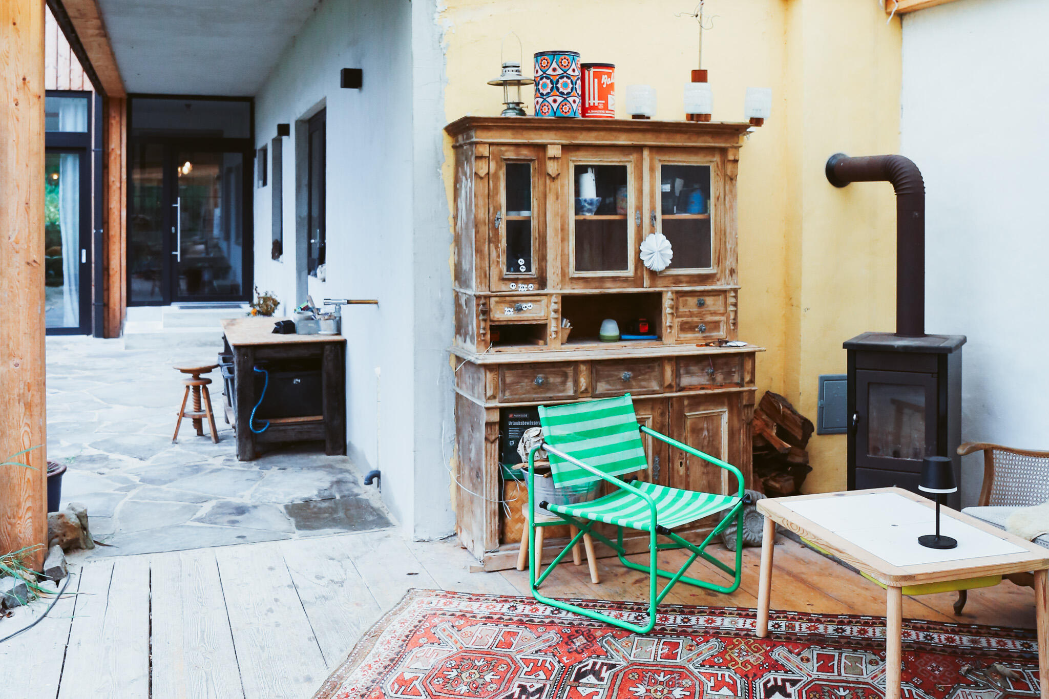 Im Inneren unseres Hauses erwartet Sie ein offener und lichtdurchfluteter Wohn- und Essbereich mit direktem Zugang zum Garten. Große Fenster schaffen fließende Übergänge. Die Einrichtung vermittelt eine warme Atmosphäre. Die Räume dürfen nach Absprache umgestaltet werden. Im Außenbereich stehen neben dem großzügig angelegten Garten auch eine überdachte Terrasse mit Kamin und einer gemütlichen Sitzecke zur Verfügung. Die an die Terrasse angrenzende Werkstatt kann ebenfalls für Produktionen genutzt werden. Sowohl direkt vor dem Haus als auch in der Straße können mehrere Autos geparkt werden.
