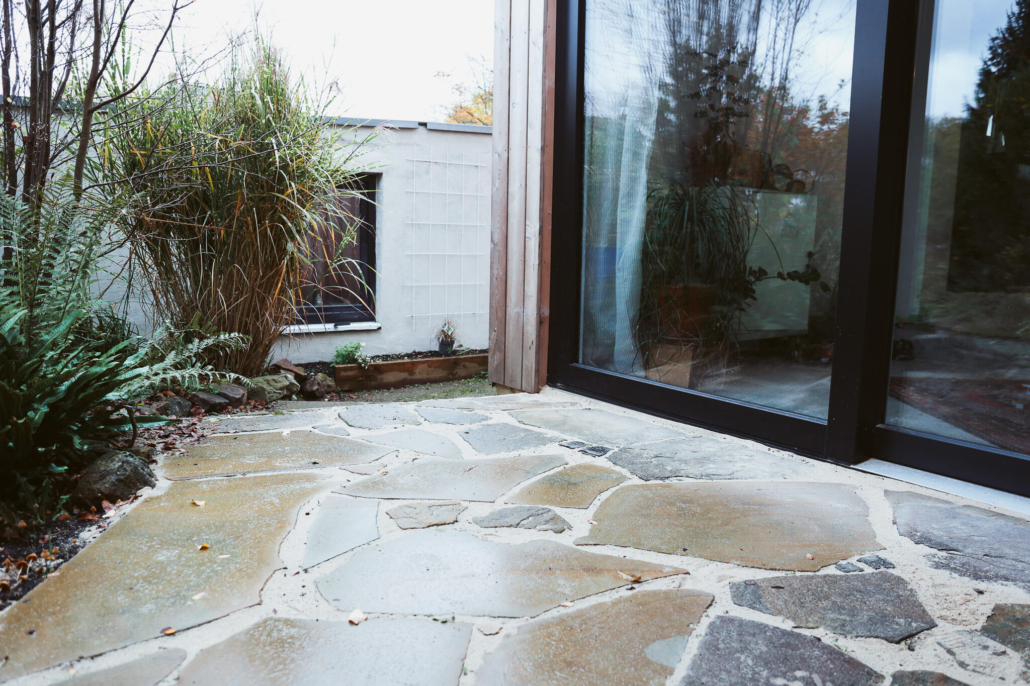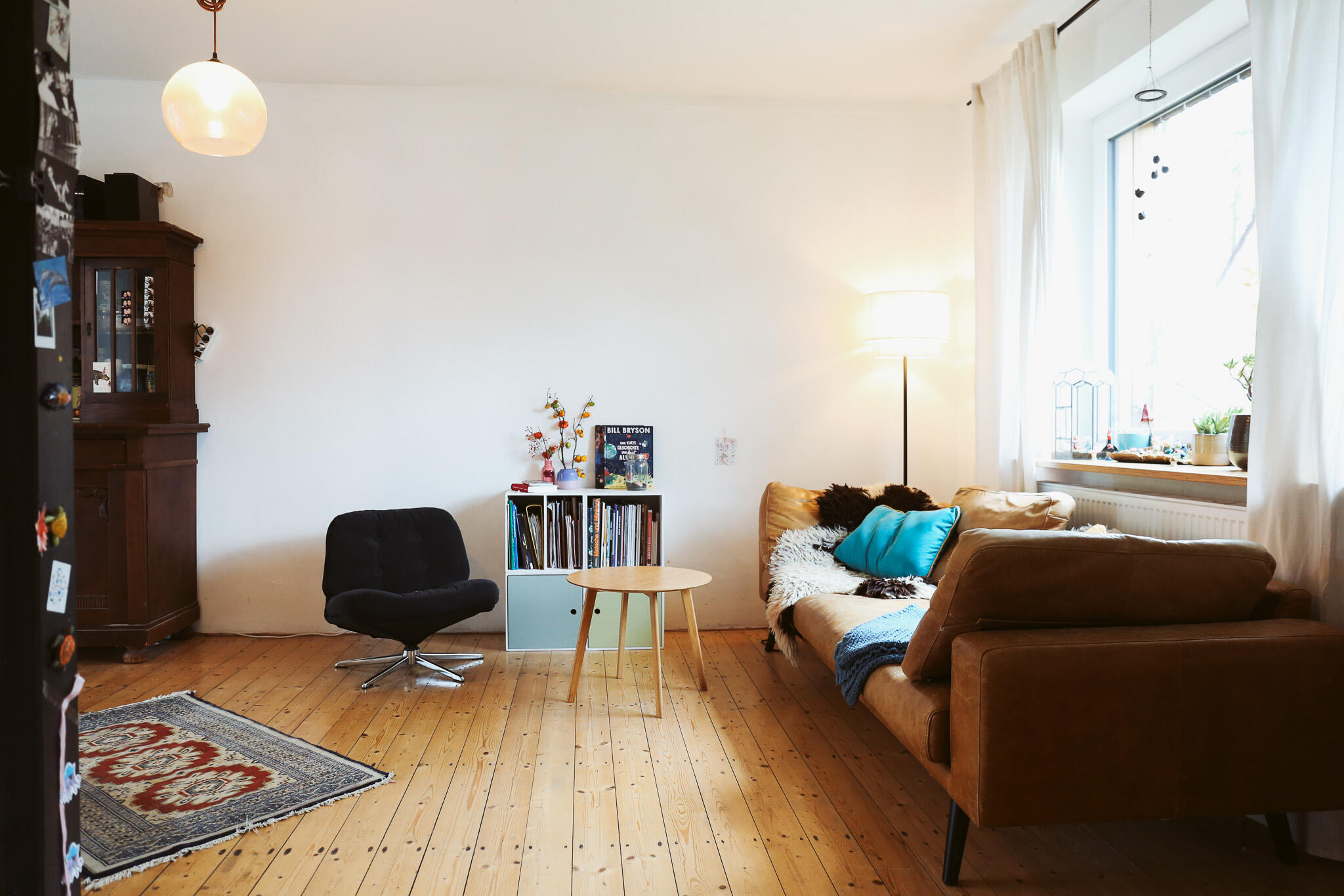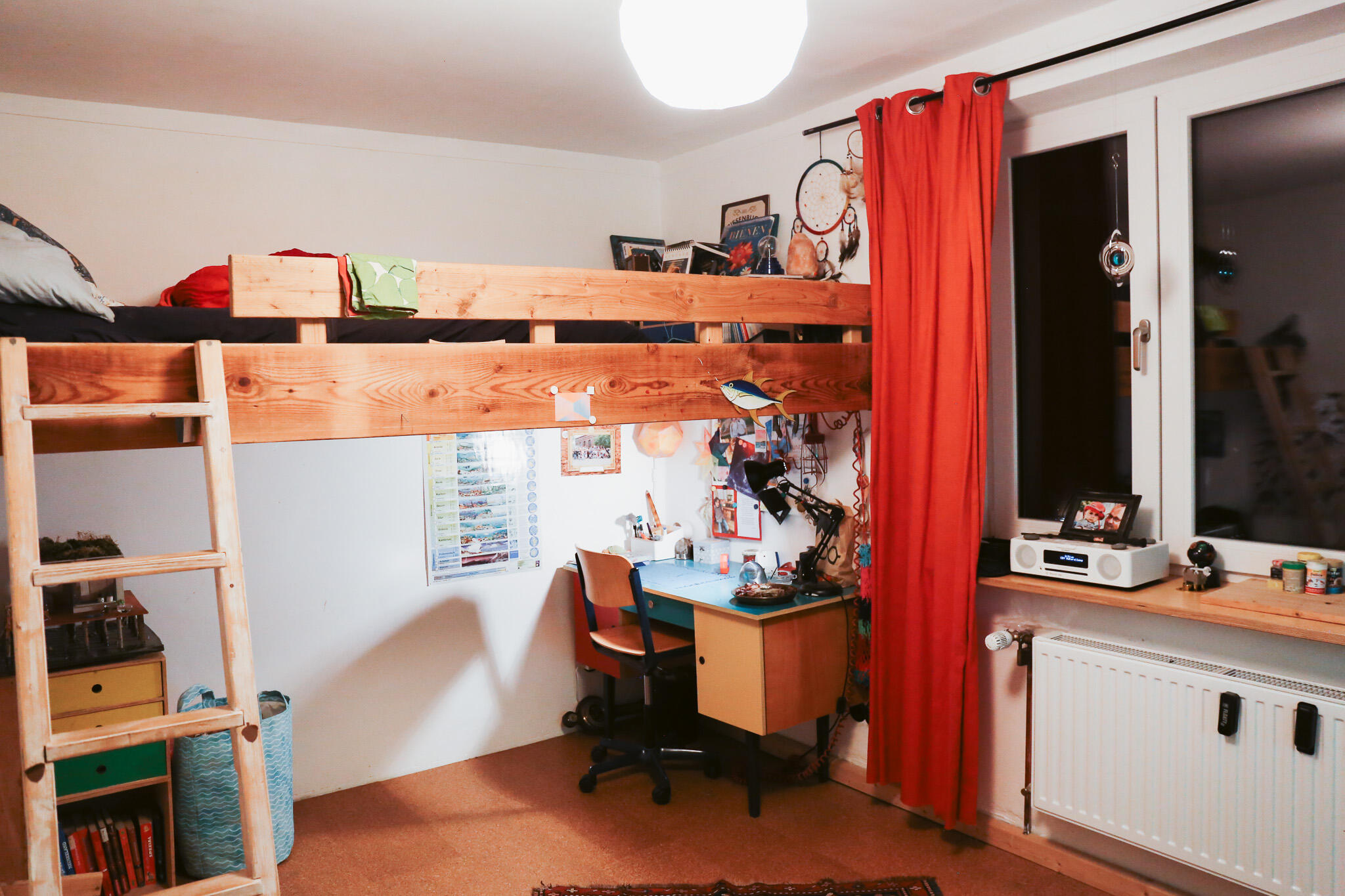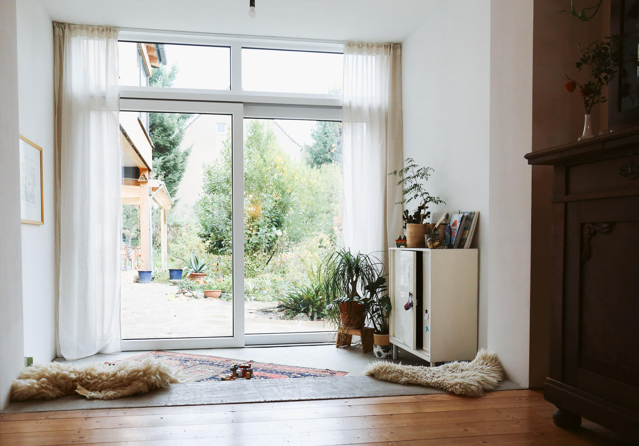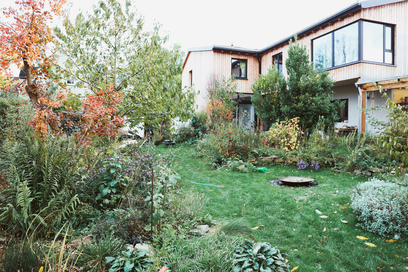 Unsere klimafreundlich sanierte Doppelhaushälfte befindet sich in einer ruhigen Wohngegend. Das Haus hat eine Holzfassade und ein vollständig begrüntes Dach.