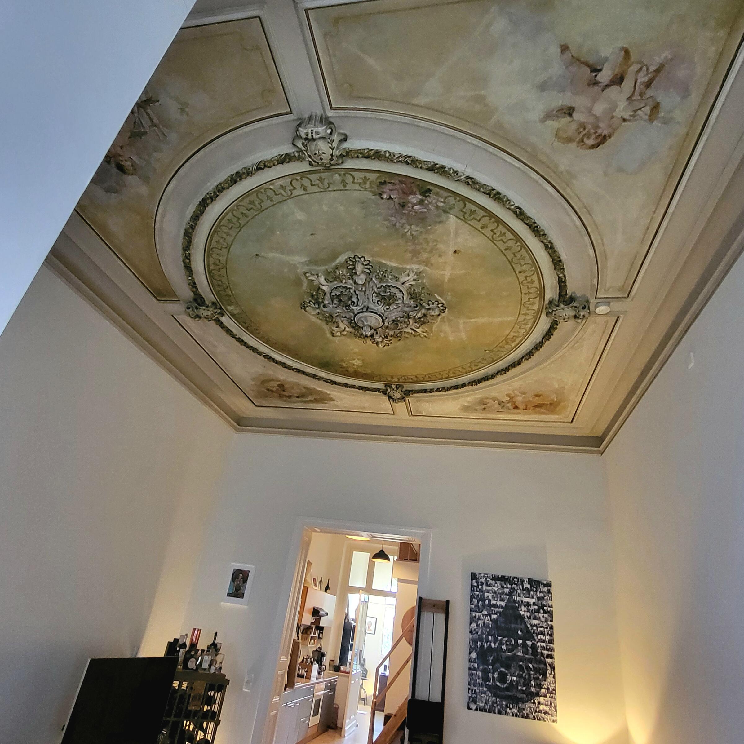 Meine Wohnung wurde vor 5 Jahren saniert und befindet sich in einem Wohnhaus an einer ruhigen Straße, nicht weit vom Rhein entfernt. Die Räume der Wohnung haben eine Deckenhöhe von 4,5 m. Die großen Fenster des Wohnzimmers können mit Hilfe von Jalousien verdunkelt werden. An der Decke des Wohnzimmers befindet sich restaurierter Stuck. Auf den Böden der Wohnräume ist helles Laminat verlegt. Das kleine Badezimmer wurde gefliest. Im Außenbereich steht ein typischer Stadtgarten zur Verfügung. Parkplätze sind in unmittelbarer Nähe am Rhein nur ca. 1 Gehminute entfernt. Ebenfalls können Parkplätze vor dem Haus für Produktionen reserviert werden.