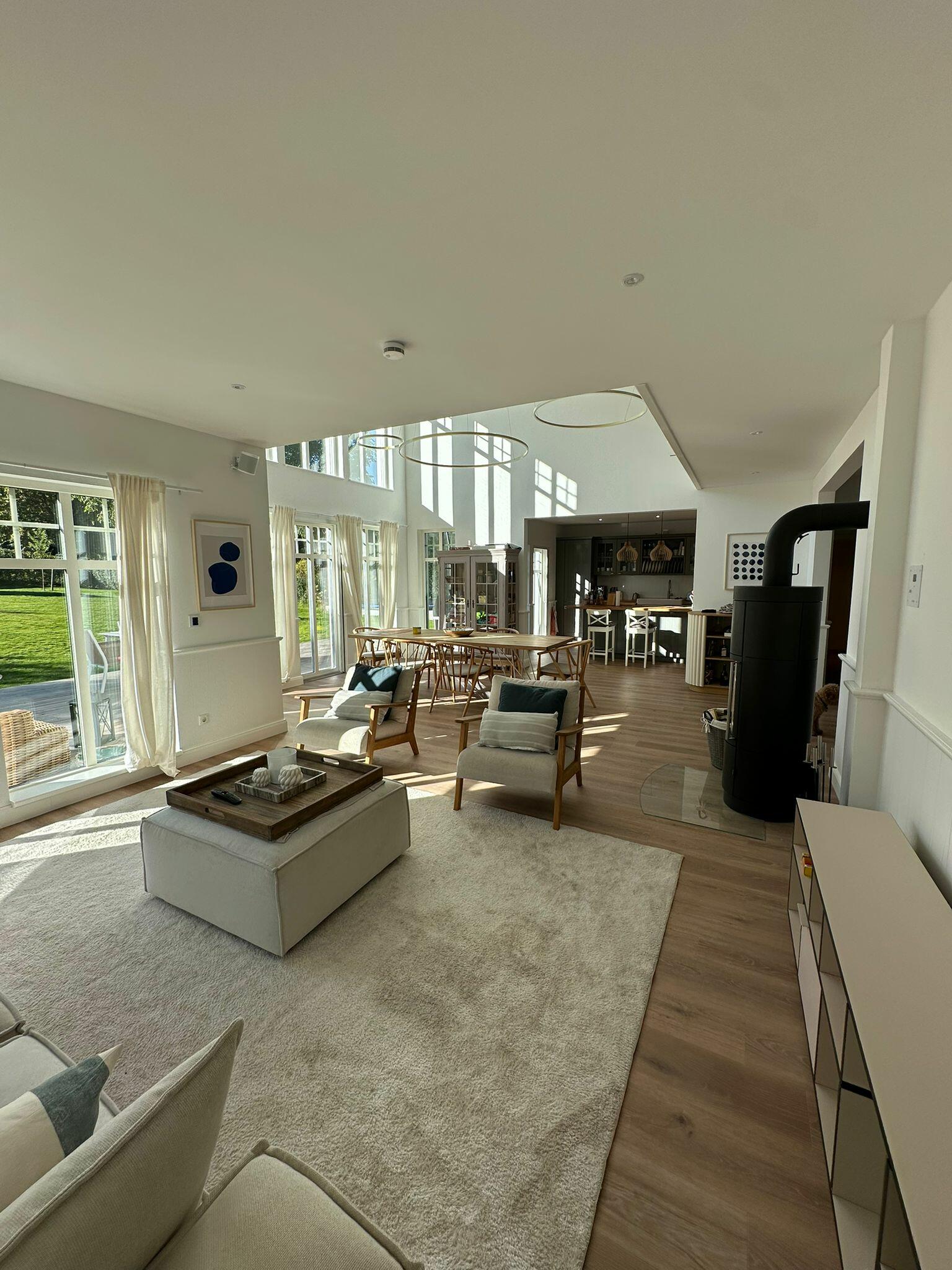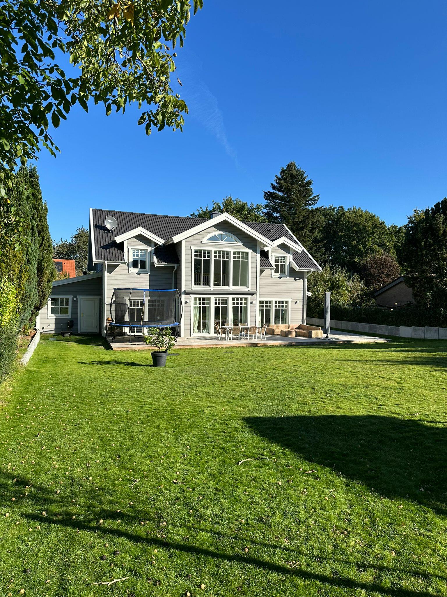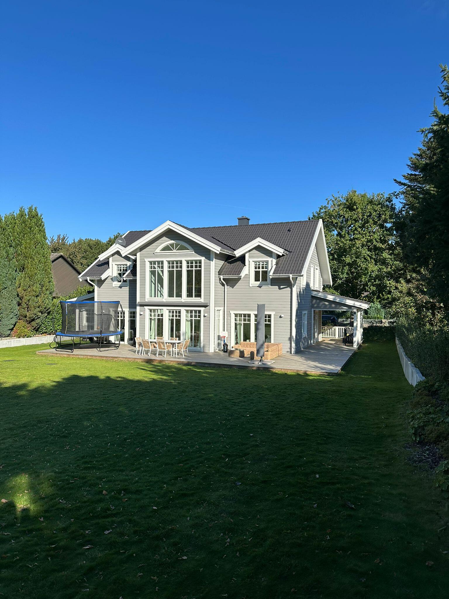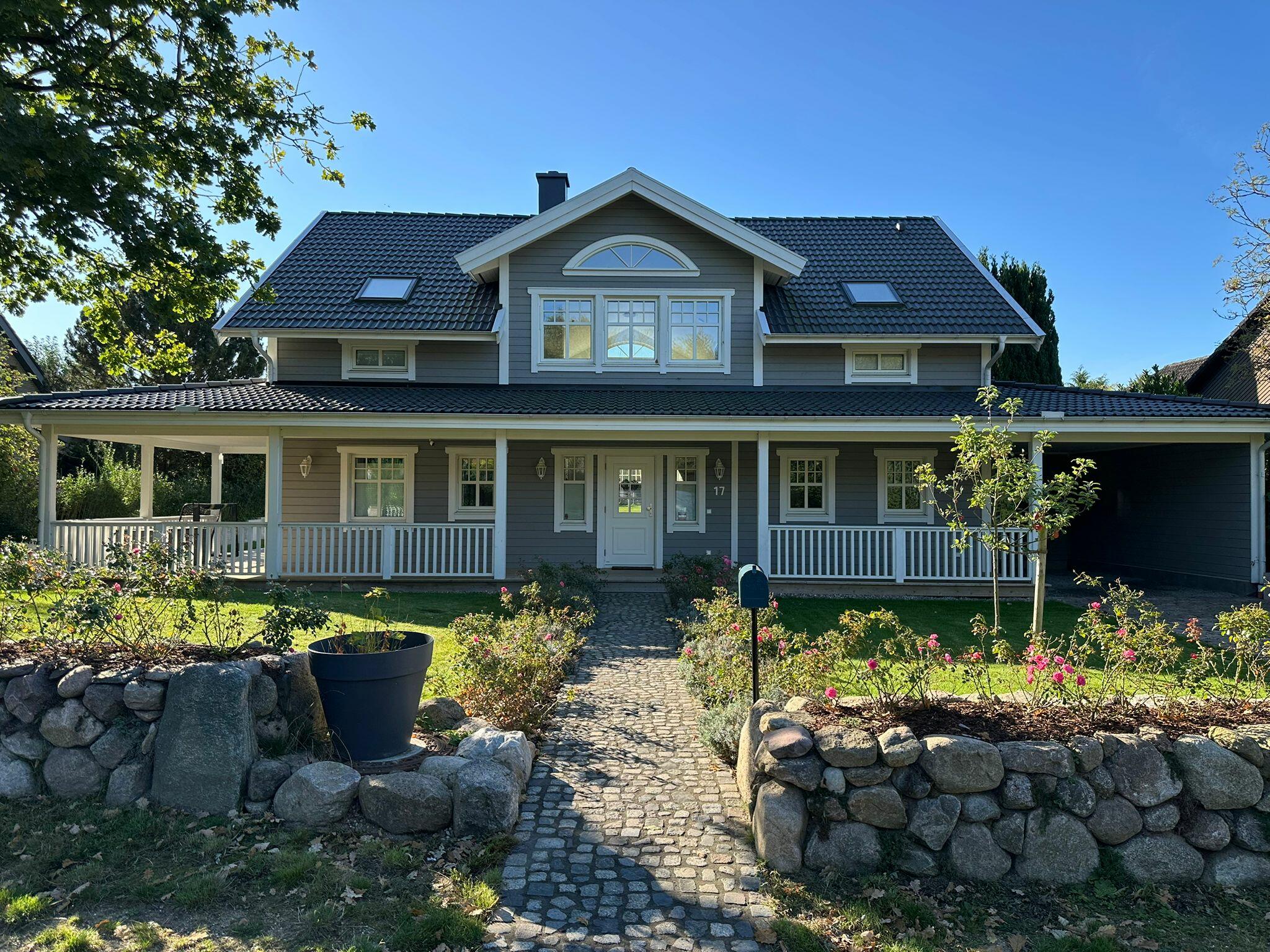 Unser charmantes Landhaus im skandinavischen Stil verbindet nordisches Design mit wohnlicher Eleganz und einer natürlichen, hellen Atmosphäre. Die hellgraue Holzfassade, die großen Sprossenfenster und die umlaufende Veranda verleihen dem Haus seinen unverwechselbaren Charakter. Der lichtdurchflutete Wohn- und Essbereich öffnet sich zum weitläufigen Garten mit Terrasse und gepflegter Rasenfläche. In einer ruhigen Wohngegend gelegen, mit Parkplätzen direkt vor dem Grundstück und guten Zufahrtsmöglichkeiten bietet unser Haus ideale Voraussetzungen für Produktionen.