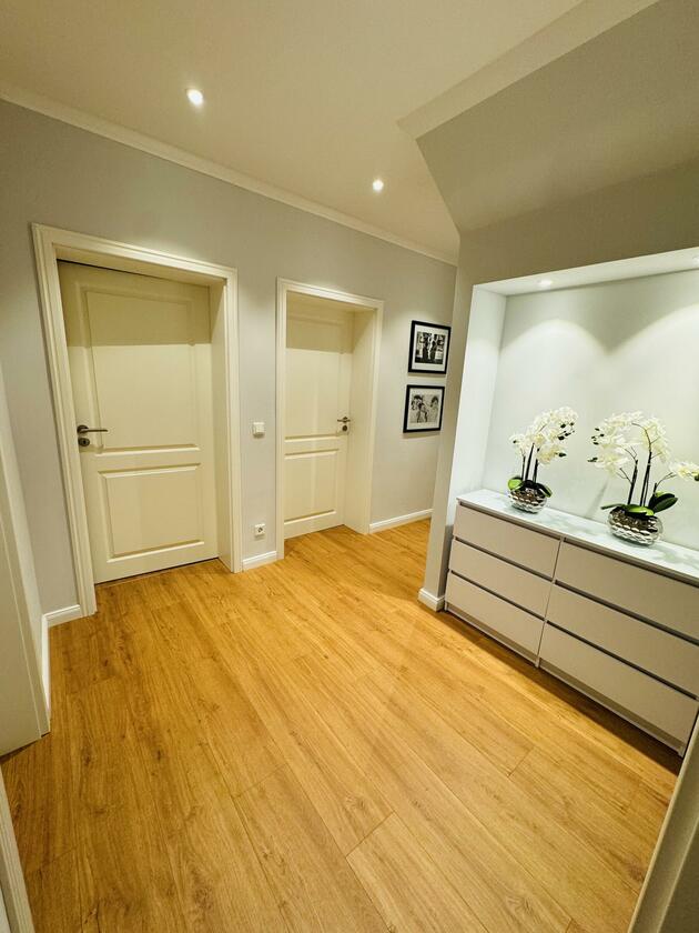 Der gesamte Wohnraum ist mit hochwertigem holzfarbenen Vinyl ausgestattet. Die Räume im Hochparterre verfügen über eine Fußbodenheizung. Die Lichtgestaltung ist dimmbar und kann über eine Smart-Home-Technologie gesteuert werden.