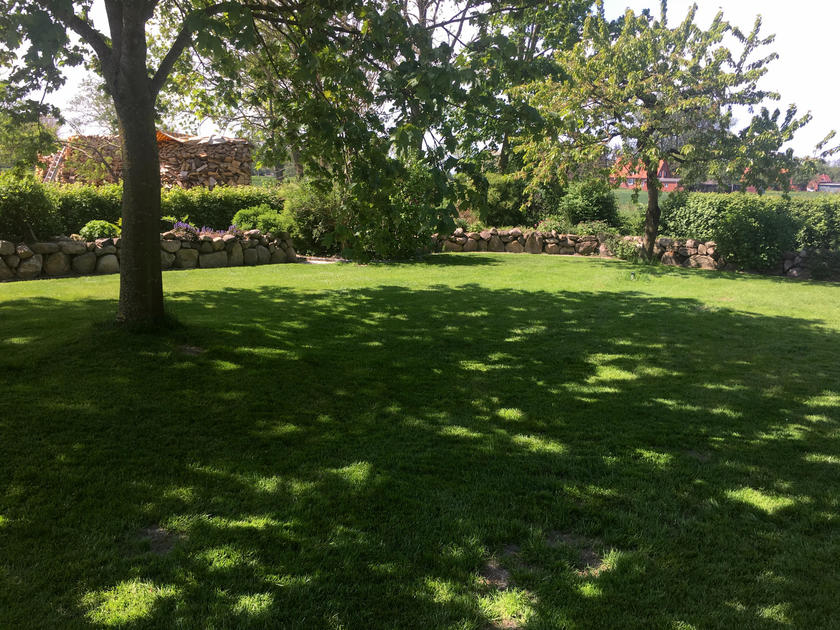 Der Garten hat ca. eine Fläche von 2200 m² und wird größten Teils von alten großen bepflanzen Feldsteinen und einer Hecke umsäumt. Im Garten selbst finden sich alte Kirschbäume, und ein großer Ahorn, der im Sommer viel Schatten spendet. Neu angelegt ist ein kleiner Teich mit Springbrunnen, gleich daneben die überdachte und durch eine Steingabionenwand windgeschütze Grillterrasse im modernen Anthrazit. Mit Zugang zum Keller.