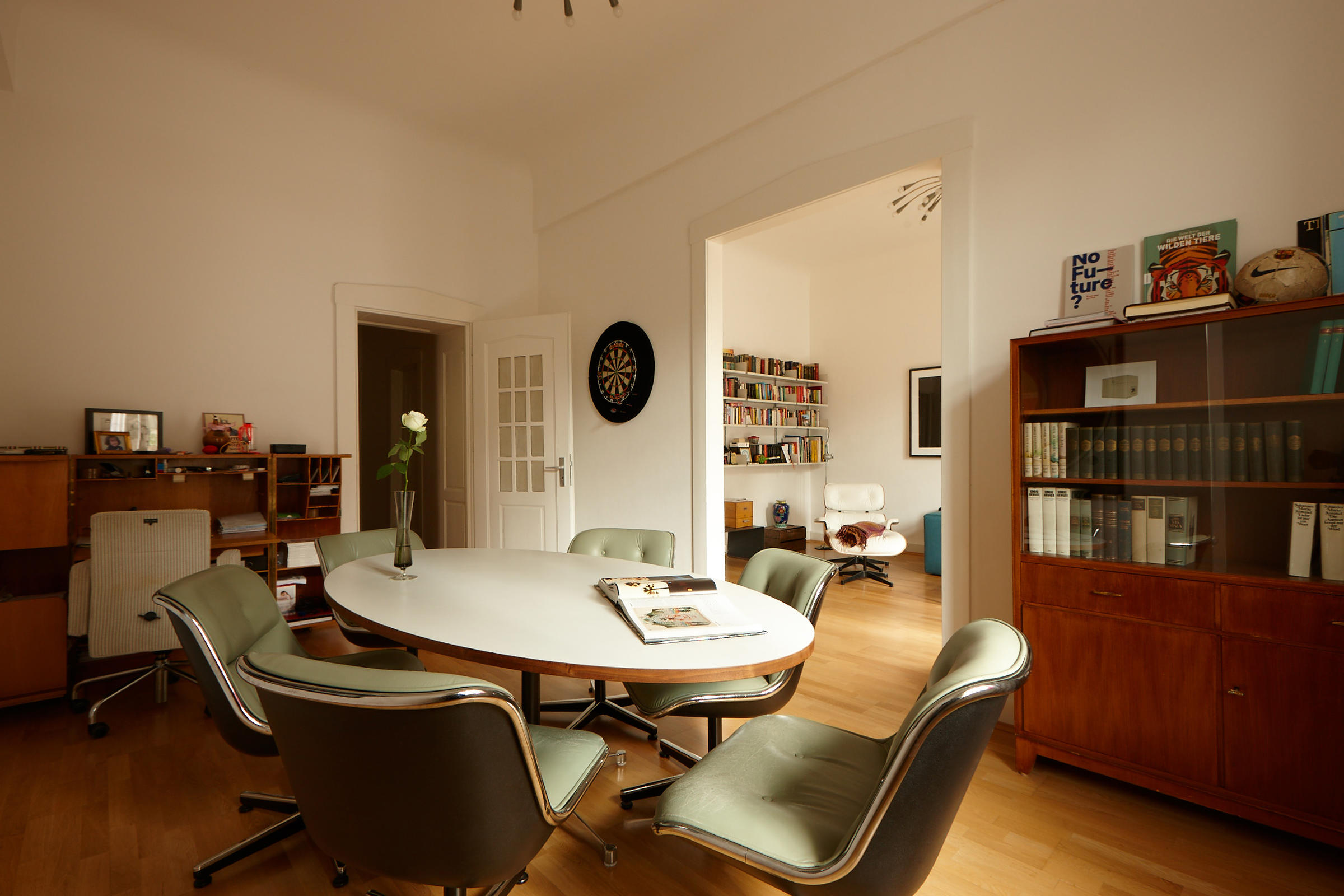 Außergewöhnliche Altbauwohnung im Düsseldorfer Stadtteil Oberkassel mit einer Gesamtgröße von 100 m², gestaltet von einer renommierten Innenarchitektin. Ganz besonders zu erwähnen sind das spektakuläre und stimmige Mobiliar im Wohn- und Essbereich (Eames Aluchairs, Eames Loungechair, Pollock Konferenzstühle etc., alle Original) und die hochwertige Fotokunst an den meisten Wänden. Die hohen Decken gestalten die Wohnung besonders großzügig, zudem sind der Wohn- und Essbereich offen.Technisch absolut hochwertig (Sonos-System, LCD TV-Geräte, Küchen-Mixer, Siebträger-Kaffeemaschine und Mühle, Miele Küchengeräte).