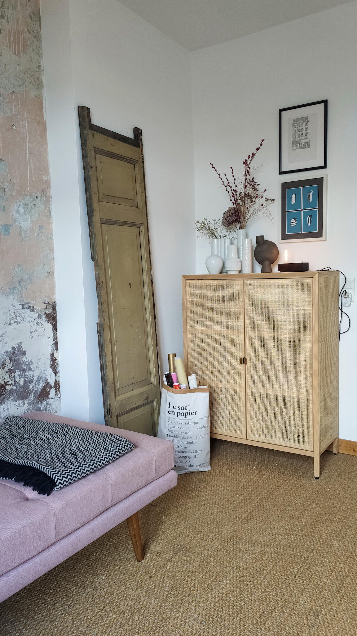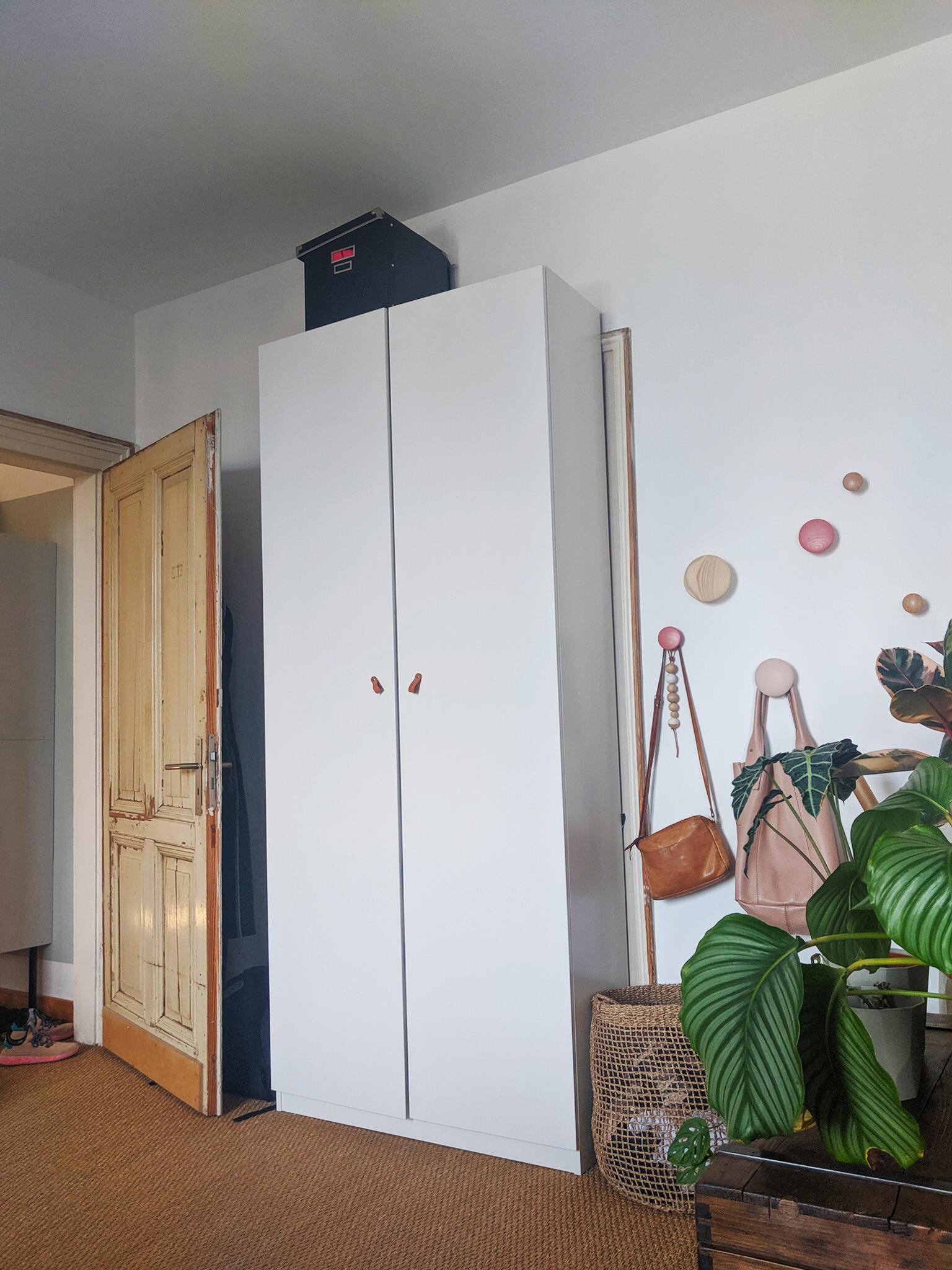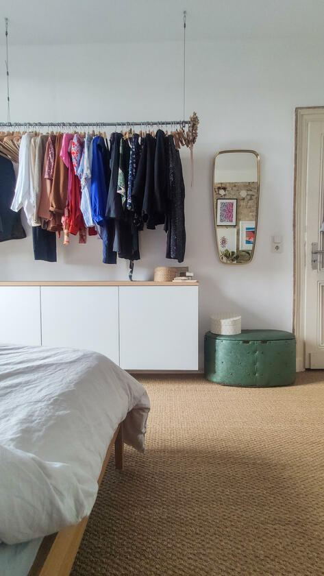 Auf der gegenüberliegenden Seite der Wohnung befinden sich Schlaf- und Gästezimmer. Klein aber fein ist das Gästezimmer mit einer unverwechselbaren Wand, welche die Farbschichten der vergangenen 140 Jahre zum Vorschein bringt, denn genau so alt ist das Haus. Das rosa Daybed passt perfekt zum Look. Vom Gästezimmer gelangt man auf den kleinen Balkon mit urbanem Blick auf die Gleise. Das Schlafzimmer beherbergt neben einem modernen Holzbett, eine alte Truhe, welche vor der freigelegten Backsteinwand die Pflanzen in Szene setzt, sowie eine offene Kleiderschrank-Situation.
