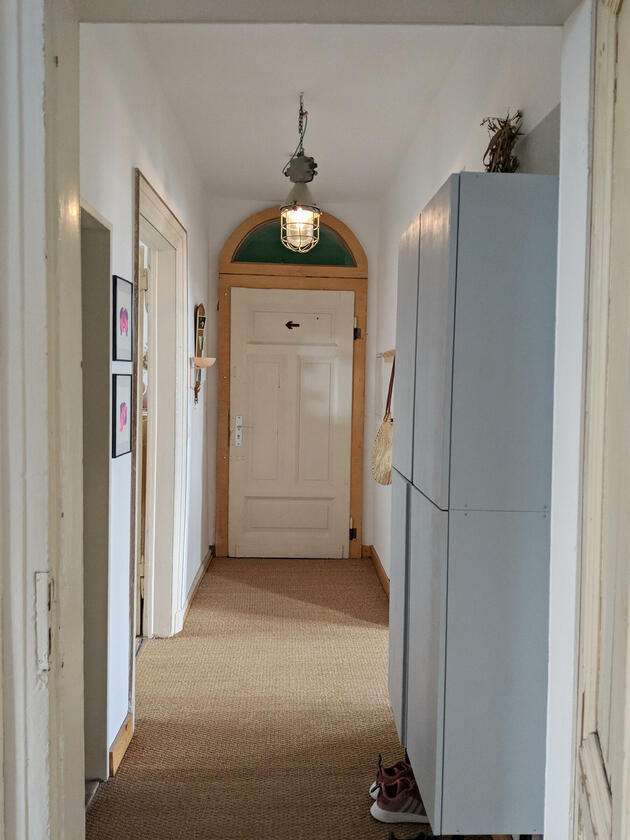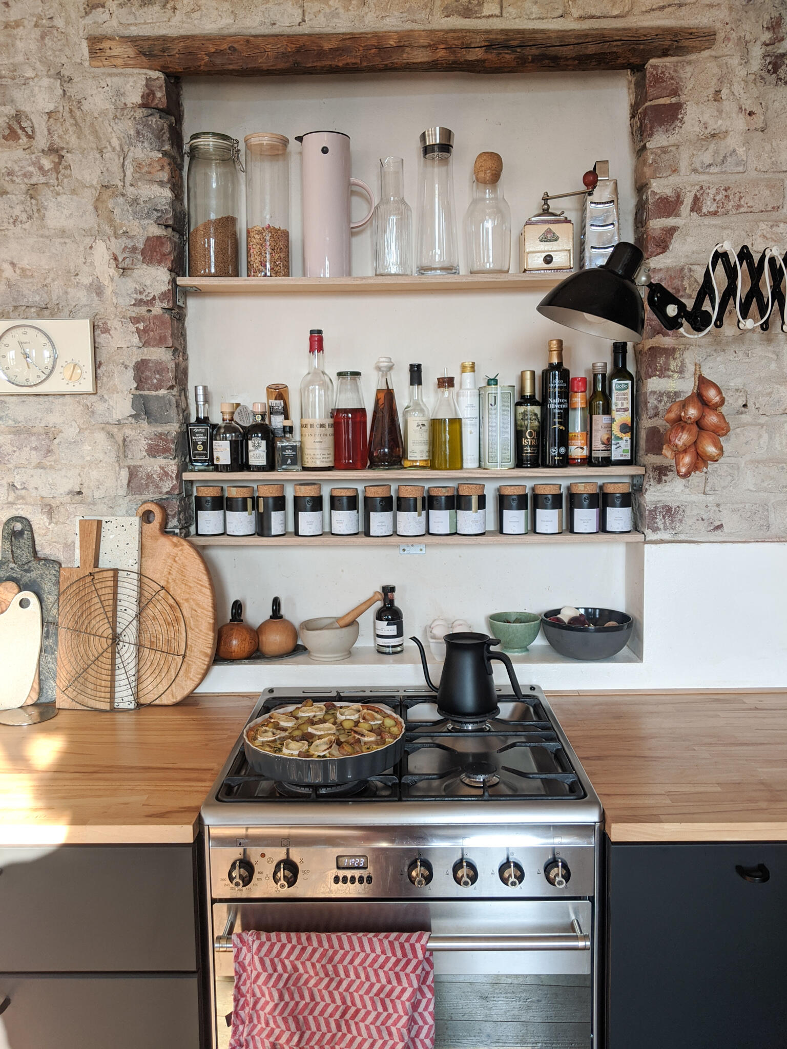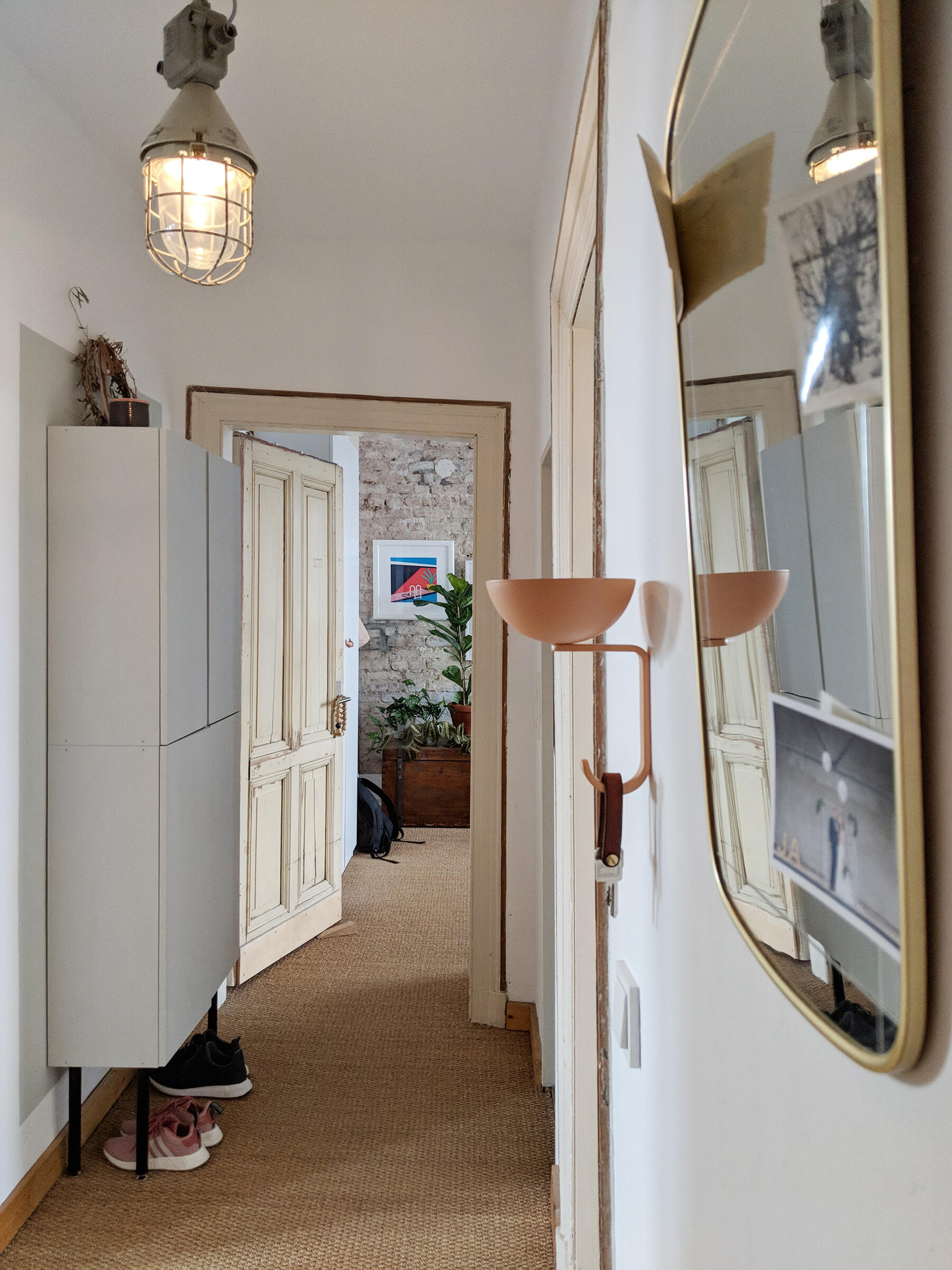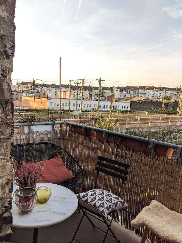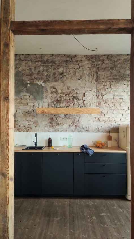 Was unsere Wohnung in Düsseldorf so besonders macht, ist eine absolut einzigartige Atmosphäre durch offene Balken, Backsteinwände und Dielenboden in Kombination mit "echtem" Leben. Zwar haben wir berufsbedingt als Designer einen Faible für Designermöbel und besondere Accessoires, unsere Wohnung wirkt allerdings alles andere als "clean", im Gegensatz zu vielen anderen Lofts, die ausschließlich für den Zweck der Vermietung dekoriert wurden. Selbstgebaute Lampen, Erbstücke und moderne Möbelstücke wirken in Kombination authentisch und gemütlich, ohne die helle Leichtigkeit eines Lofts einzubüßen. Der Wohn-, Ess- und Küchenbereich ist durch insgesamt 4 große Fenster mit Südausrichtung, sehr hell. Deshalb haben wir uns für eine moderne matt-schwarze Küche entschieden, die in Kombination mit den Backsteinen sehr edel wirkt. Rustikale Elemente, wie unser Gasherd, die Werkbank als Coffeecorner für die Siebträgermaschine und das 60er-Jahre Buffet meiner Oma wirken als charakteristischer Kontrast zur cleanen Küchenzeile. Die großzügige Küche mit langer Tafel, bestehend aus 2 alten Tischen, wirkt sehr luftig, das Wohnzimmer mit großer Couch und Schaukelstuhl dagegen eher kuschelig.