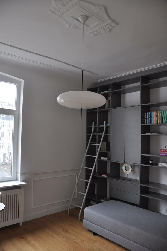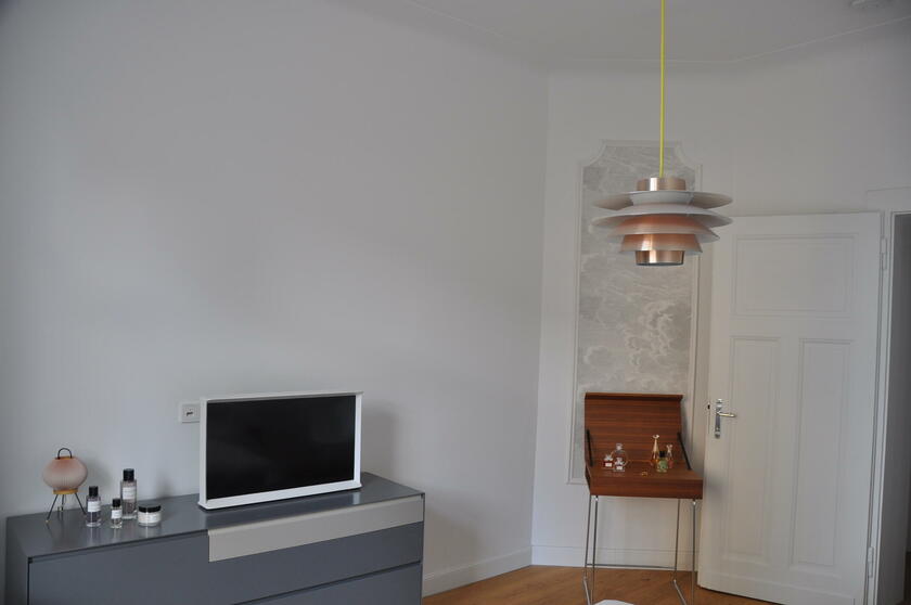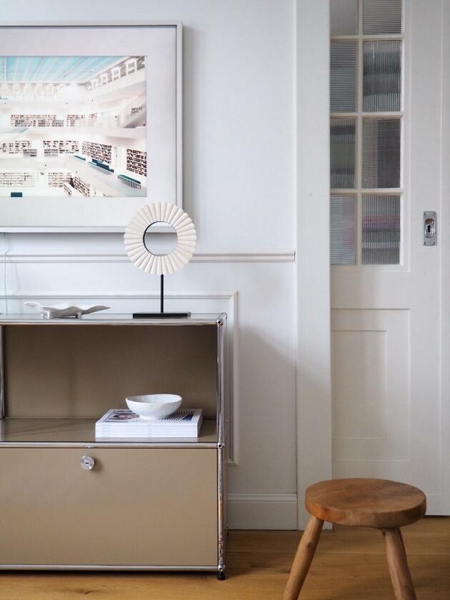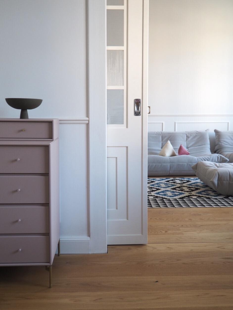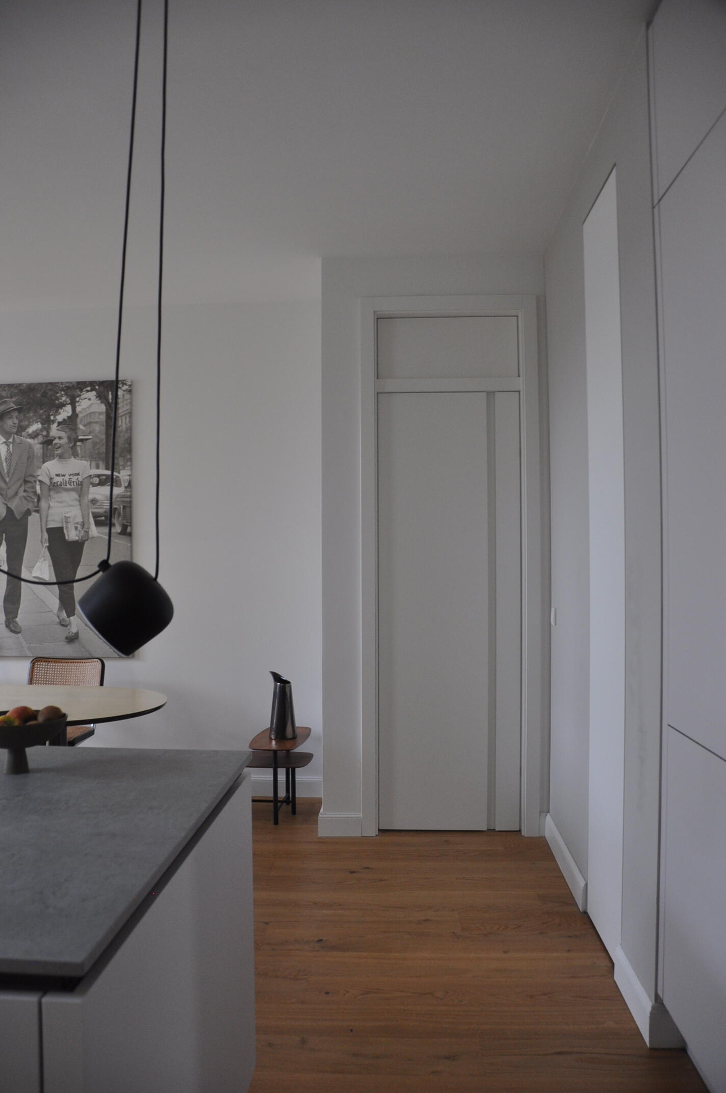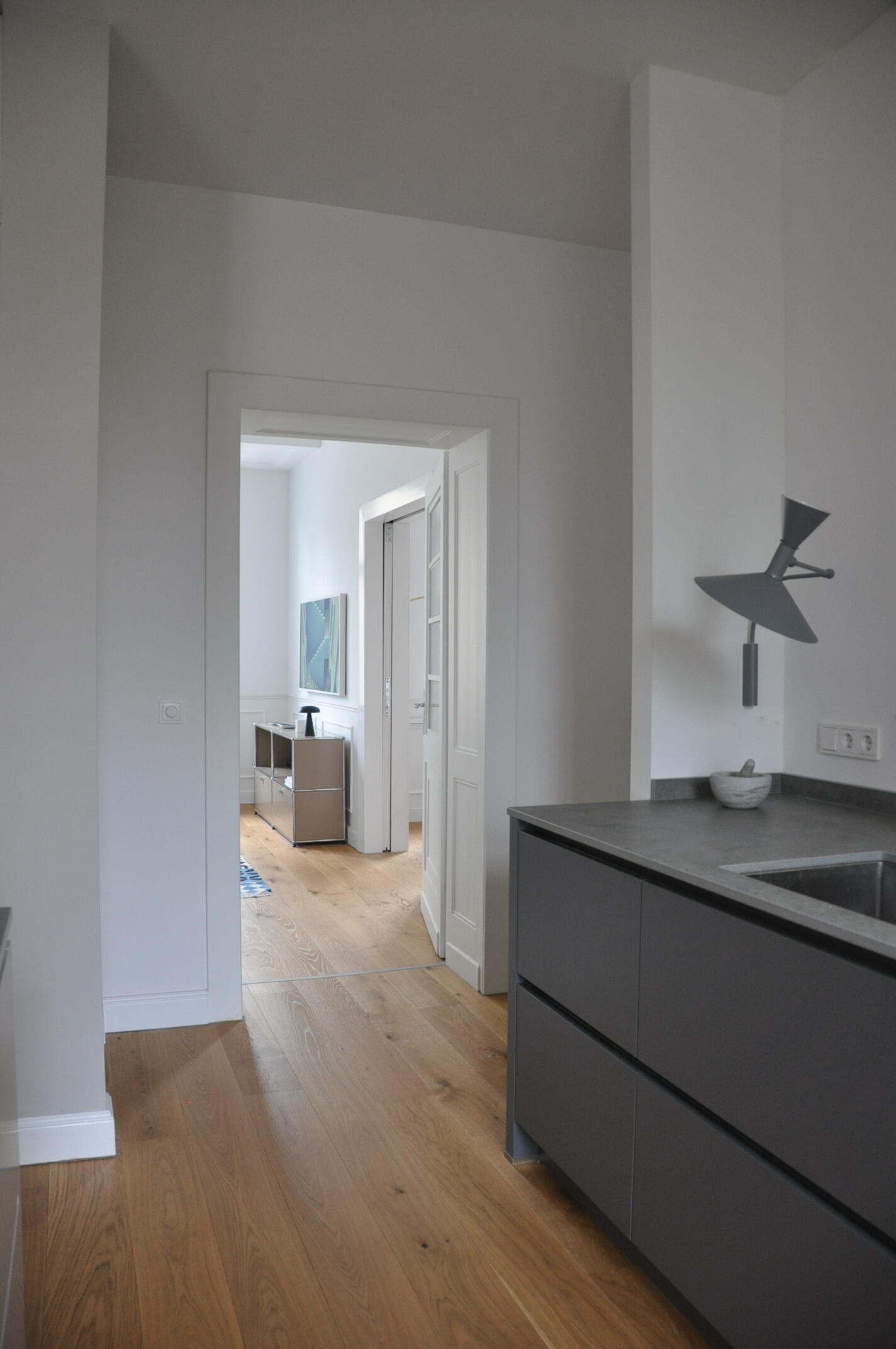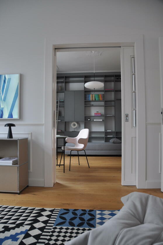 Meine 110 m² große Eigentumswohnung liegt in der 2. Etage und teilt sich in zwei Bereiche auf. Der vordere Bereich stellt den offenen Wohnungsraum dar, den ich mit meinen Gästen nutze. Der hintere Bereich hingegen ist mit Schlafzimmer, dem begehbaren Ankleideraum und dem zweiten Bad so abgeschottet, dass dieser ausschließlich für mich einen schönen Rückzugsort bietet. Die Wohnung bietet ein Schlafzimmer, ein Wohnzimmer, ein Gästezimmer, eine Wohn- und Essküche, zwei Badezimmer, eine Diele und ein begehbares Ankleidezimmer. Von der Wohnküche kommt man auf einen schönen Süd-West-Balkon mit Blick auf den Innenhof. Jedes Zimmer, inklusive der Badezimmer, hat ein Fenster. Die Wohnung ist somit sehr hell. Das Wohnzimmer und Gästezimmer wird von einer 100 Jahre alten Schiebetür, die ich neu aufgearbeitet habe, getrennt. Lässt man die Schiebetür offen hat man auf der anderen Seite mit der Verbindung von Wohn- und Arbeitszimmer ein wirklich geräumiges und offenes Wohngefühl. Bei der Gestaltung meiner Wohnung habe ich ebenfalls großen Wert darauf gelegt, sämtliche Materialien (Boden, Fenster, Türen, Fliesen etc.) auszusuchen, um dem Apartment von Beginn an meinen Stil zu geben. Mir war es dabei sehr wichtig einen eleganten, puristischen Stil in Anlehnung an Pariser Altbauten zu finden. So habe ich im neuen Schlaf-, Wohn- und Gästezimmer Heizungsverkleidungen anfertigen lassen und Orac-Dekorleisten mit Altbaucharme angebracht. Meine neu installierten Türen zu den Badezimmern und zum Ankleidezimmer sind deckenhoch und verleihen der Wohnung zudem ein „loftiges“ Ambiente. Bei der gesamten Möbelauswahl habe ich mich bemüht einen zeitlosen Stil aufzugreifen.
