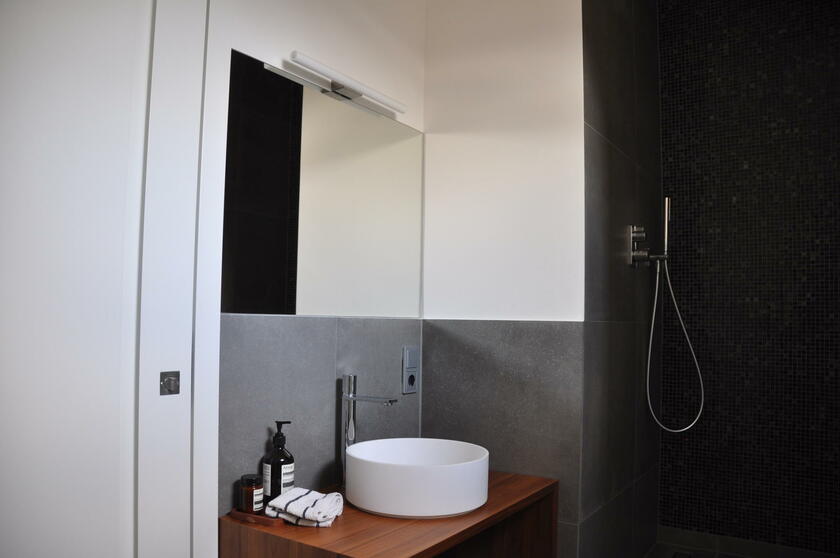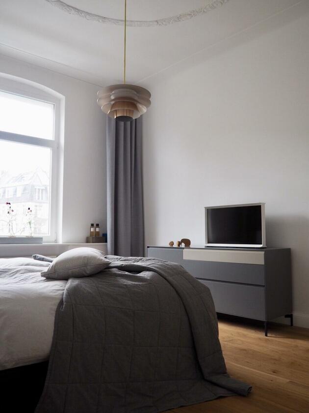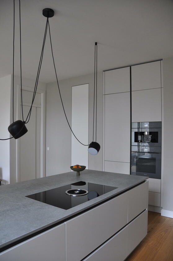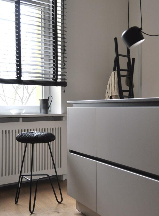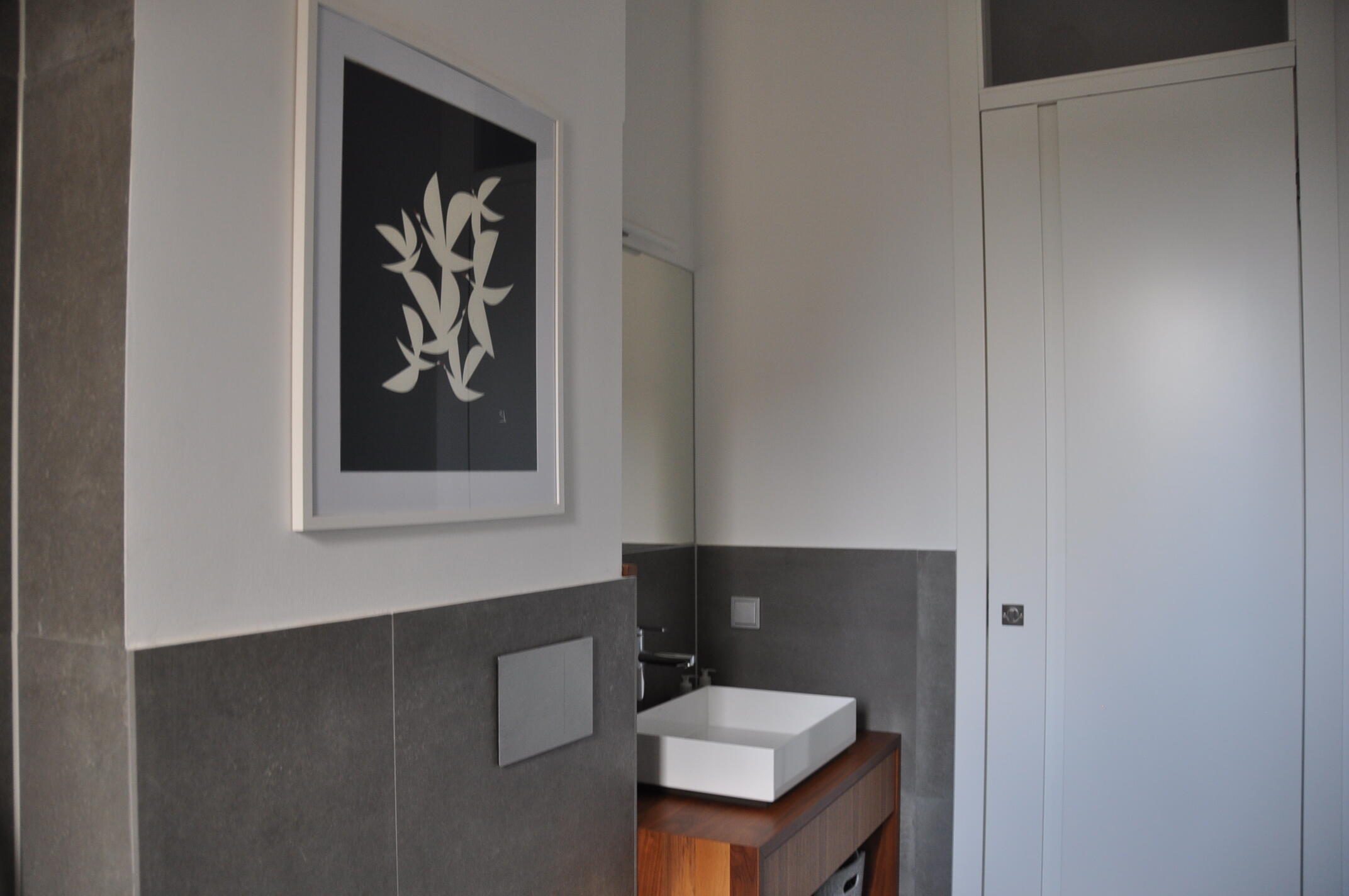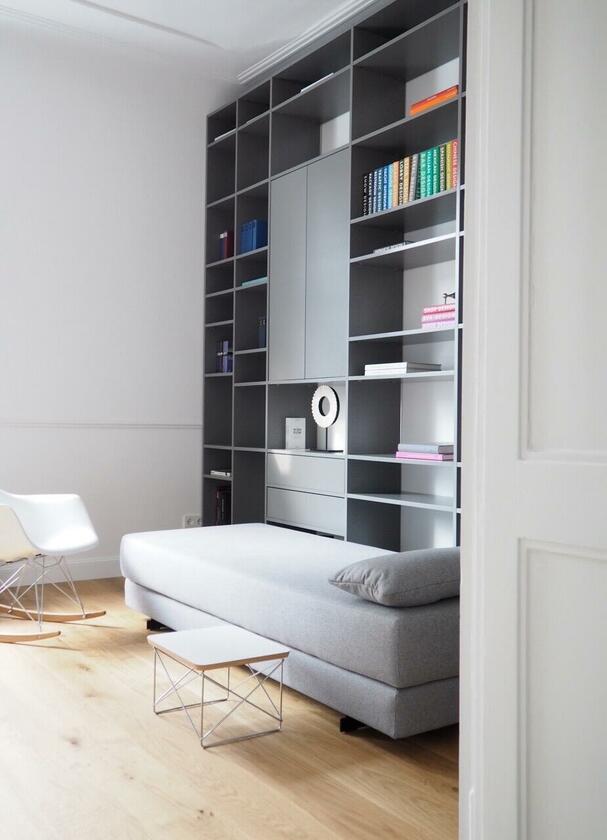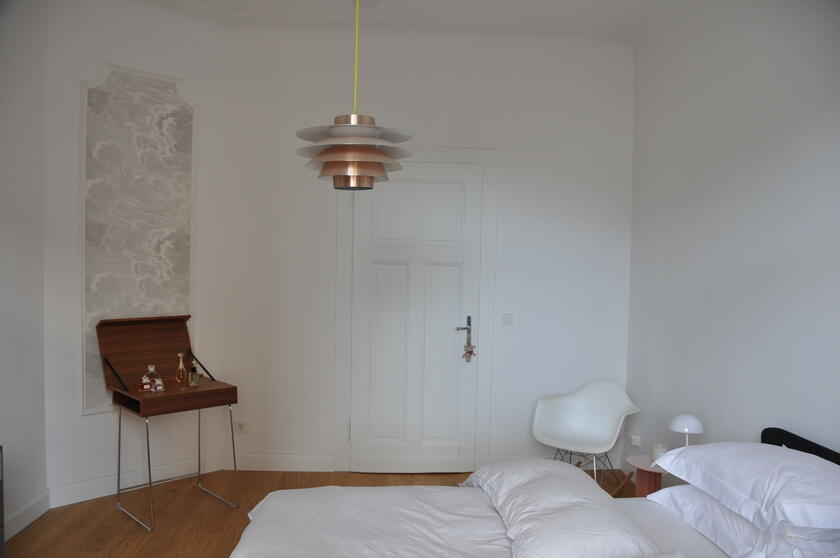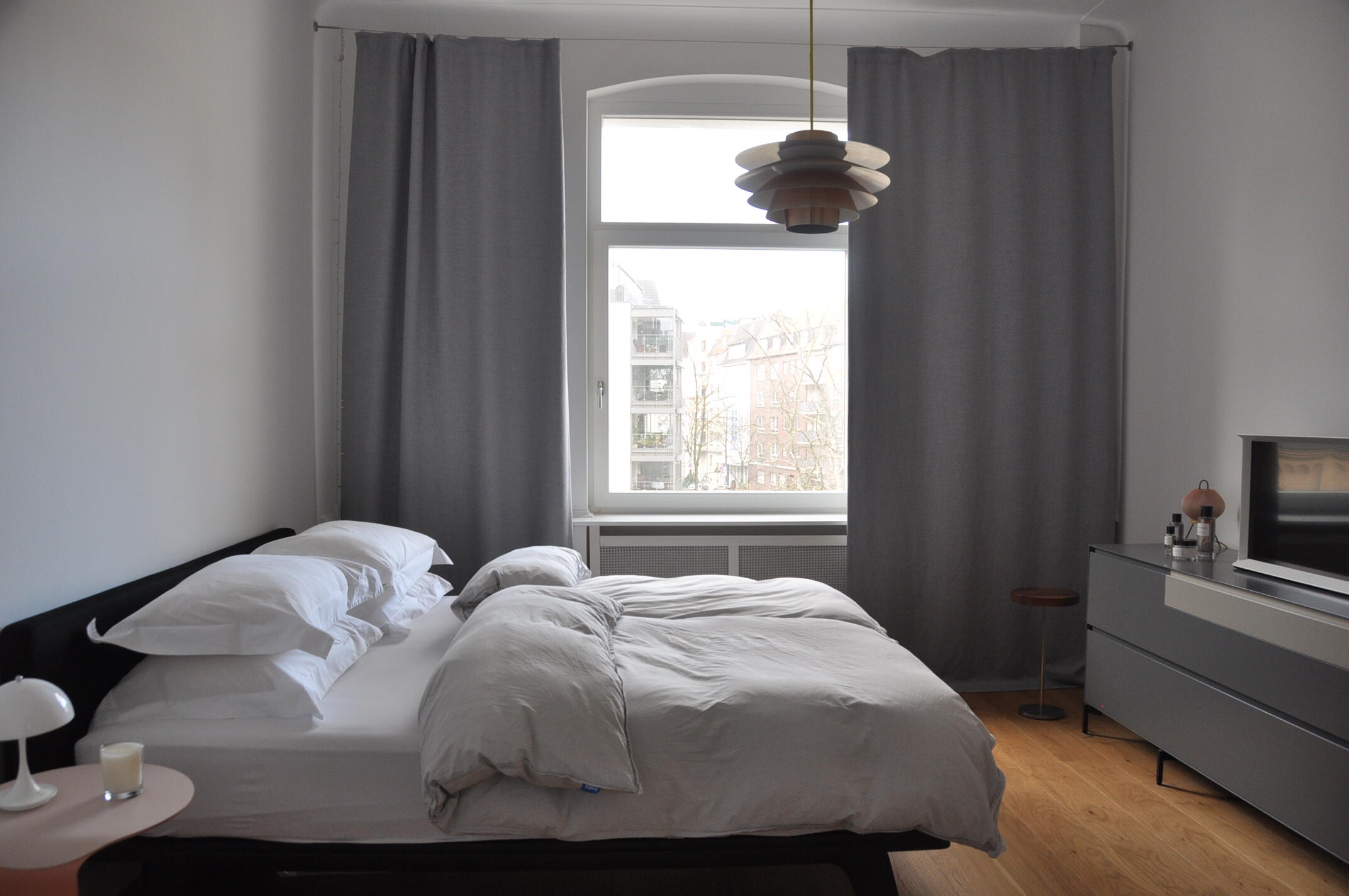 Meine 110 m² große Eigentumswohnung liegt in der 2. Etage und teilt sich in zwei Bereiche auf. Der vordere Bereich stellt den offenen Wohnungsraum dar, den ich mit meinen Gästen nutze. Der hintere Bereich hingegen ist mit Schlafzimmer, dem begehbaren Ankleideraum und dem zweiten Bad so abgeschottet, dass dieser ausschließlich für mich einen schönen Rückzugsort bietet. Die Wohnung bietet ein Schlafzimmer, ein Wohnzimmer, ein Gästezimmer, eine Wohn- und Essküche, zwei Badezimmer, eine Diele und ein begehbares Ankleidezimmer. Von der Wohnküche kommt man auf einen schönen Süd-West-Balkon mit Blick auf den Innenhof. Jedes Zimmer, inklusive der Badezimmer, hat ein Fenster. Die Wohnung ist somit sehr hell. Das Wohnzimmer und Gästezimmer wird von einer 100 Jahre alten Schiebetür, die ich neu aufgearbeitet habe, getrennt. Lässt man die Schiebetür offen hat man auf der anderen Seite mit der Verbindung von Wohn- und Arbeitszimmer ein wirklich geräumiges und offenes Wohngefühl. Bei der Gestaltung meiner Wohnung habe ich ebenfalls großen Wert darauf gelegt, sämtliche Materialien (Boden, Fenster, Türen, Fliesen etc.) auszusuchen, um dem Apartment von Beginn an meinen Stil zu geben. Mir war es dabei sehr wichtig einen eleganten, puristischen Stil in Anlehnung an Pariser Altbauten zu finden. So habe ich im neuen Schlaf-, Wohn- und Gästezimmer Heizungsverkleidungen anfertigen lassen und Orac-Dekorleisten mit Altbaucharme angebracht. Meine neu installierten Türen zu den Badezimmern und zum Ankleidezimmer sind deckenhoch und verleihen der Wohnung zudem ein „loftiges“ Ambiente. Bei der gesamten Möbelauswahl habe ich mich bemüht einen zeitlosen Stil aufzugreifen.