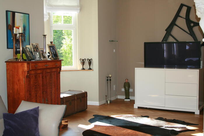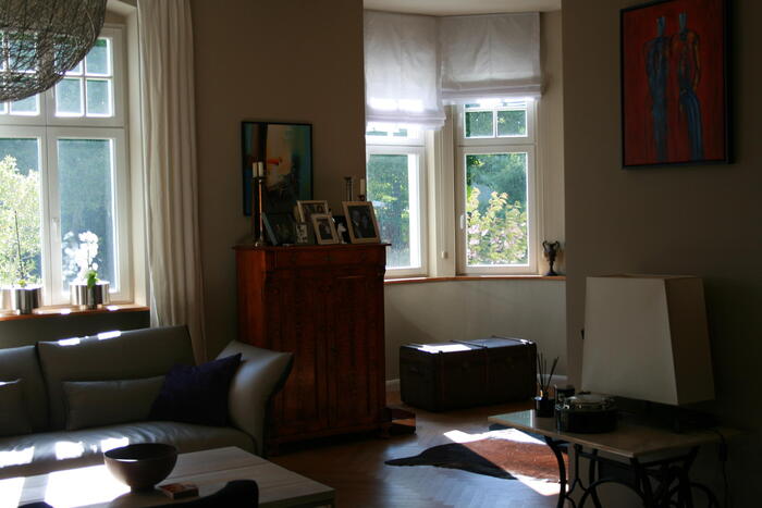 Die Villa liegt am Rande Berlins in Eichwalde. Sie befindet sich in einer wunderschönen großzügigen und ruhigen Straße, in der es immer genügend Parkplätze gibt. Das Haus wurde vor 8 Jahren umfangreich saniert, wobei wir auf das Baujahr 1912 Rücksicht genommen haben. Das ganze Objekt ist mit Holzfußböden, im Erdgeschoss und Untergeschoss mit Eiche Fischgrät, im Obergeschoss mit gekalkten Dielen ausgestattet. Küche und Bäder sind gefliest. Die Villa ist lichtdurchflutet. Das EG verfügt über eine Küche, Gäste WC, Empfang, Wohnzimmer mit Kaminzimmer -bisher nur ohne Kamin-, über Esszimmer, Wintergarten und 100 m² große Terrasse unter der sich wiederum die Garage befindet. Der Eingang zum Erdgeschoss liegt im Hochparterre. Im Obergeschoss befindet sich das Masterbad, ein Gästezimmer mit Bad en Suite, ein Arbeitszimmer und ein sehr großzügiger Flurbereich. Das Haus verfügt über ein bisher nicht ausgebautes Dachgeschoss mit einer Raumhöhe von teilweise 13 Meter. Auch das Untergeschoss ist sehr hell und vom Garten durch große Glastüren begehbar. Im UG befindet sich ein Arbeitszimmer, ein Hobbyraum, Gäste- WC, ein Mudroom und eine Küche, sowie ein Raum, der die nicht fertig gestellte Sauna beherbergt. Vom Untergeschoss kann man auch direkt in die Tiefgarage gelangen. Der Garten ist sehr liebevoll angelegt mit verschiedenen Sitzplätzen, altem Baumbestand, einer Liege- und einer Obstwiese. Auf dem Grundstück gibt es zwei mit Naturstein gepflasterte Fahrwege mit einem Parkplatz und einer Zufahrt zur Tiefgarage. Alle gepflasterten Fußwege sind ebenfalls aus Naturstein. Im Eingangsbereich des Gartens steht ein Brunnen in Form eines großen Steins, aus dem das Wasser plätschert. Zudem befinden sich auch noch 2 alte Garagen und ein kleines wunderhübsches Remisenhäuschen im Garten.