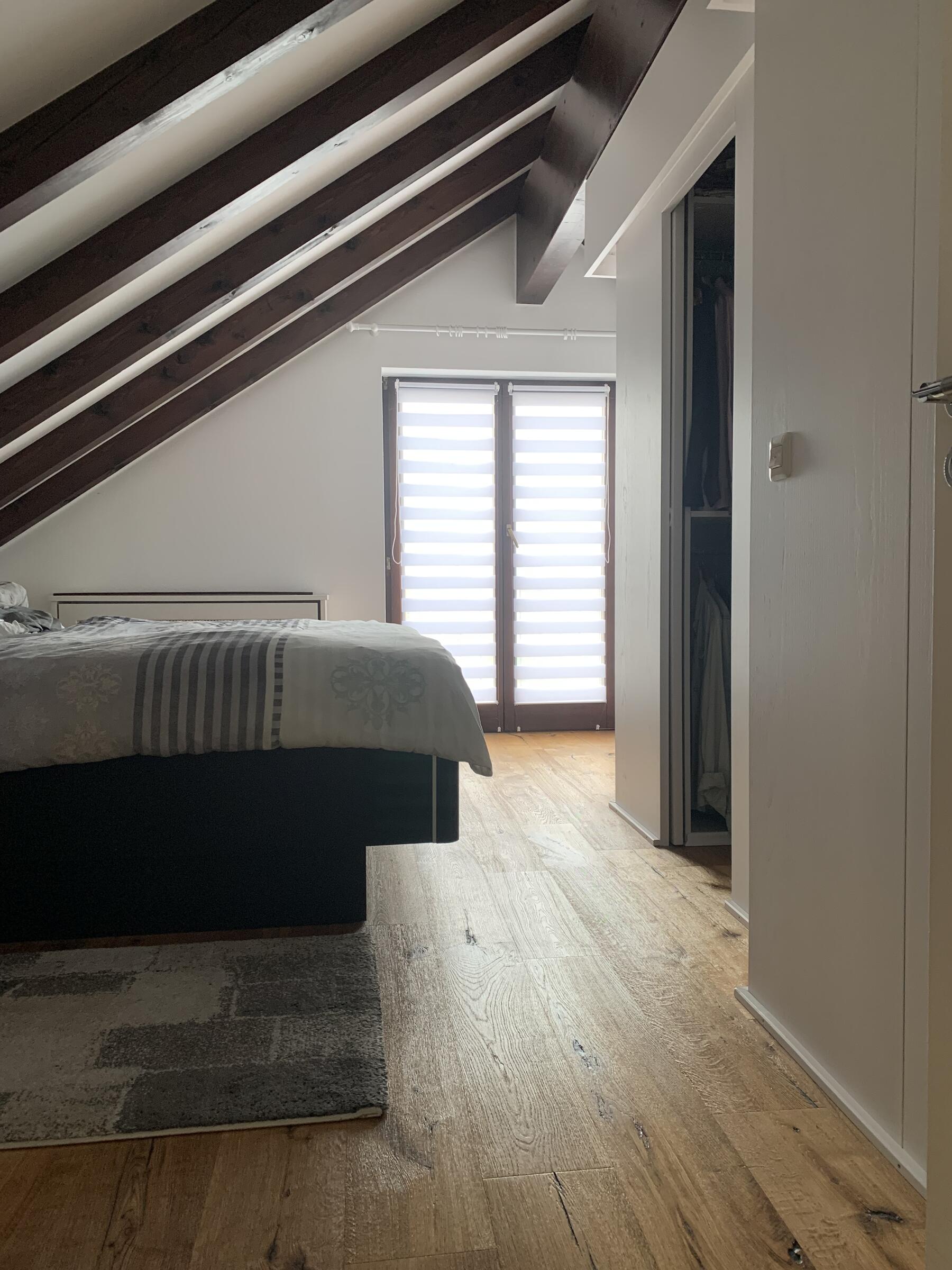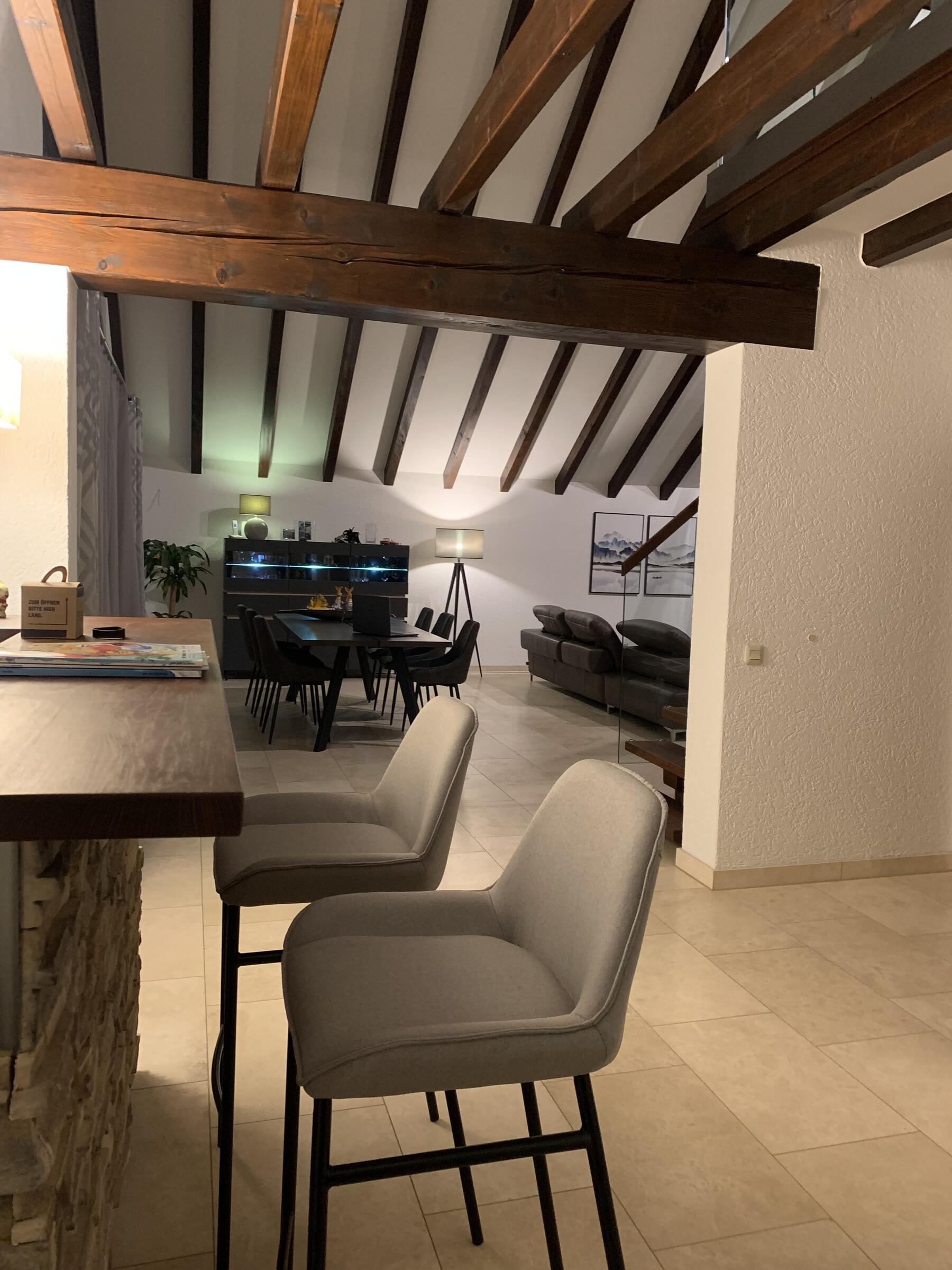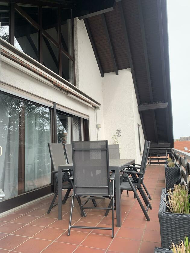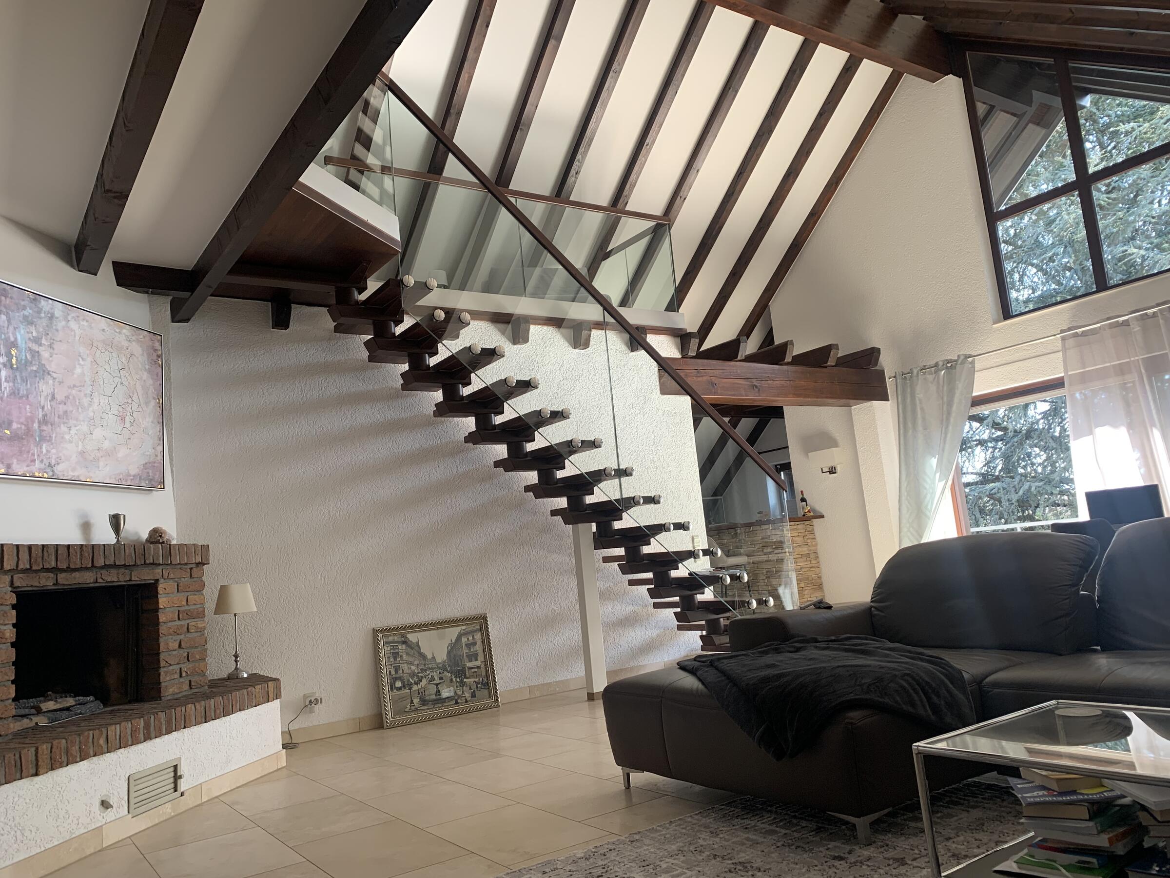 Die elegante Maisonette-Dachgeschosswohnung befindet sich in einem Mehrfamilienhaus. Die Räume der Wohnung sind weitestgehend offen gestaltet. Der großzügige Wohn- und Essbereich bietet ebenfalls eine Bar. Der Boden im Wohn- und Essbereich ist mit mattem Travertin ausgelegt. Im oberen Bereich der Wohnung sind die Böden der Empore und des Schlafzimmers mit Echtholz-Eichenparkett ausgelegt. Das Masterbad befindet sich ebenfalls im oberen Bereich der Wohnung. Die Fenster der Räume sind nur teilweise verdunkelbar. Vor dem Wohnhaus befindet sich ein öffentlicher Parkplatz. Die Wohnung ist ca. 17 km von Frankfurt am Main entfernt.