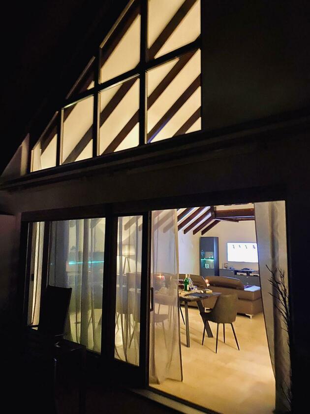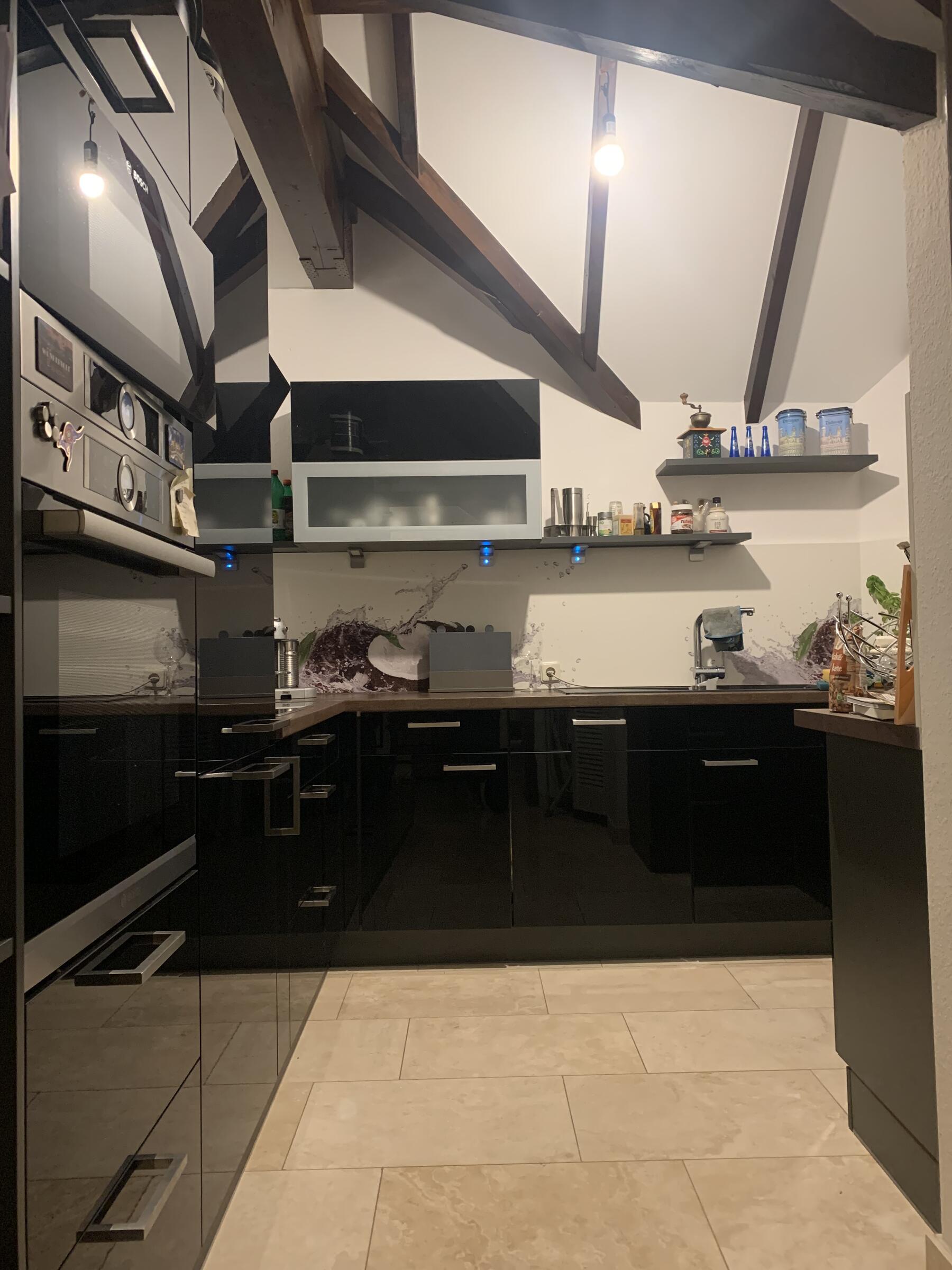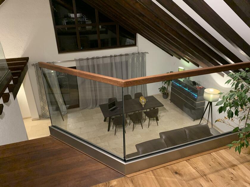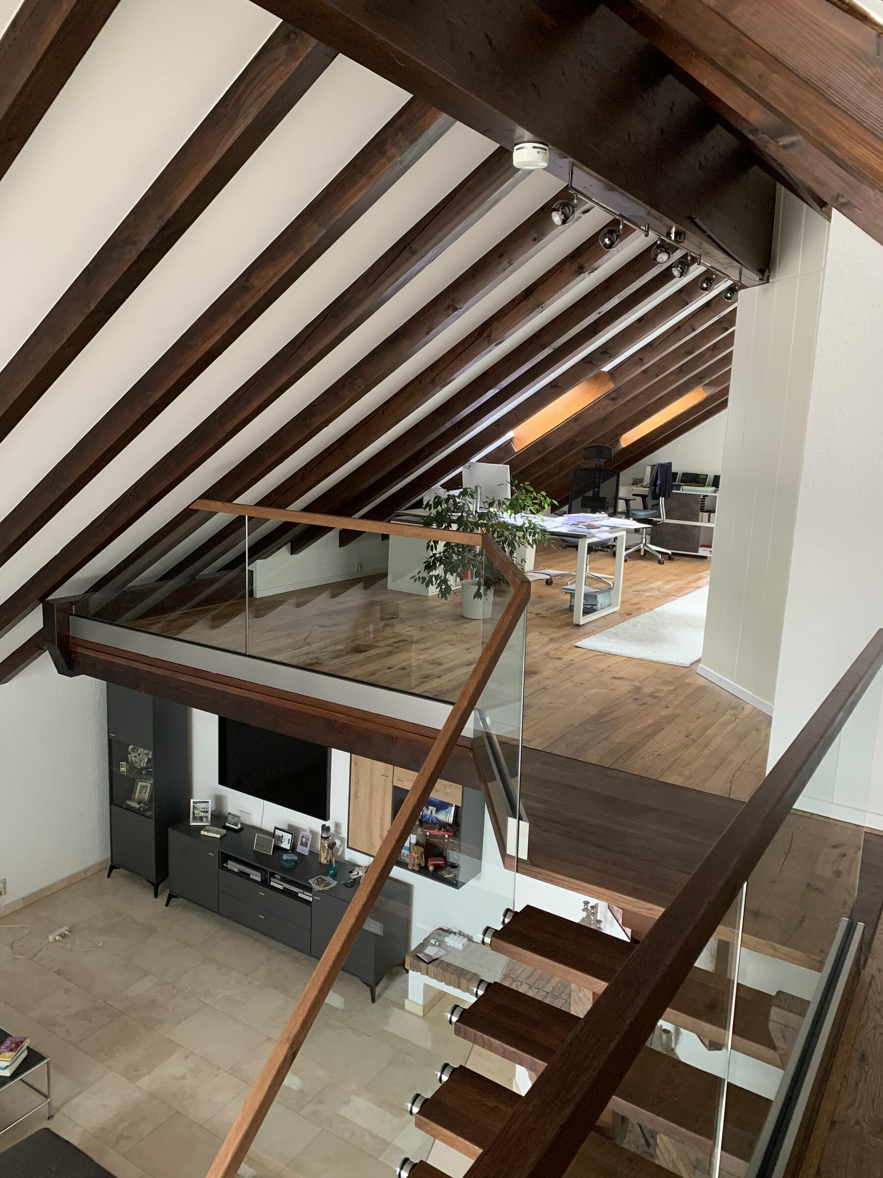 Die elegante Maisonette-Dachgeschosswohnung befindet sich in einem Mehrfamilienhaus. Die Räume der Wohnung sind weitestgehend offen gestaltet. Der großzügige Wohn- und Essbereich bietet ebenfalls eine Bar. Der Boden im Wohn- und Essbereich ist mit mattem Travertin ausgelegt. Im oberen Bereich der Wohnung sind die Böden der Empore und des Schlafzimmers mit Echtholz-Eichenparkett ausgelegt. Das Masterbad befindet sich ebenfalls im oberen Bereich der Wohnung. Die Fenster der Räume sind nur teilweise verdunkelbar. Vor dem Wohnhaus befindet sich ein öffentlicher Parkplatz. Die Wohnung ist ca. 17 km von Frankfurt am Main entfernt.