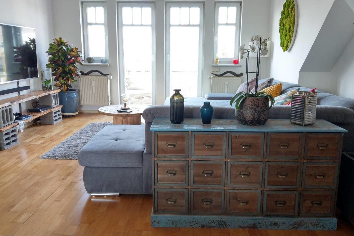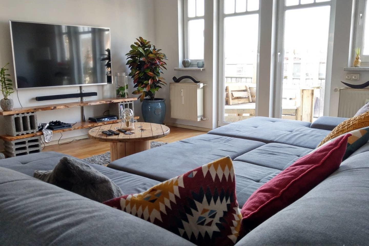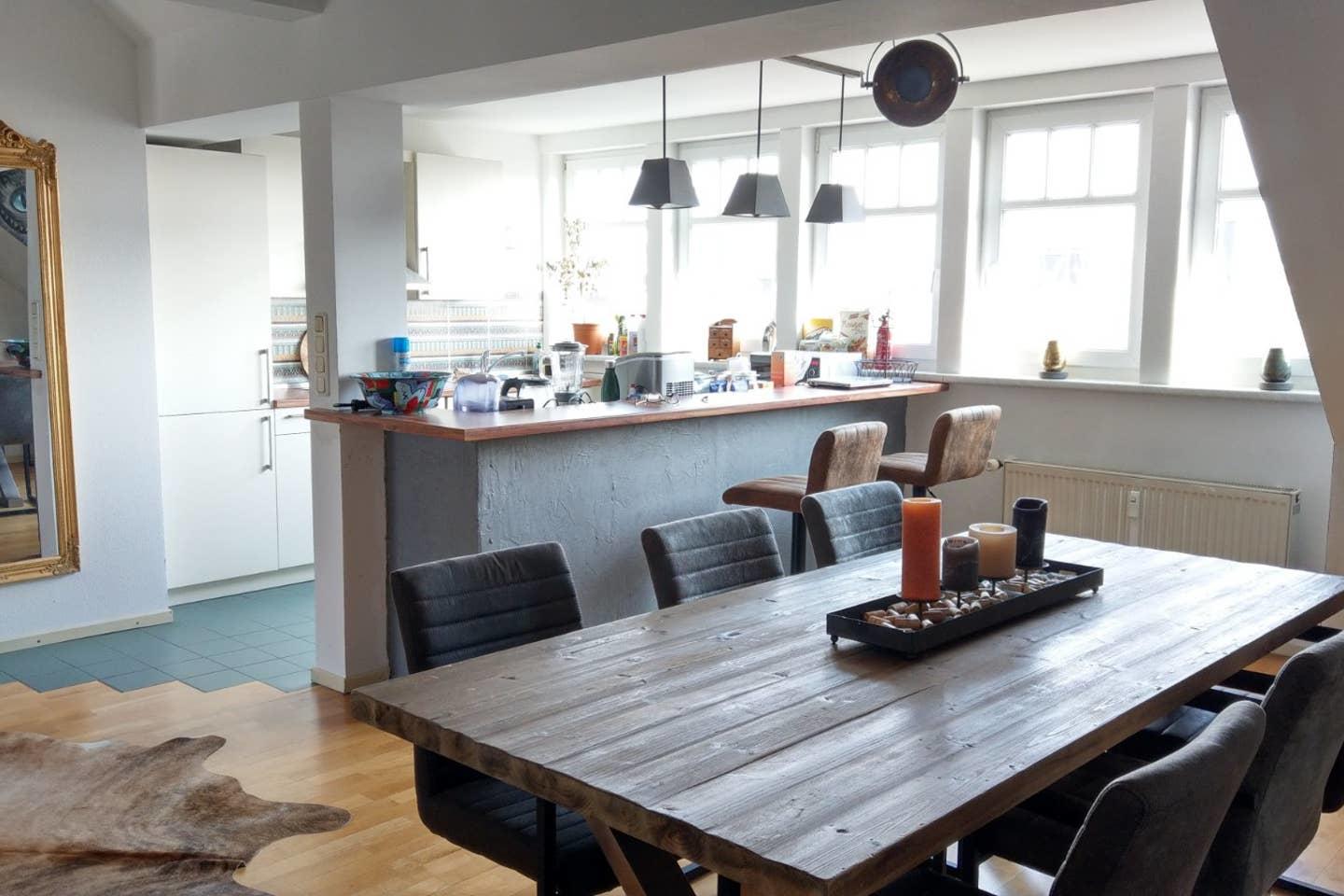 Das 1913 erbaute Haus (Historismus) liegt im "Malerviertel" von Frankfurt-Sachsenhausen. Das 4. Stockwerk wurde 1994 nachträglich ausgebaut, nachdem es zu früherer Zeit von Bomben zerstört wurde. Hohe Decken im Wohnbereich, der mittig liegt und seitlich von symmetrischen Schlafzimmern mit Dachschrägen umgeben ist. Die 3 Balken über der Couch finden sich im Fensterrahmen wieder und machen die Wohnung zu einem besonders außergewöhnlichen Ort zum Wohnen und Drehen. Die Küche und das Bad sind mit Kacheln im mexikanischen Stil verkleidet. Dazu bietet unsere Designer-Wohnung einen Balkon mit Lounge, von der man über Frankfurts Skyline blicken kann. Die attraktive, geschmackvoll ausgestattete Location steht mit gesamt ca. 94 m² für Film- und TV Produktionen und für Fotoshootings zur Verfügung.