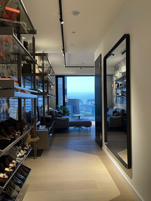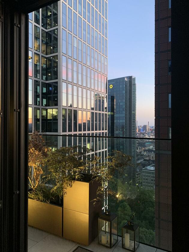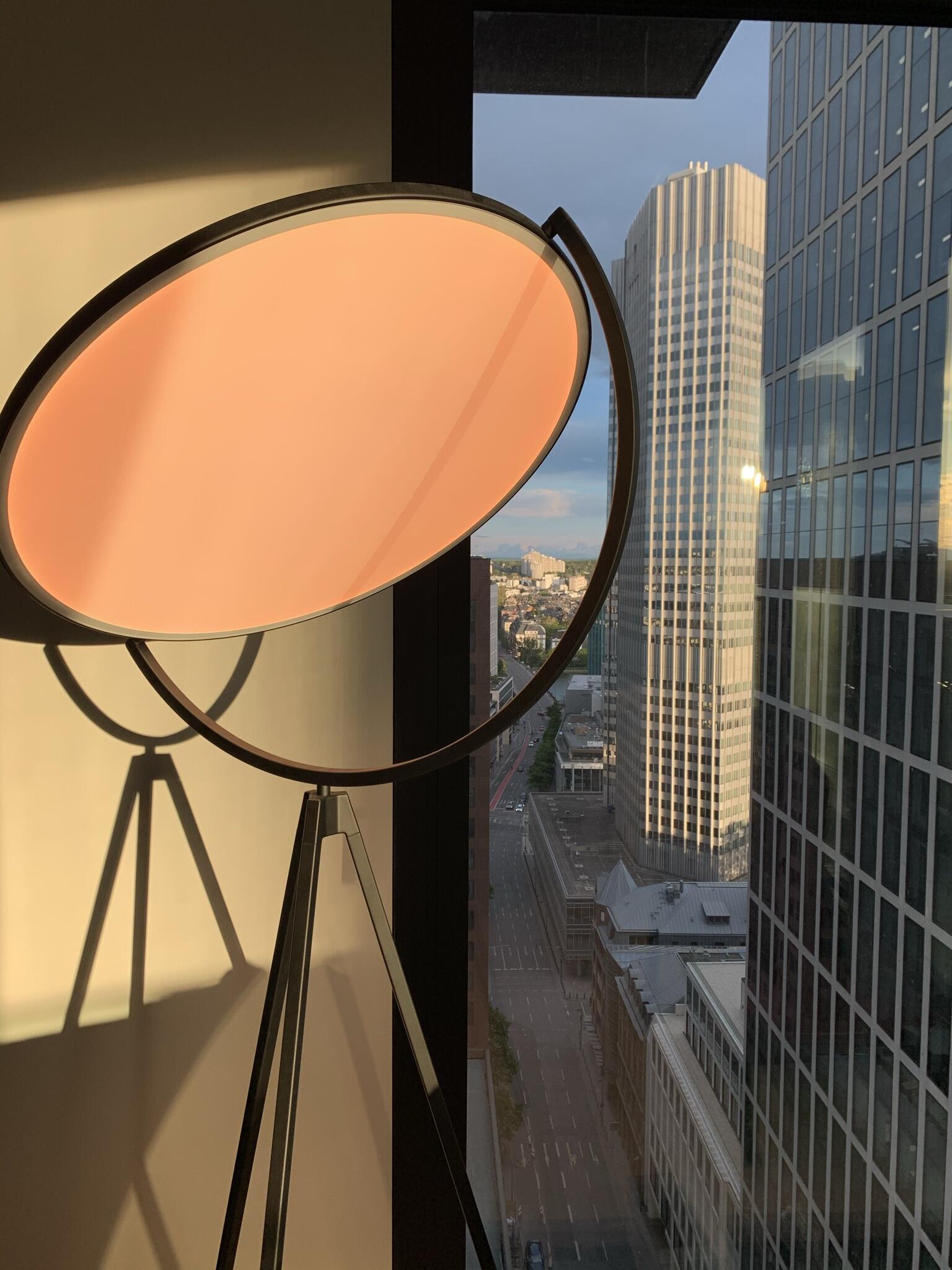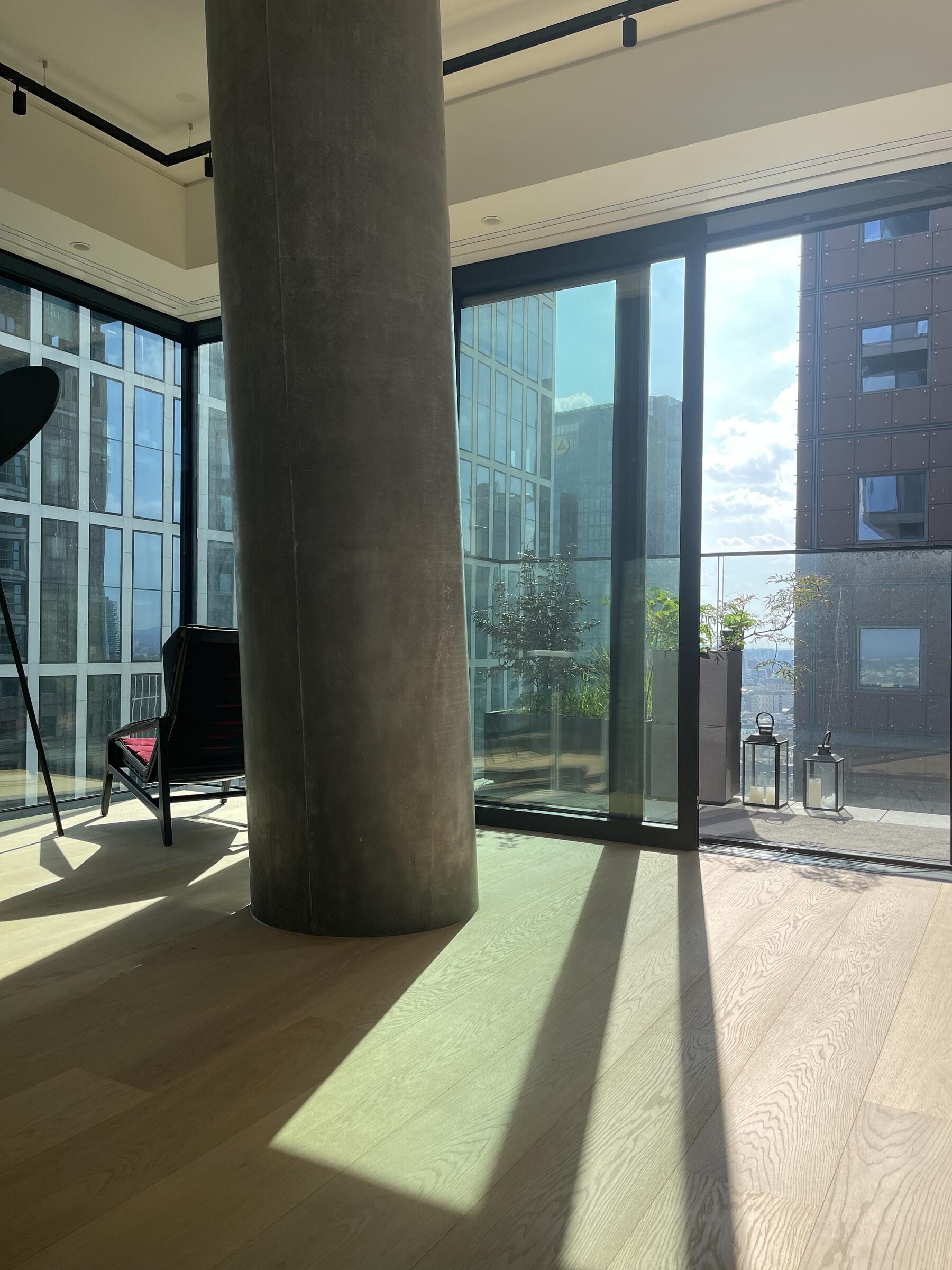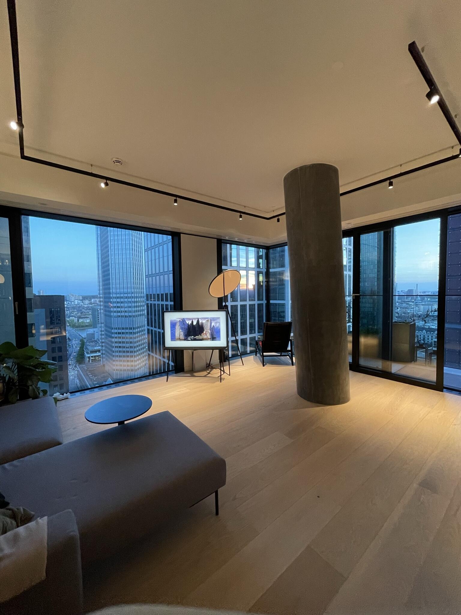 Die Skyline-Wohnung liegt im 17. Stock des ikonischen Omniturms im Herzen des Frankfurter Bankenviertels. Es handelt sich hierbei um die typische Wohnung eines Bankers oder Anwalts in der Großstadt. Die Wohnung überzeugt nicht nur mit einem einmaligen Ausblick, der an Metropolen wie New York oder Singapur erinnert, sondern auch mit hochwertiger Materialität, schönen Deckenhöhen, riesigen Fenstern und hochwertigen Designermöbeln. Die Wohnung ist komplett möbliert und verfügt auch über eine komplett ausgestattete Küche. Die Wohnung ist nach Süden ausgerichtet und bietet daher grundsätzlich eine hervorragende Lichtsituation. Dadurch, dass die Sonne regelmäßig durch benachbarte Hochhäuser verdeckt wird, kann man trotzdem gut gegen die Fenster filmen oder fotografieren. Den Sonnenuntergang kann man im Winter und im Sommer sehen.