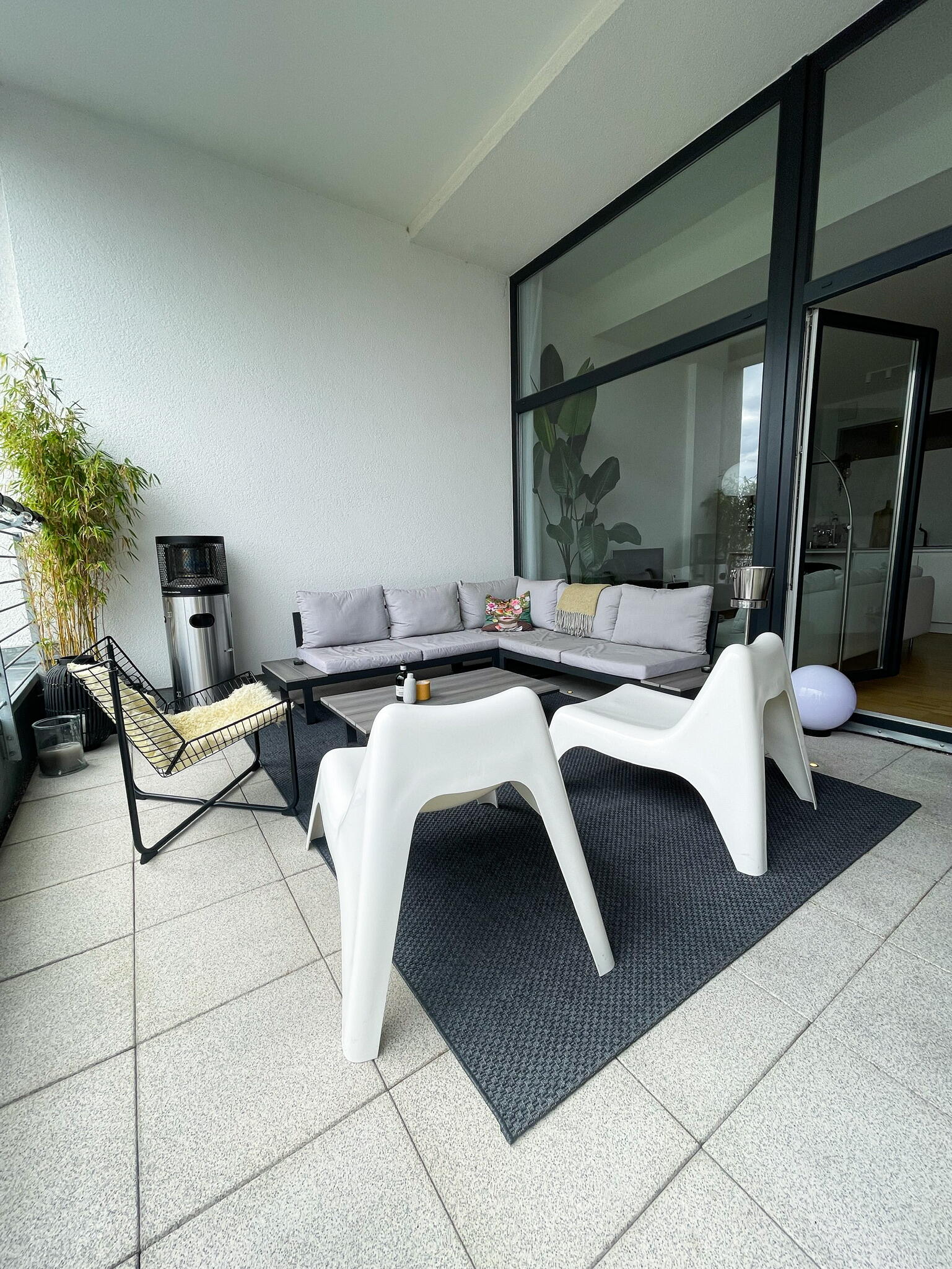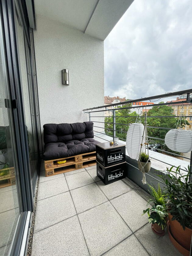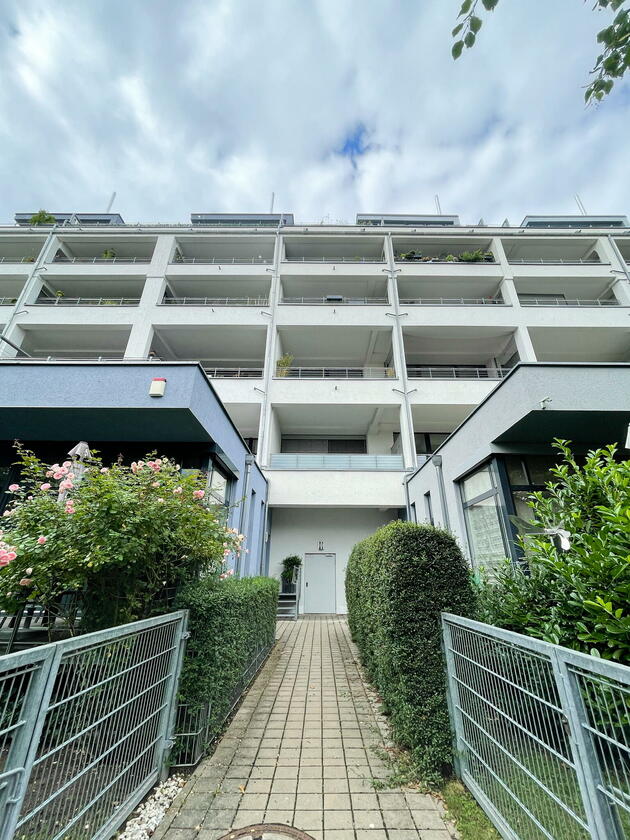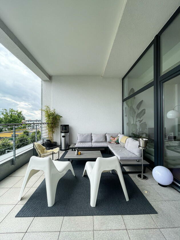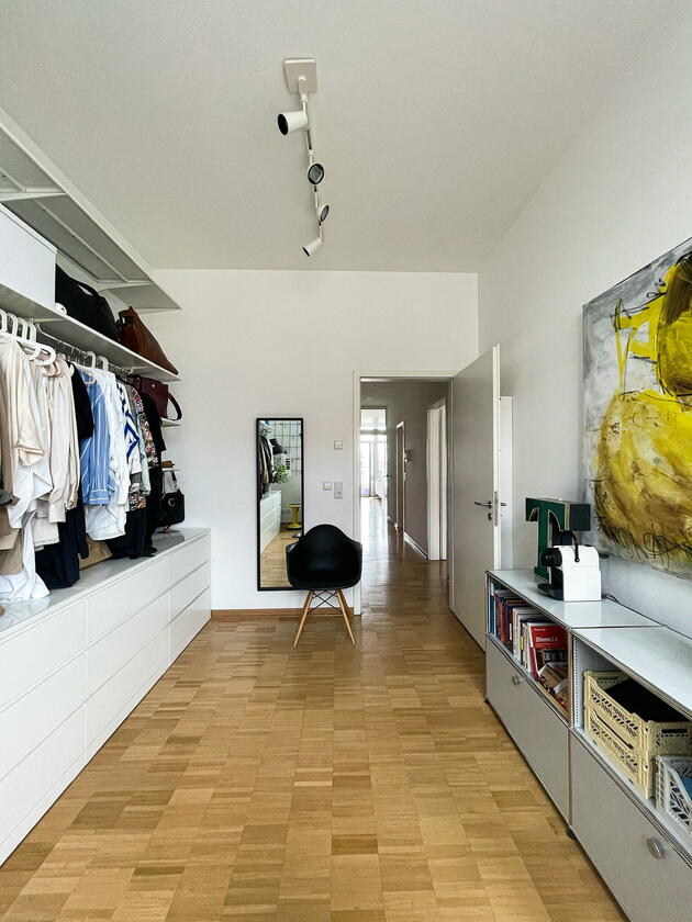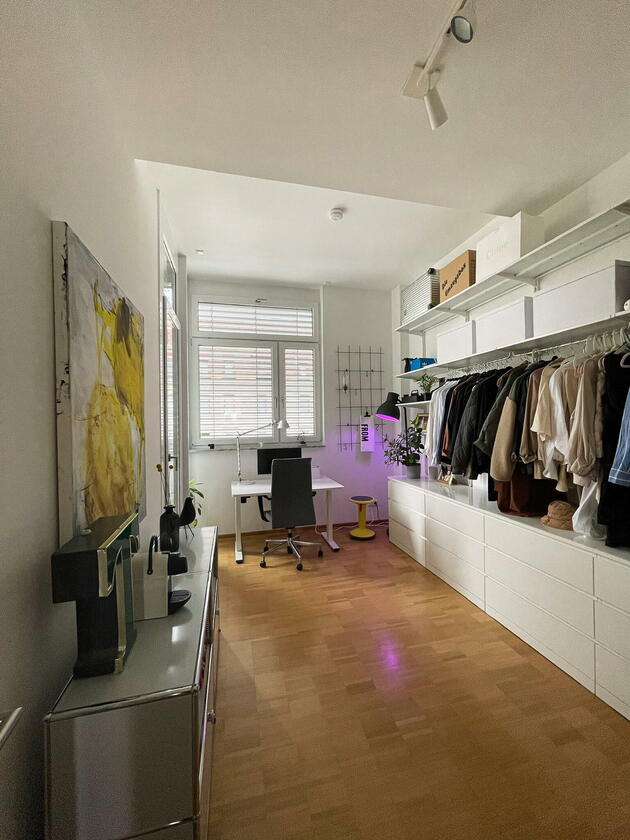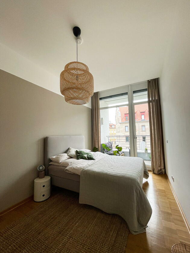 Die Wohnung befindet sich in der Fürther Südstadt auf einem alten Kasernengelände in der Nähe des Südstadtparks. Das Gebäude hat Geschichte und wurde 2008 kernsaniert. Die berühmten Carrera-Autos wurden in diesem Fabrikgebäude gebaut. Daher auch die eindrucksvolle Deckenhöhe von knapp 4 Metern. Durch die großen Fensterfronten zu allen Himmelsrichtungen ist die Wohnung sehr hell, kann aber durch automatische Außenrollos verdunkelt werden. Highlight sind die zwei Balkonterrassen, von denen die größere 32 m² misst und nach Südwesten in den Innenhof ausgerichtet ist und ein kleiner Balkon mit ca. 10 m², der nach Nordosten zur Straße gerichtet ist. Die offene Wohnküche in schlichtem modernen weiß und der offene Kleiderschrank, das große Bad mit riesigem Spiegel, WC, Dusche und Badewanne sowie das Gäste-WC eignen sich ebenfalls als Motive. Neben dem Wohn- und Essbereich, dem Schlafzimmer, Arbeitszimmer, Bad, Gäste-WC und den beiden Balkonen gibt es noch eine Abstellkammer mit Waschmaschinenanschluss, einen großzügigen Eingangsbereich und einen Kellerraum auf der Etage.