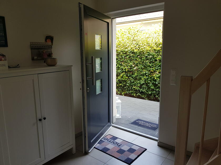 Das Einfamilienhaus wurde vor 5 Jahren gebaut und liegt in einer ruhigen Wohnstraße, einer Sackgasse im Landkreis Pinneberg. Das Haus hat 5 Zimmer, 2 unten und 3 oben. Die Küche ist eine weiße Einbauküche mit einem Tresen und einem Gasherd. Im Wohnzimmer befindet sich ein Kamin. Im Innenbereich ist das Untergeschoss gefliest. Das Haus hat keinen Keller. Das Grundstück hat knapp 900 m². Der Pool im Garten ist 4 x 8 m groß und 150 cm tief. Es stehen 3 Gartenhäuser auf dem Grundstück. Die Terrasse ist vorne und hinten gefliest und im vorderen Teil der Terrasse haben wir ein Glasdach, was ca. 8 m lang ist mit Markisen. Vor dem Haus ist eine große Auffahrt.