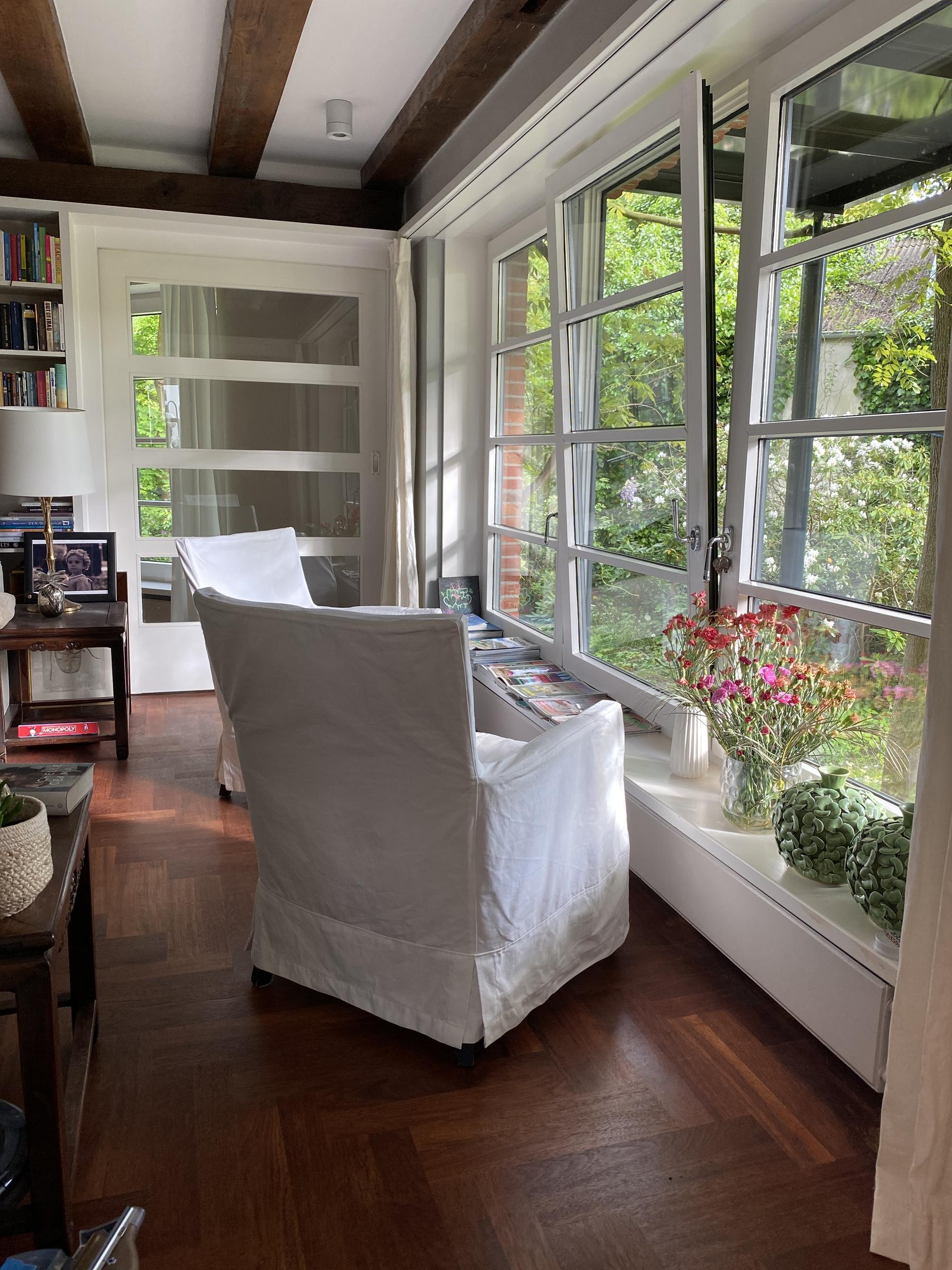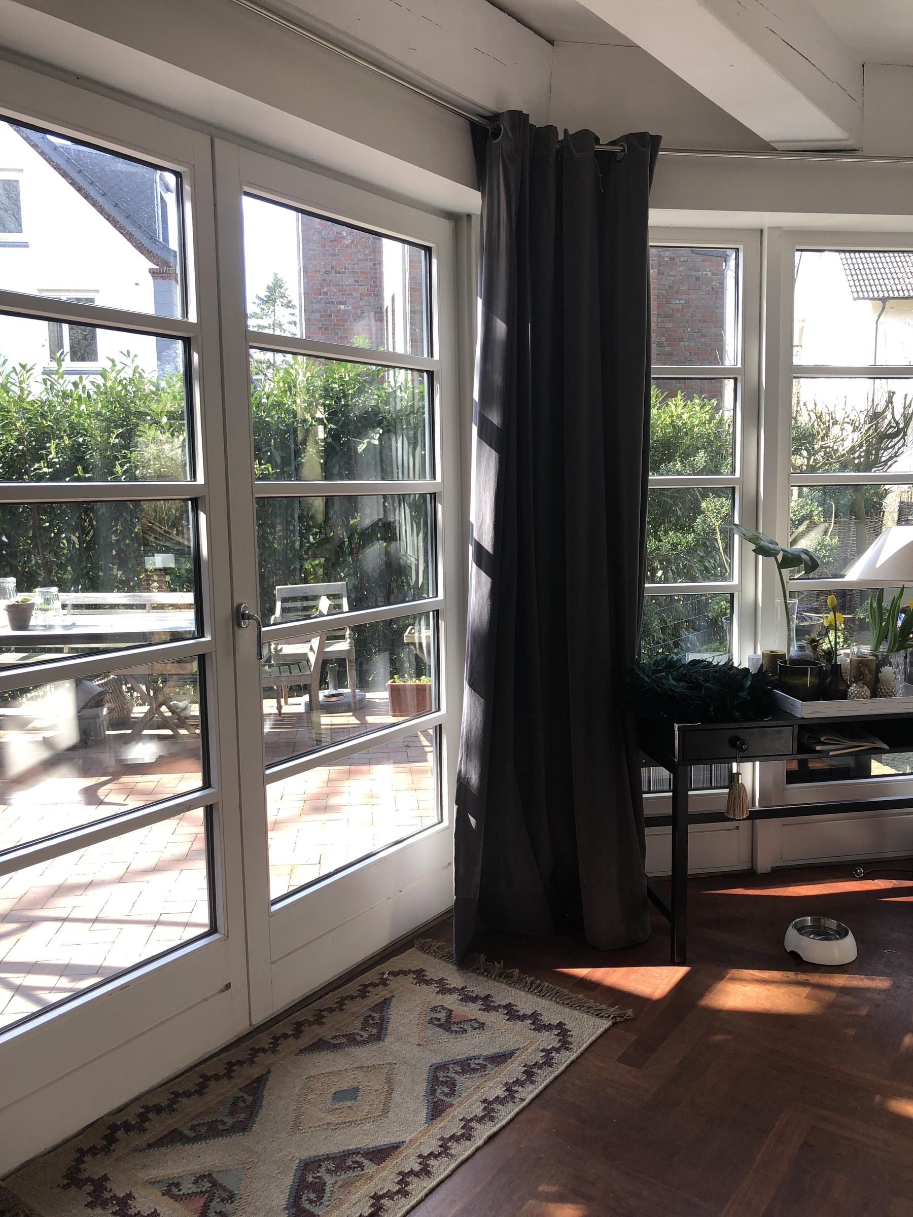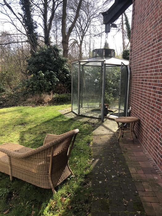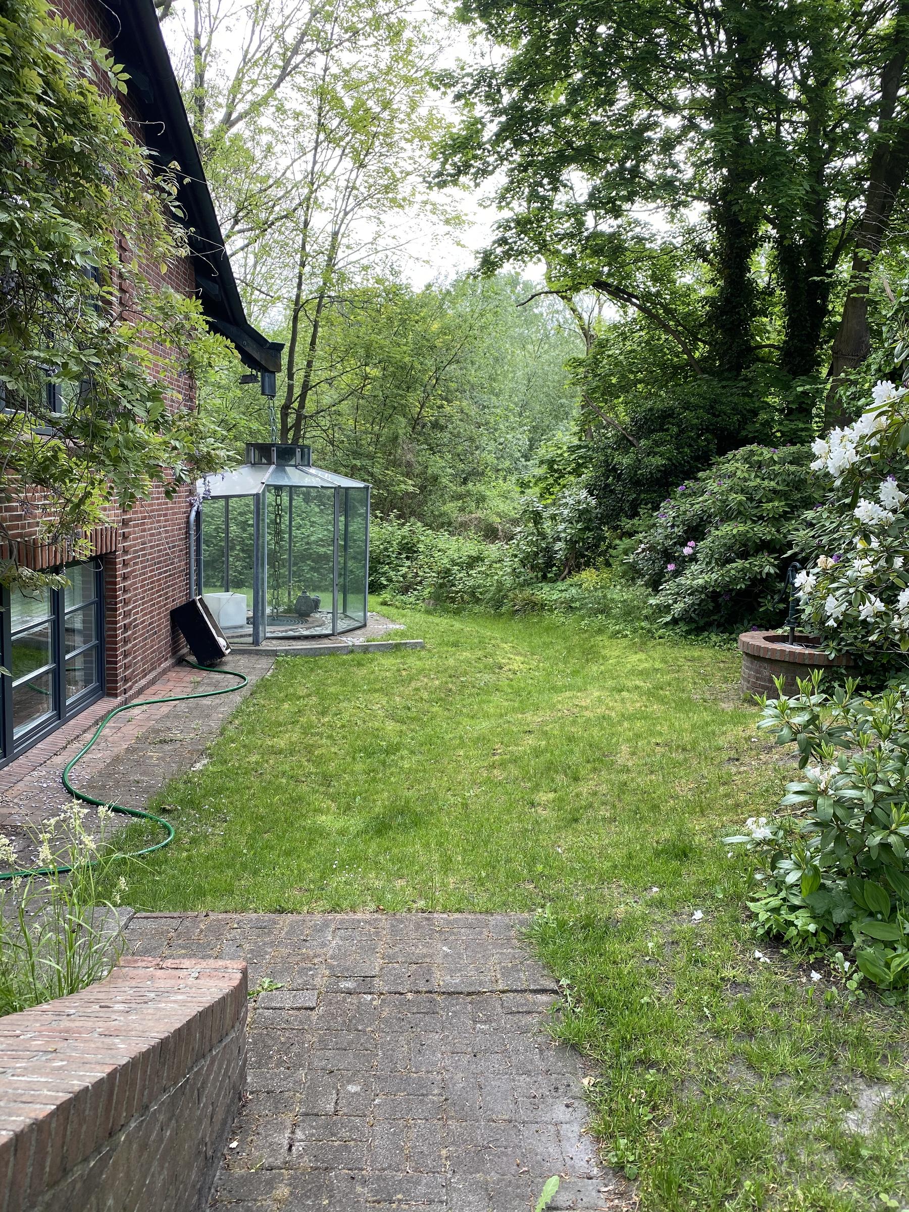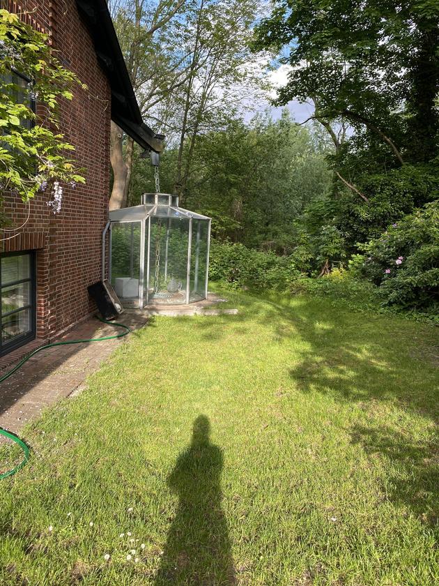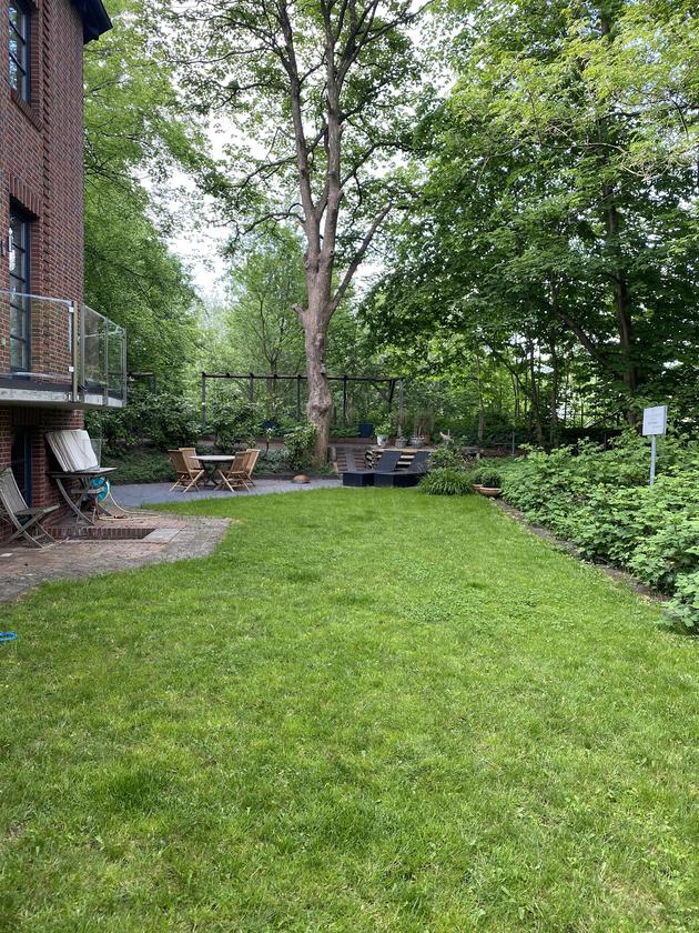Unser Haus befindet sich an einem Wald- und Moorgrundstück in Hamburg-Altona. Es liegt sehr ruhig in zweiter Reihe mit einer Einfahrt, die von zwölf Ahornbäumen kugelförmig gesäumt wird. Es ist ein Architektenhaus, gebaut 1984 und hat in jedem Zimmer ca. 200 Jahre alte Balken. Der Boden mit Teakholz ausgelegt und sehr robust. Das Holz hat eine braun-rötliche Farbe. Das Haus ist anthroposophisch nach Rudolf Steiner gebaut, kein Raum ist rechtwinklig. In der Mitte des Hauses befindet sich ein großer Kamin. Das Haus wurde im Mai 2017 komplett renoviert, sowie die Küche, alle Bäder, alle Wände.