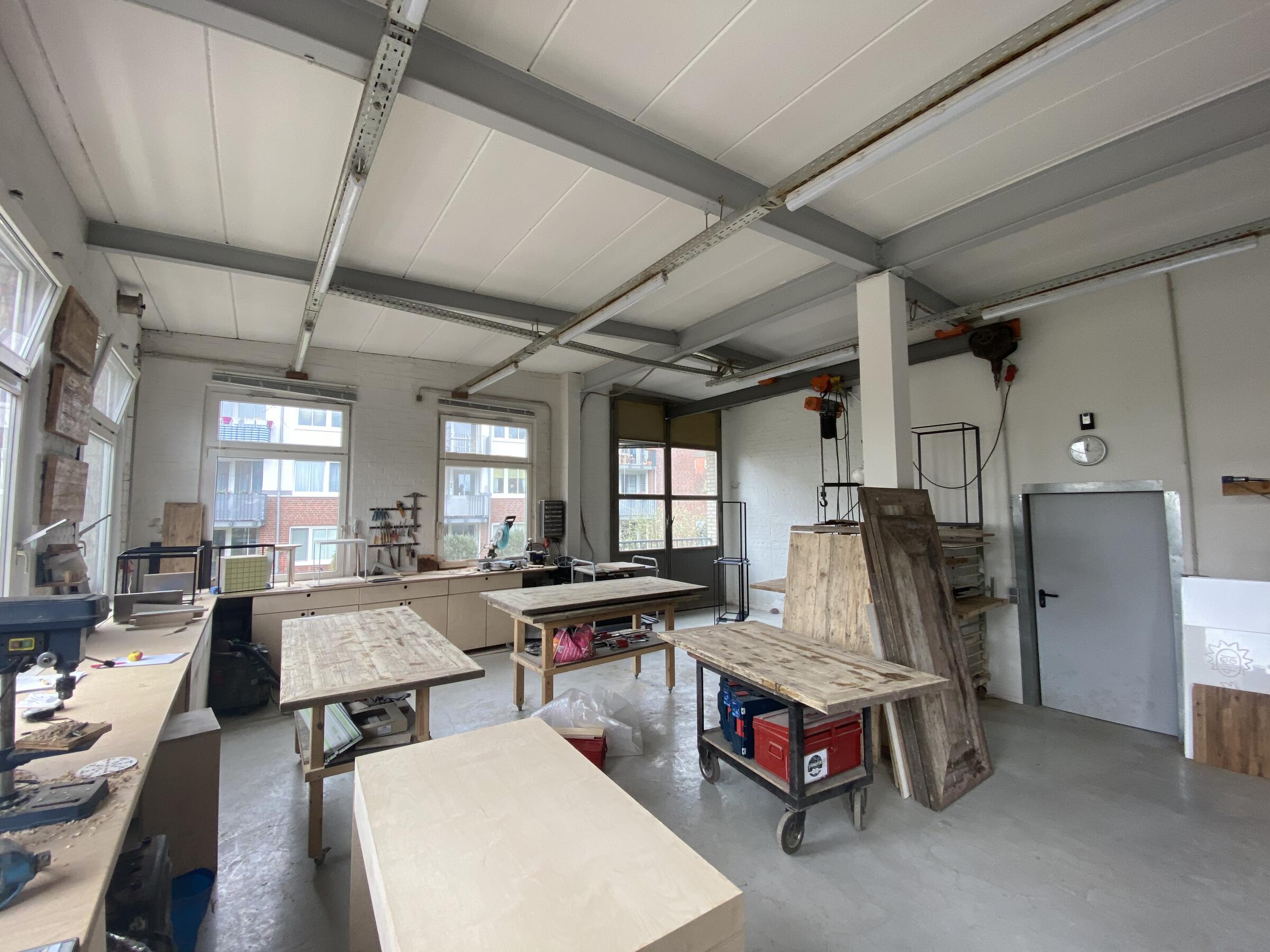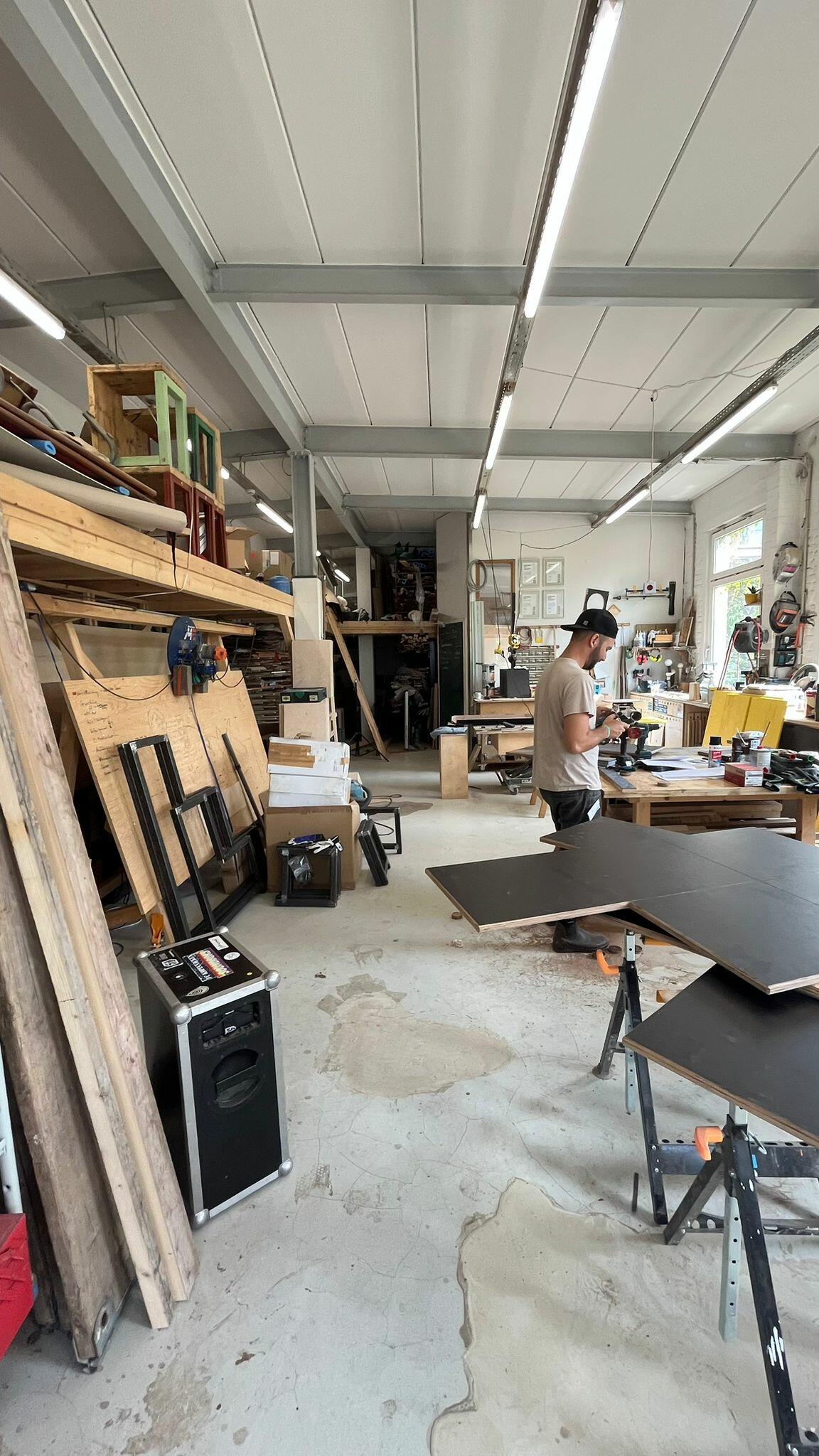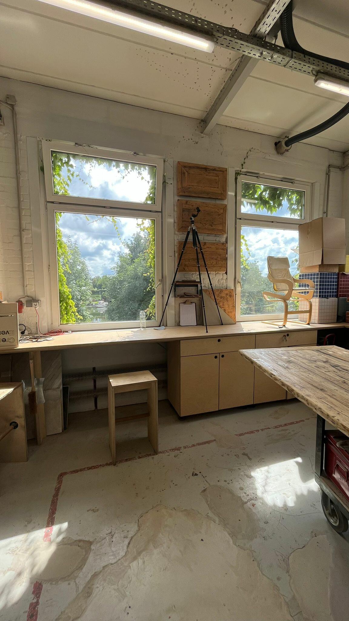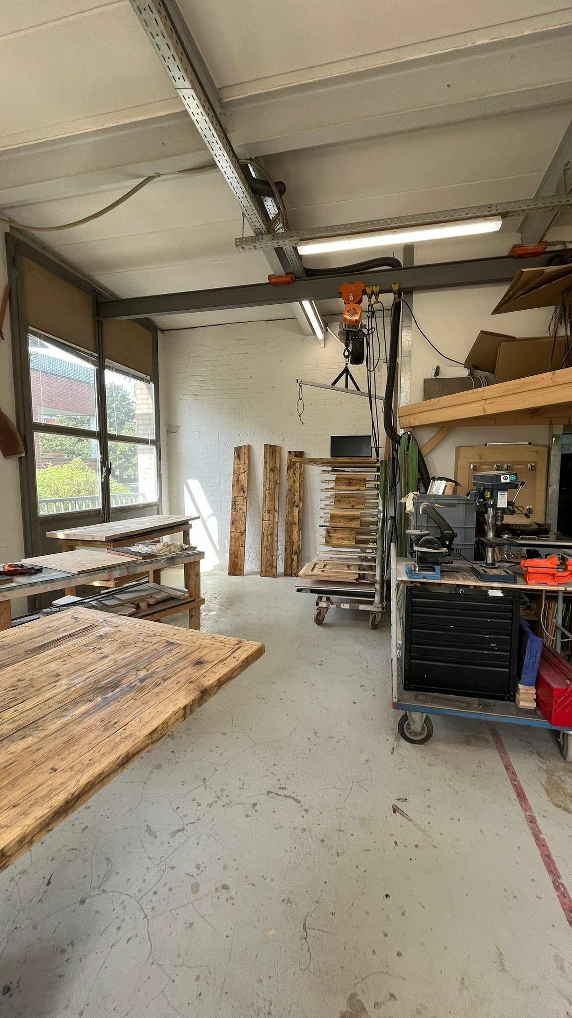In unserer Werkstatt produzieren Möbeldesigner und Tischler hochwertige Möbel aus Holz, Stahl, Marmor und anderen Werkstoffen. Die Werkstatt befindet sich im Hinterhaus im 1. Obergeschoss und ist über eine Steintreppe zu erreichen. Der Raumhöhe beträgt zwischen 5-6 m. Die weiß gestrichenen Wände der Werkstatt sind zum Teil aus Backsteinen. Viele der Möbel und Einrichtungsgegenstände sind auf Rollen gelagert und dadurch gut zu verschieben. Außerdem gibt es eine über 17 m lange Ablagefläche an den Fenstern. Das Werkstattbüro am Ende der Halle bietet eine einfache Büroausstattung.