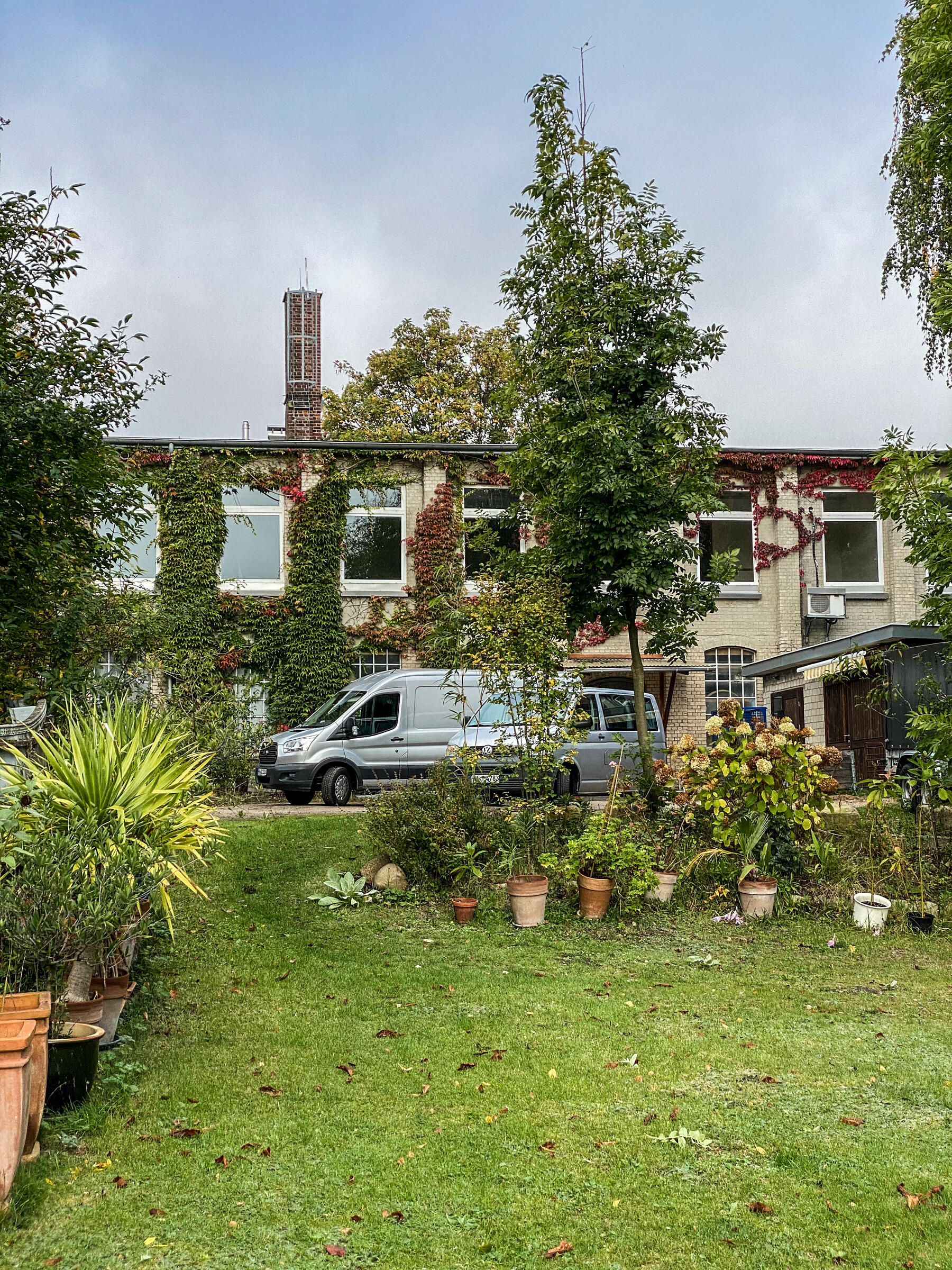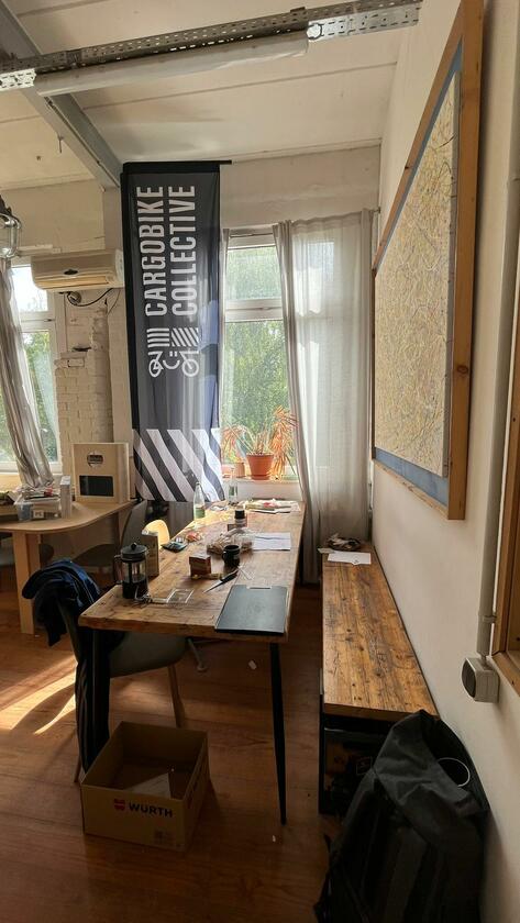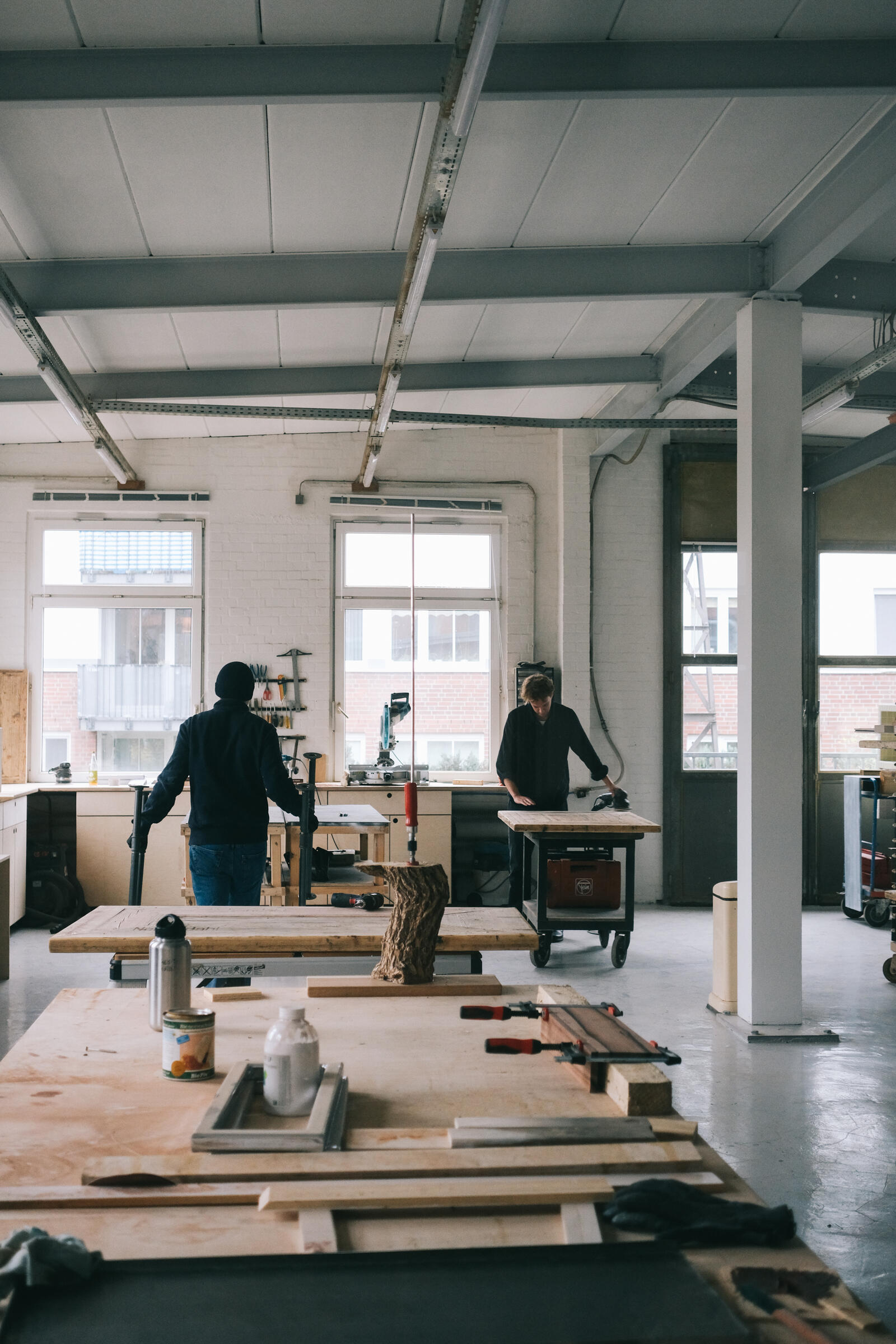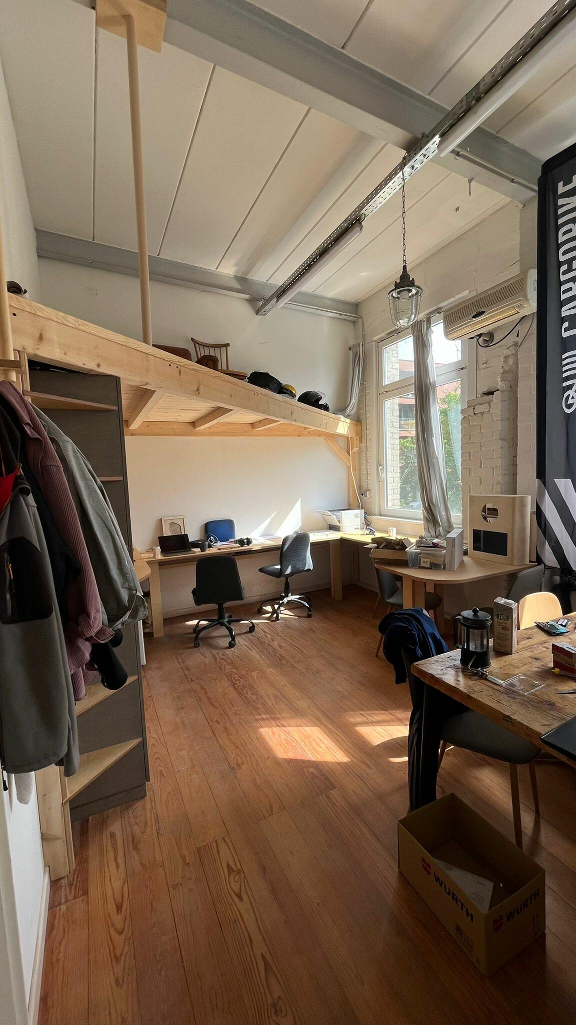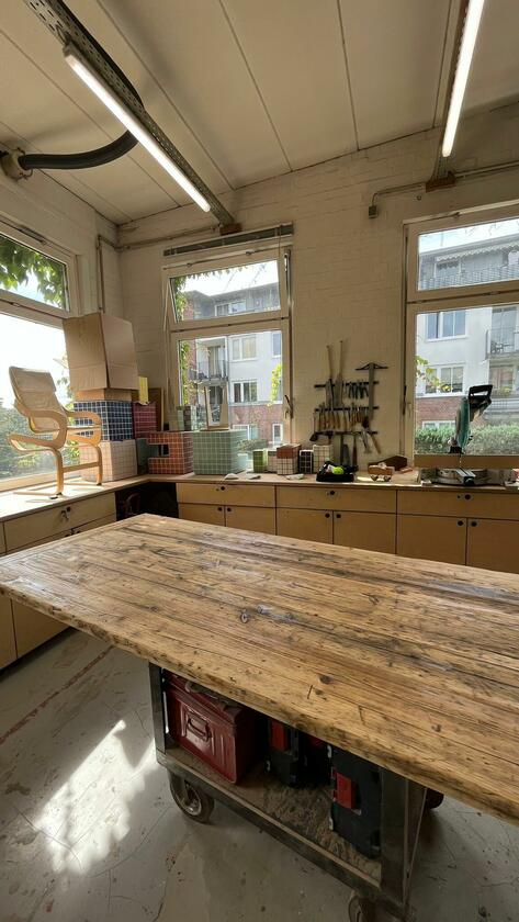 In unserer Werkstatt produzieren Möbeldesigner und Tischler hochwertige Möbel aus Holz, Stahl, Marmor und anderen Werkstoffen. Die Werkstatt befindet sich im Hinterhaus im 1. Obergeschoss und ist über eine Steintreppe zu erreichen. Der Raumhöhe beträgt zwischen 5-6 m. Die weiß gestrichenen Wände der Werkstatt sind zum Teil aus Backsteinen. Viele der Möbel und Einrichtungsgegenstände sind auf Rollen gelagert und dadurch gut zu verschieben. Außerdem gibt es eine über 17 m lange Ablagefläche an den Fenstern. Das Werkstattbüro am Ende der Halle bietet eine einfache Büroausstattung.