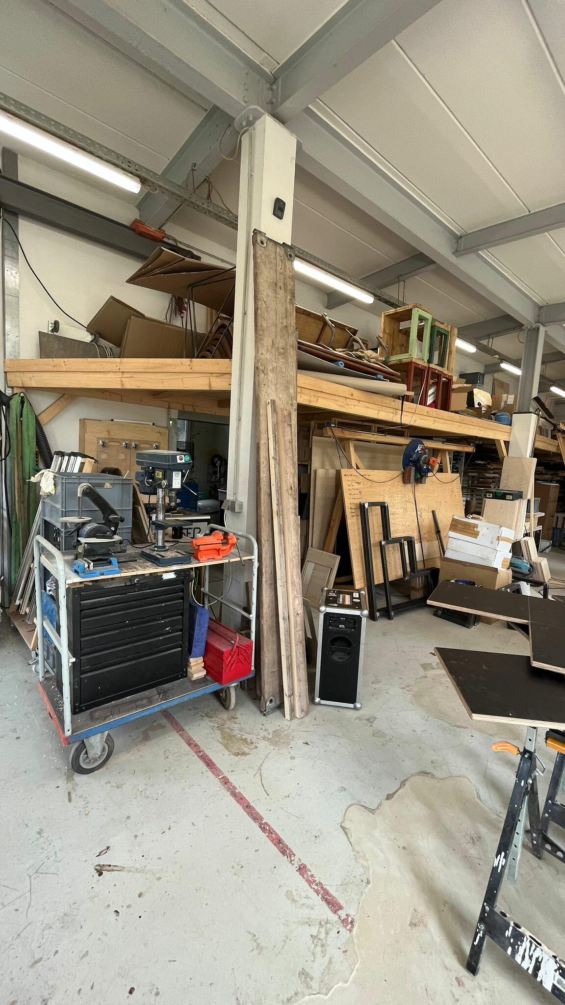 Aktuell wird hier viel an Möbeln produziert und es ist ein Materiallager eingezogen als Zwischendecke. Es kann vieles wenn gewünscht weggeräumt werden.