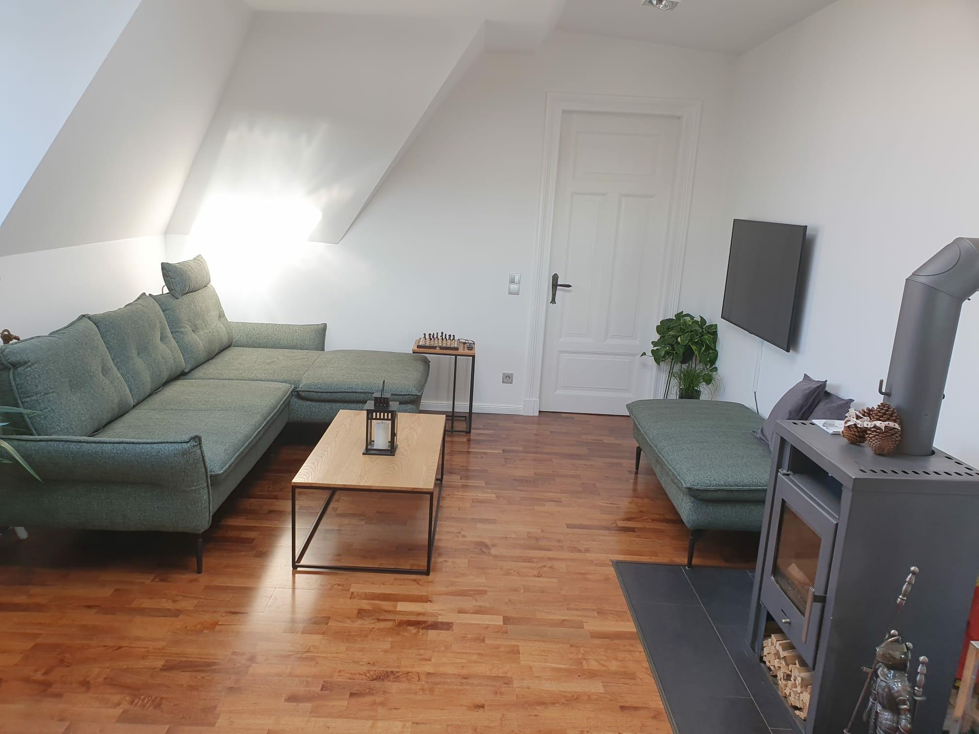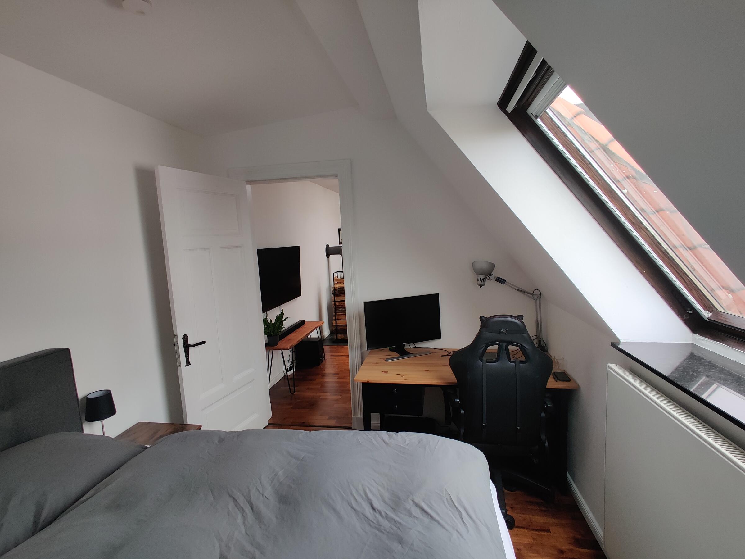 Diese Penthouse-Wohnung wurde nachträglich in den Dachstuhl eines schönen Altbaugebäudes in einem ruhigen Wohnviertel in Hamburg-Eimsbüttel gebaut. Sie verfügt über eine moderne Einrichtung und Gestaltung, besitzt aber trotzdem einige Altbauelemente, wie beispielsweise belgische Heizkörper aus dem 19. Jahrhundert mit aufwendiger Verzierung und alte, massive Türen mit verzierten Beschlägen. Die Inneneinrichtung verfolgt einen rustikalen Industriestil, der durch hochwertigen dunklen Parkettboden unterstützt wird. In der Wohnung sind viele Pflanzen, die mit ihren Grüntönen das Ambiente aufleben lassen. Die maßgefertigte Küche ist ebenfalls modern und hochwertig in anthrazitfarbener Hochglanzoptik. Das Highlight der Wohnung sind die 3 großen Panoramafenster im Eingangs-, Küchen- und Essbereich, die große Loggia mit Balkon, Dachfenster in Wohnzimmer und Bad mit viel Lichteinlass, sowie der Kamin im Wohnzimmer.