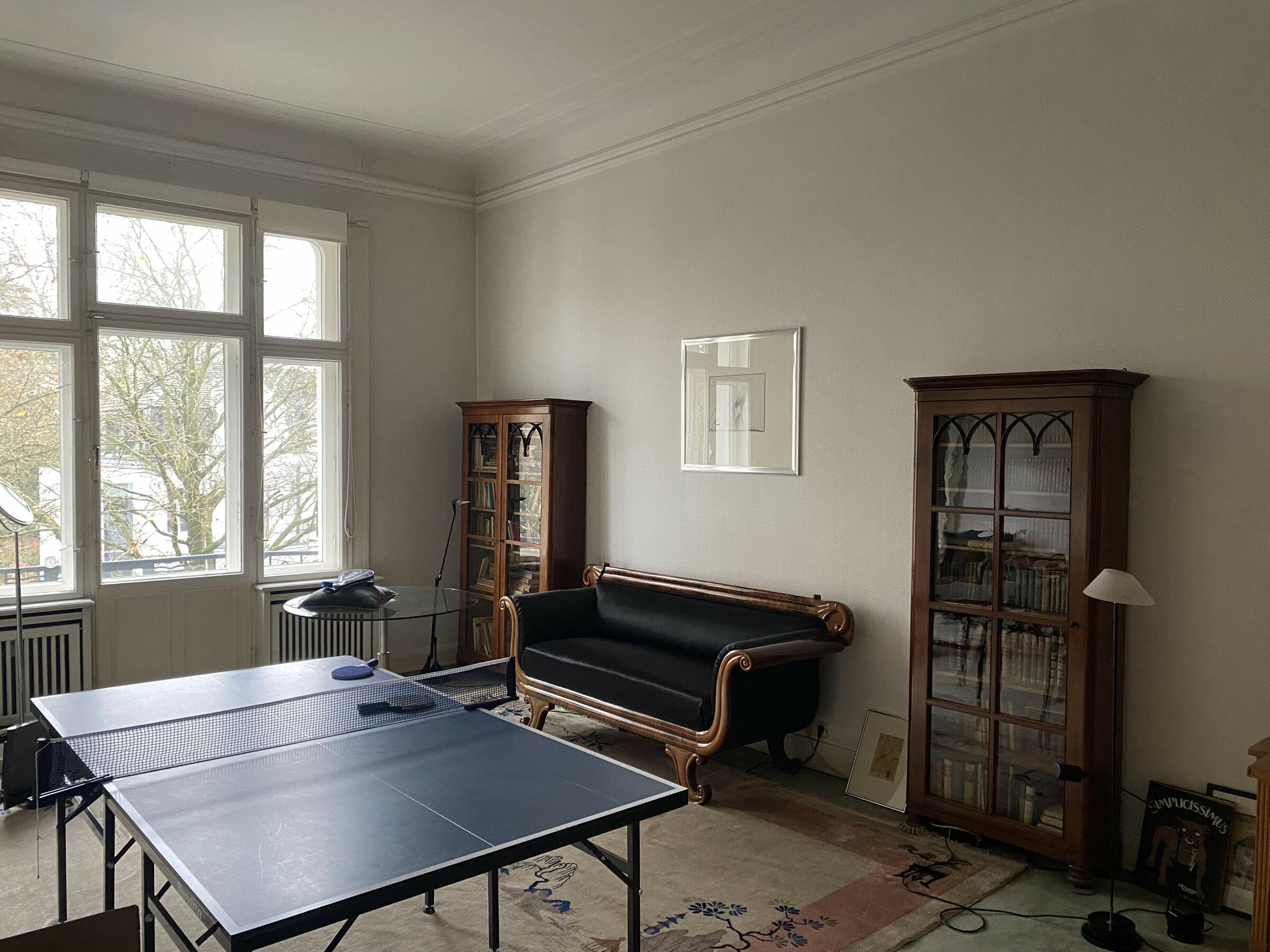 Meine Altbauwohnung befindet sich in einem Wohnhaus in Eppendorf an einer ruhigen Straße, nahe des Isebekkanals. Die Wohnung bietet für Altbauten typische große Räume mit hohen Decken. Die Räume sind minimalistisch und mit polierten Holzmöbeln eingerichtet. Hervorzuheben ist die Bibliothek mit ihren deckenhohen Bücherregalen an allen Wänden. Durch die großen Fenster fällt viel Tageslicht in die Wohnräume. Die Fenster können teilweise mit Rollos abgedunkelt werden. Die Räume dürfen nach Absprache umgestaltet werden. Öffentliche Parkplätze befinden sich an der Straße vor dem Haus.