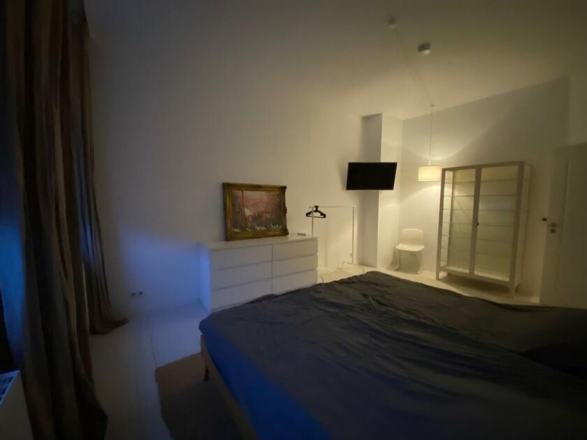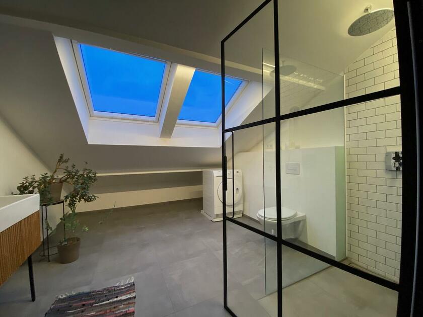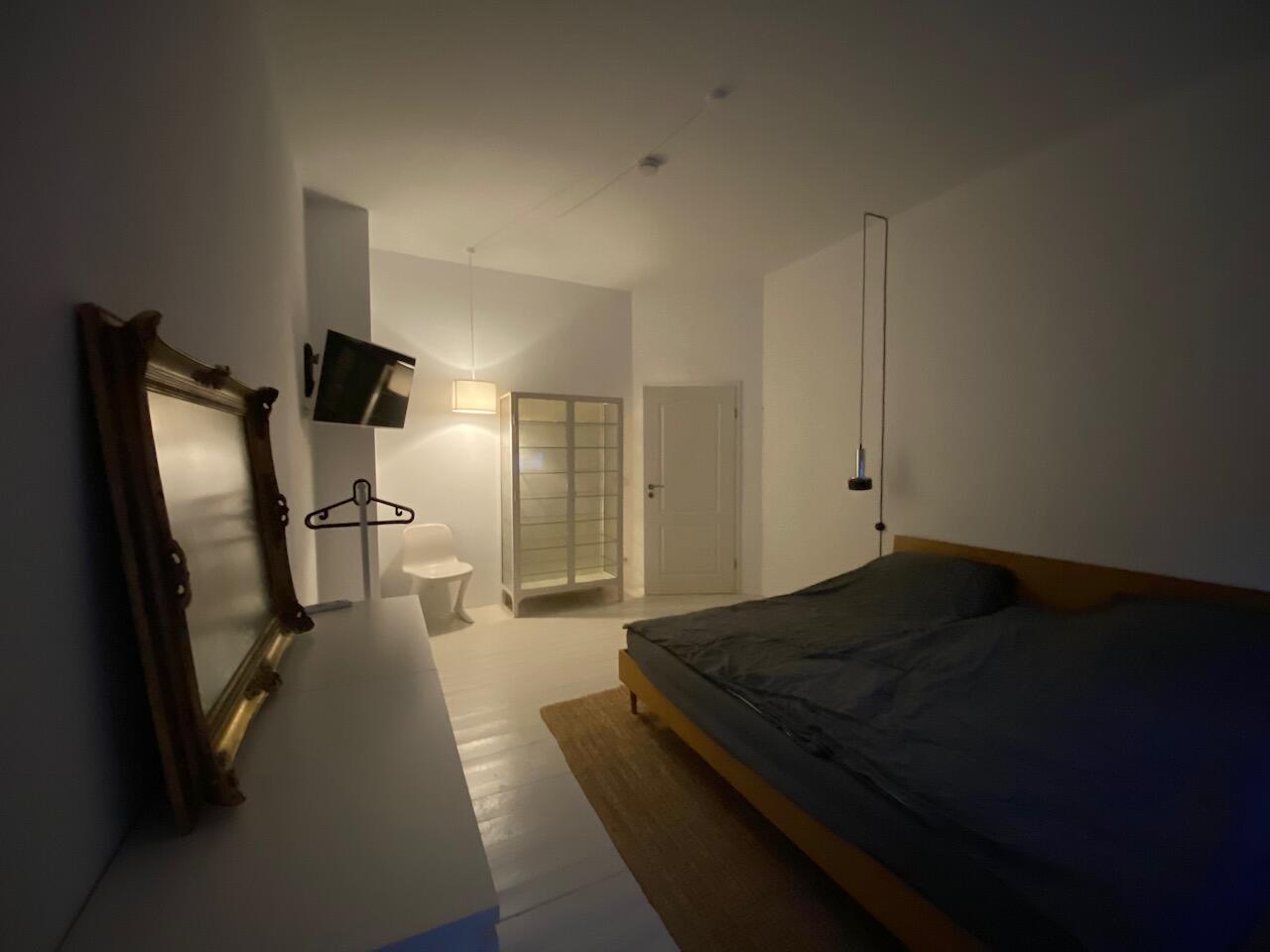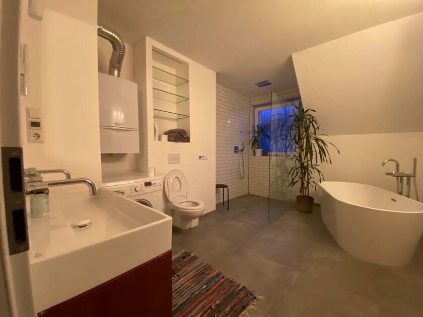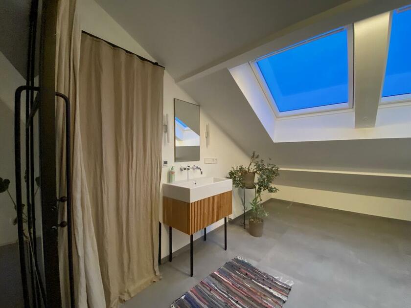 Die Schlafzimmer sind voll möbliert, mit Designklassikern ausgestattet und mit Jalousien und schweren Vorhängen komplett abdunkelbar. Das Bad ist modern und mit einer großen und bodengleichen Dusche und freistehender Design-Badewanne ausgestattet. Der Bodenbelag besteht aus grauen Steinfliesen, die Wände sind weiß gestrichen bzw. im Duschbereich mit weißen Metro-Fliesen gefliest.