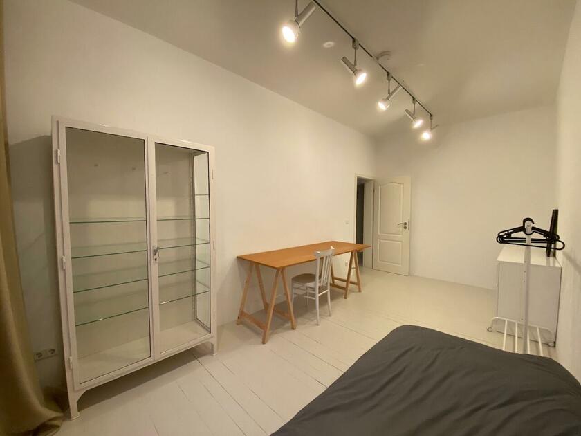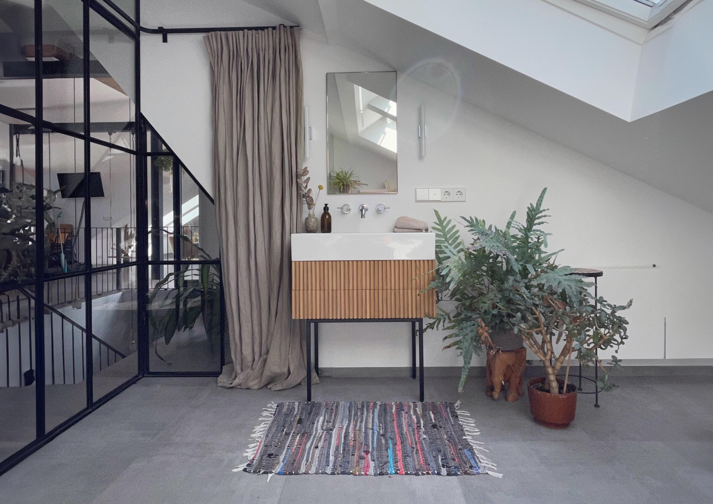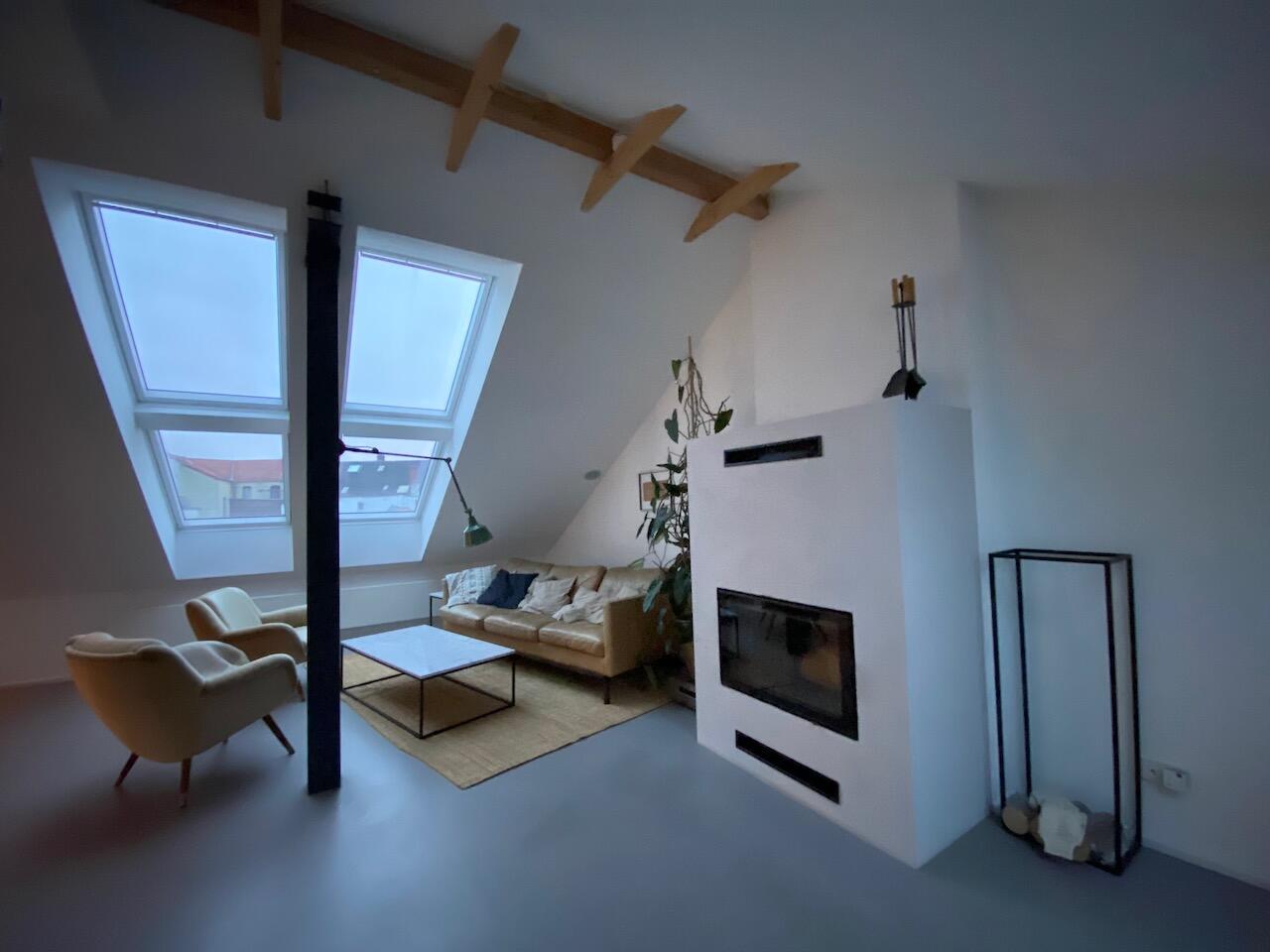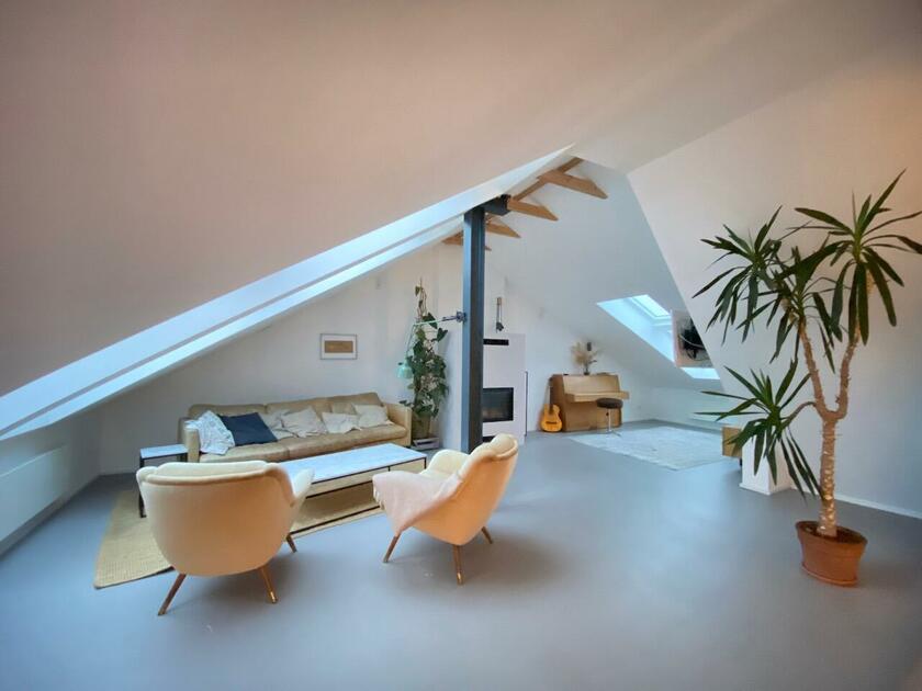 Die 209 m² große Maisonette-Wohnung befindet sich in der dritten Etage eines kernsanierten Altbaus ohne Aufzug. Im unteren Geschoss befinden sich drei möblierte Schlafzimmer sowie ein geräumiges Wannenbad. Der Look ist reduziert und modern. Weiß lackierte Altbaudielen vermitteln einen gemütlichen Altbaucharme.