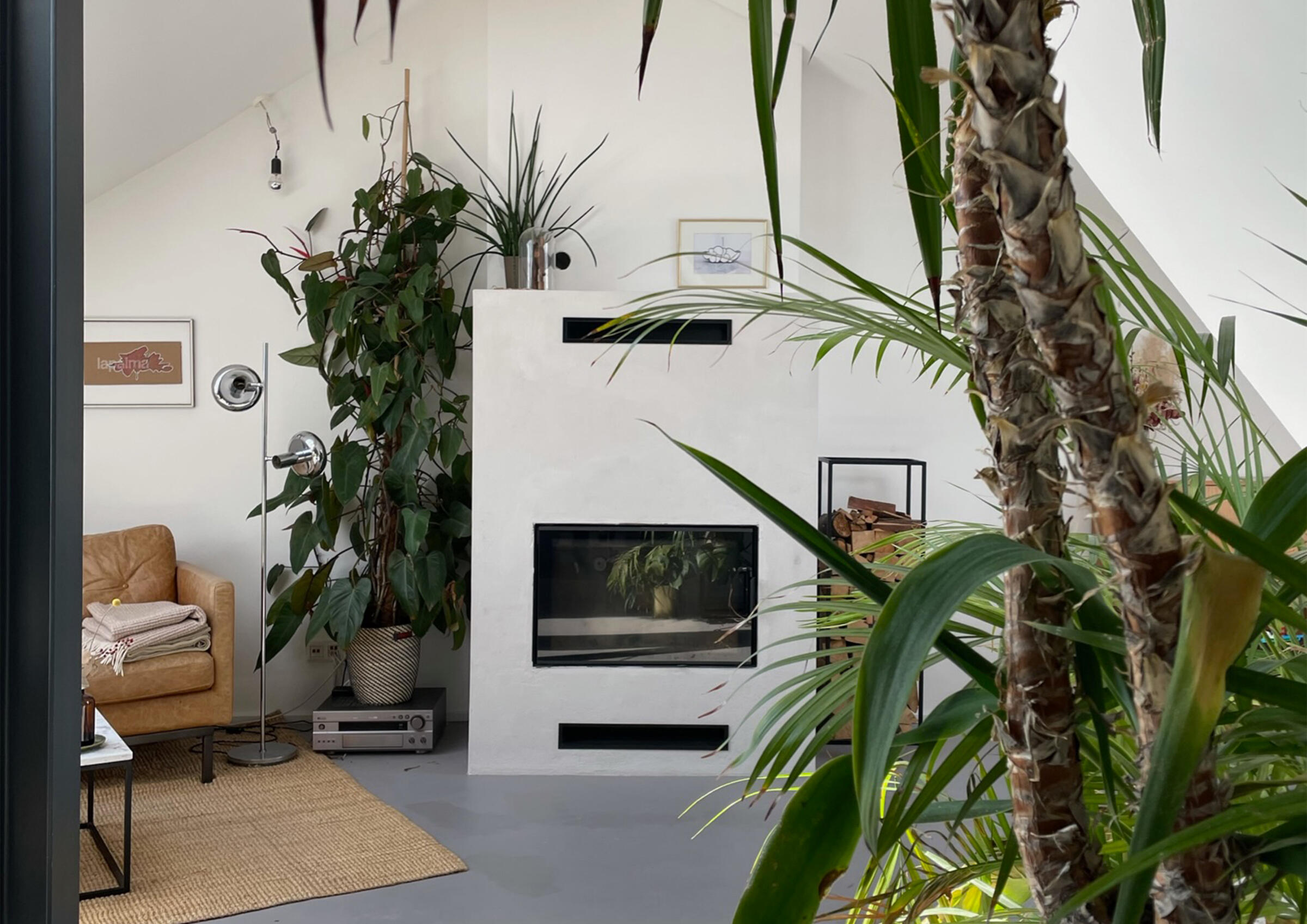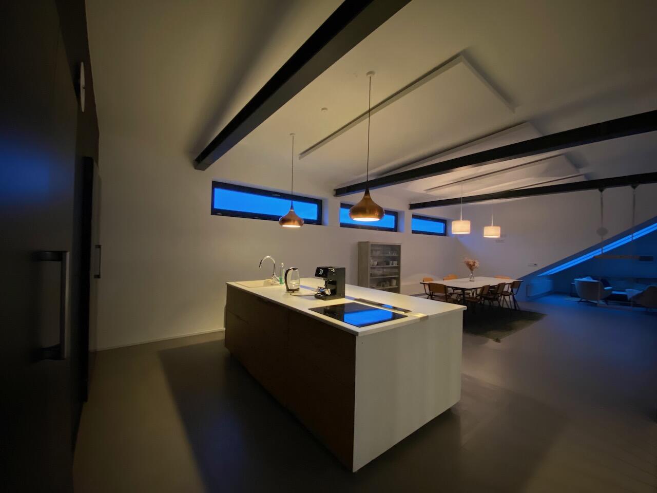 Im 64 Quadratmeter großen offenen Koch- und Essbereich befindet sich eine große, minimalistische Kücheninsel vor einer schwarz matt lackierten Wand mit eingelassenen Kühl- und Vorratsschränken. Illuminiert wird der Bereich durch zwei Designklassiker. Ferner steht in diesem Bereich ein großer moderner Esstisch, an dem 10 Personen Platz finden sowie eine Glasvitrine. Dahinter befindet sich das 43 m² große Kaminzimmer mit Dachschrägen. Das Mobiliar besteht aus einem Echtledersofa, einem Marmor/Stahl Tisch, einem minimalistischen Eichen-Sideboard, dem Mid-Century Klavier und einem großen Kamin. Das Bad ist mit einer großen, bodengleichen Dusche und modernem Waschtisch ausgestattet. Der Bodenbelag besteht aus grauen Steinfliesen, die Wände sind weiß gestrichen bzw. im Duschbereich mit weißen Metro-Fliesen gefliest. Das Bad ist durch eine komplett zu öffnende und durch Vorhänge abzutrennende Glas-Stahl Trennwand mit Rest des Obergeschosses verbunden.