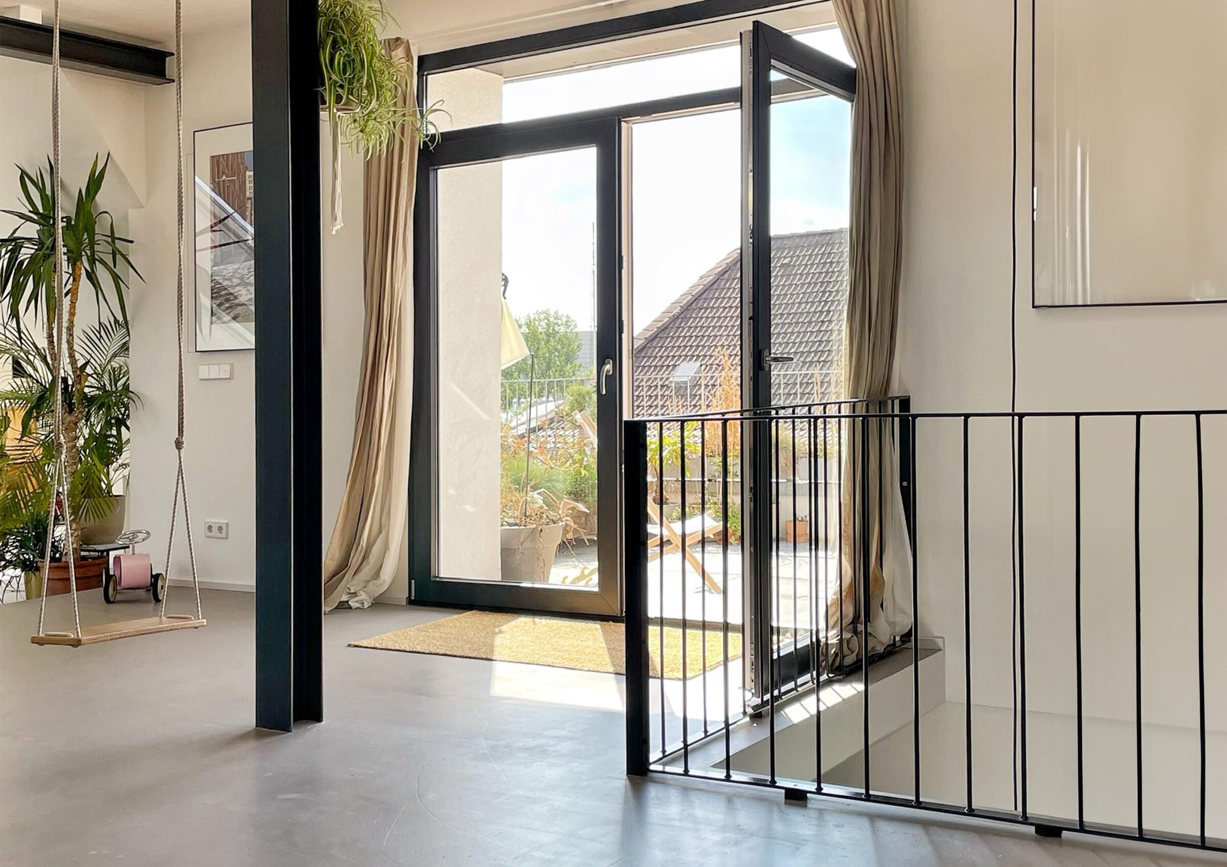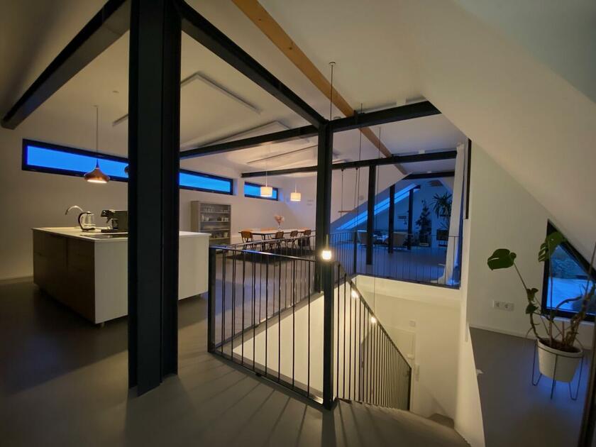 Durch die imposante Galerie mit 7 m Deckenhöhe gelangt man über die zementierte Treppe in das obere Geschoss. Dieser Bereich ist komplett offen gestaltet. Der Look ist minimalistisch und modern. Lackierter Estrich, sichtbare Stahlträger und die Glas-Stahl Trennwand zum Bad vermitteln einen Industrieellen Charme.