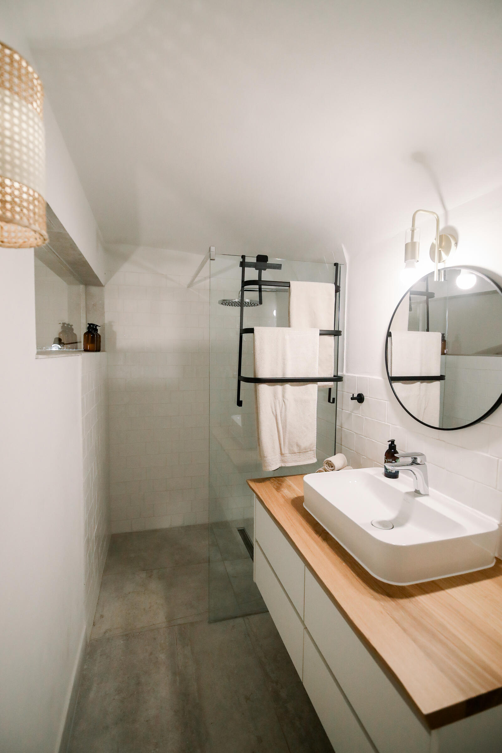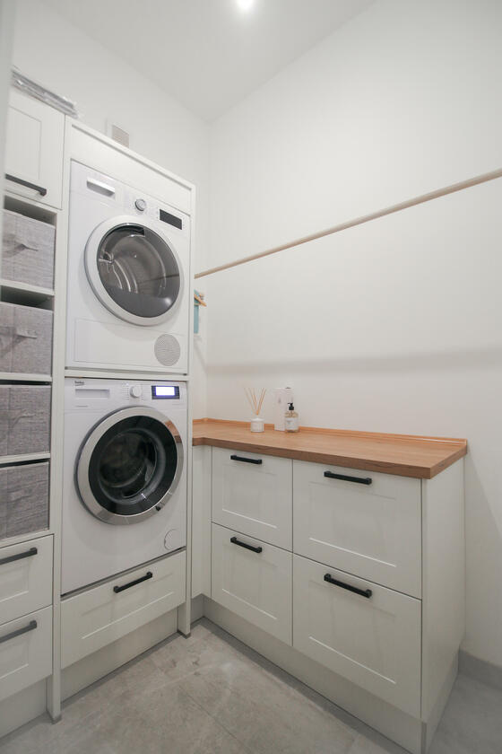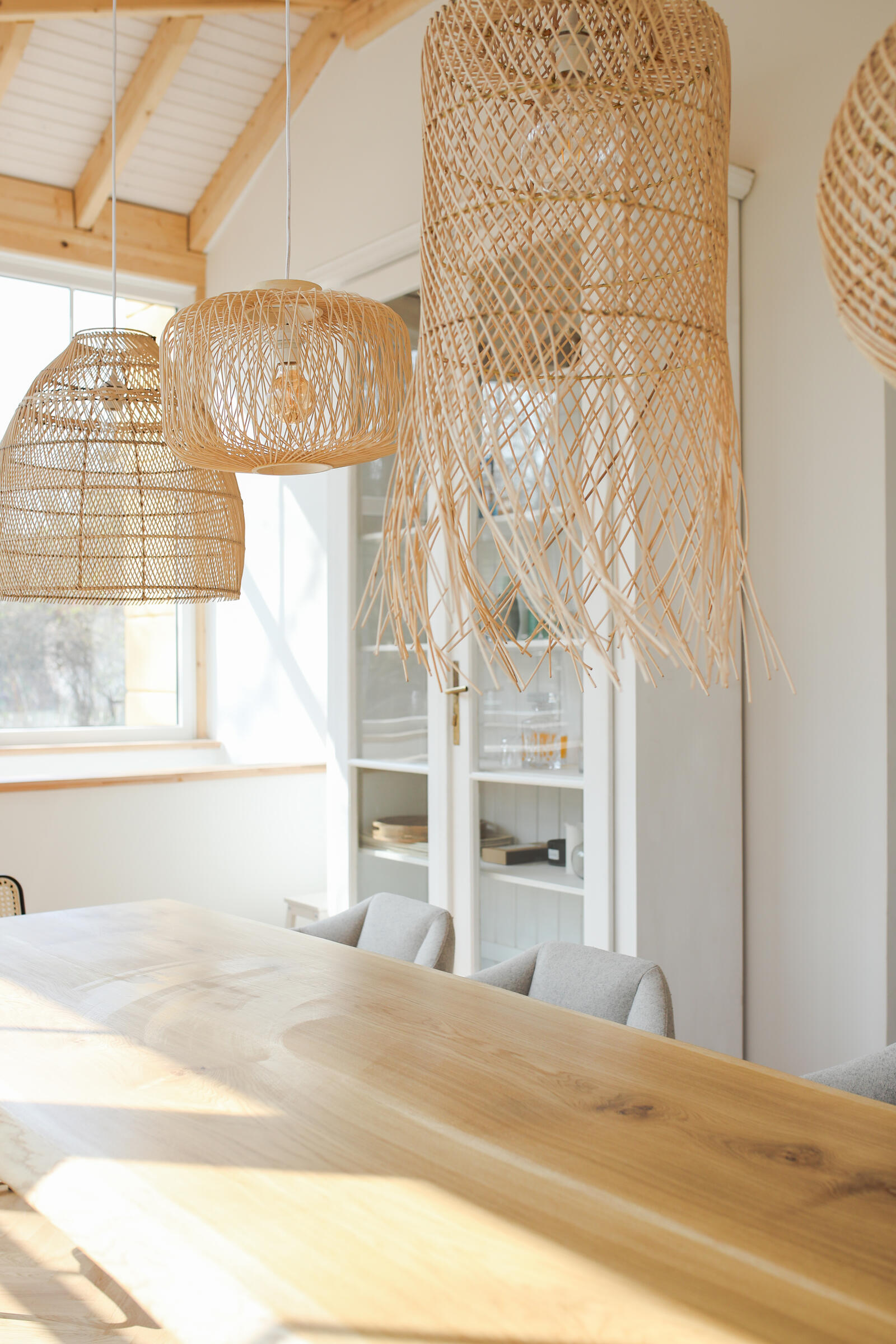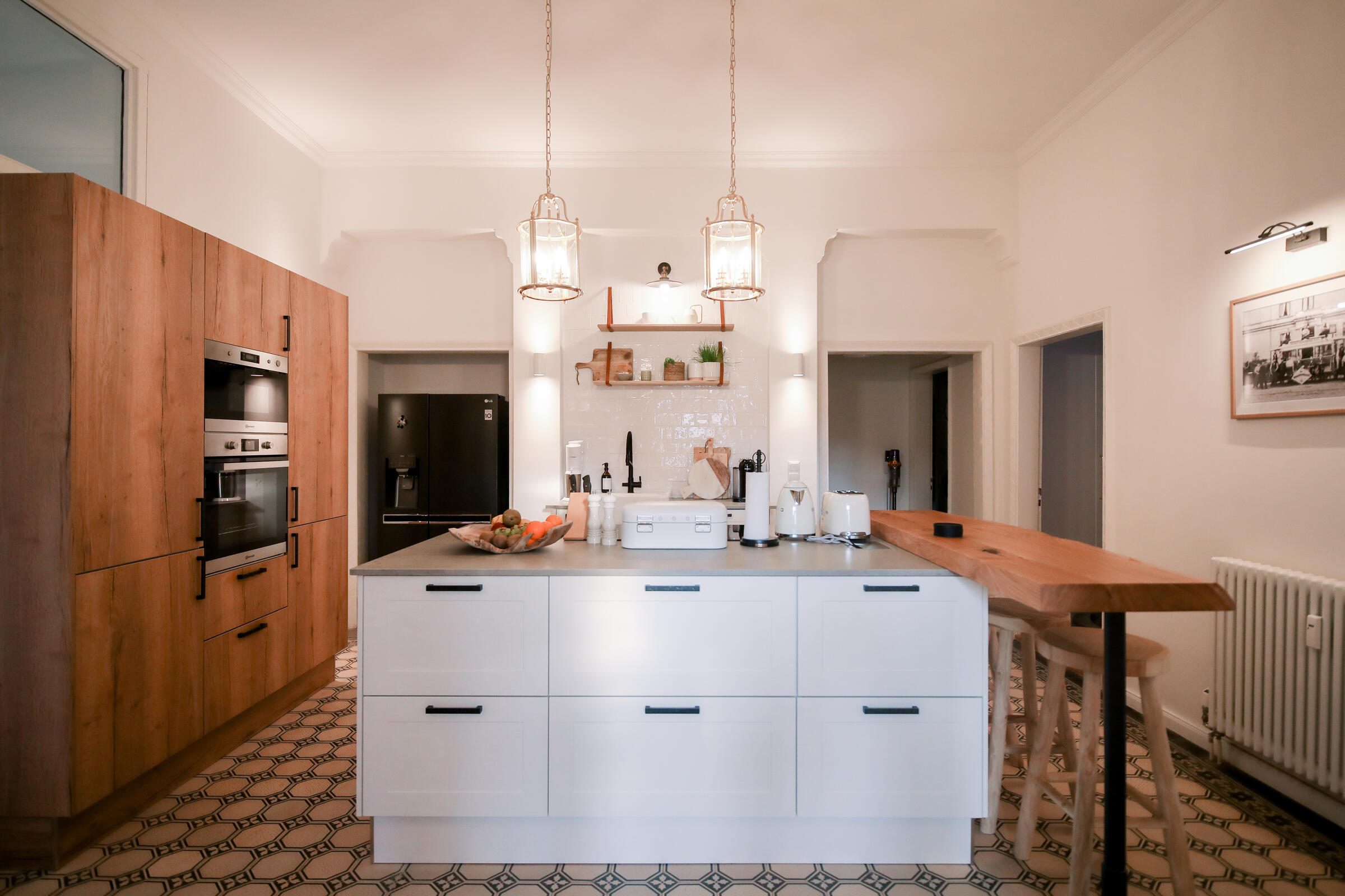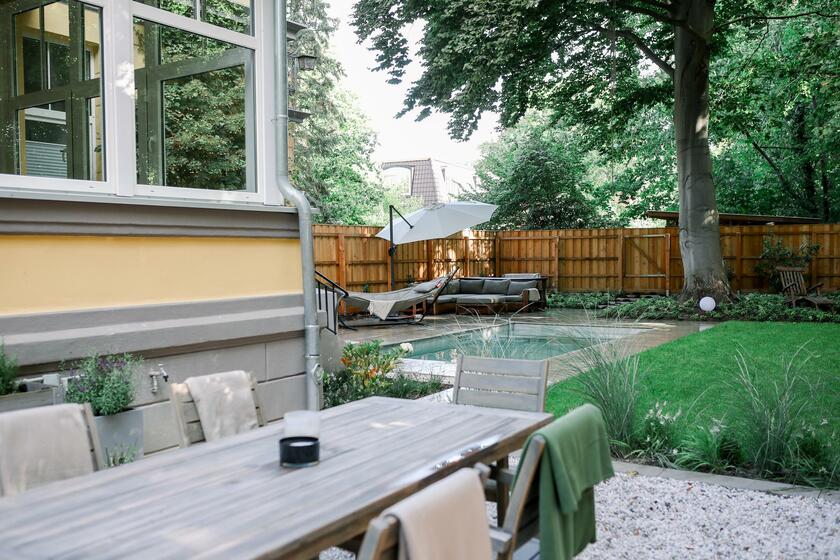 Die Wohnung ist in hellen und natürlichen Farben gestaltet. Sie wurde sehr hochwertig ausgebaut und ausgestattet. Es gibt drei Schlafzimmer, drei Bäder, ein Wohnzimmer, ein Esszimmer (im Wintergarten), eine Wohnküche, einen Archivraum und Garten mit Pool. Alle Räume sind mit Eichenparkett oder Zement-Fliesen ausgestattet. In den Bädern wurden Armaturen von Dornbracht und Villeroy und Boch installiert. Die hochwertige Einbauküche von Küchen Staude bildet den Eingangsbereich und enthält alle gängigen Annehmlichkeiten inklusive BORA Kochfeld und einem freistehenden Side-by-Side Kühlschrank. Durch das im Mid-Century-Stil gestaltete Wohnzimmer samt Kamin gelangt man in den Wintergarten. Dieser dient als Esszimmer, welches von einem großzügigen und hochwertigen Eichen-Esstisch von 3,30 m Länge dominiert wird. Hier gibt es 8 Sitzplätze aus Designerstühlen. Ein weißes Vintage-Klavier und ein Vintage Buffetschrank aus den Niederlanden befinden sich ebenfalls in diesem sonnendurchfluteten Raum. Die Deckenhöhe hier beträgt bis zu 5,00 m. Ein Highlight ist der 2022 neu gestaltete Garten samt Pool (ca. 3 x 6m).